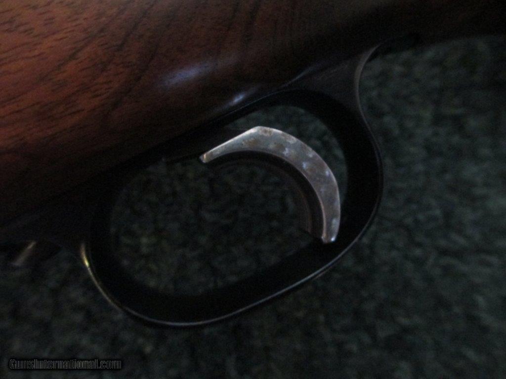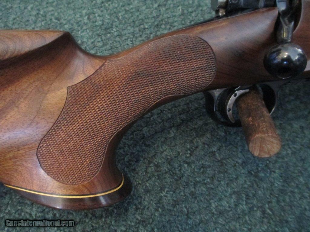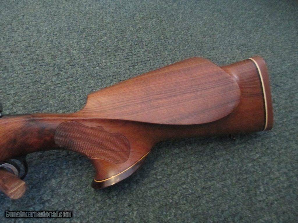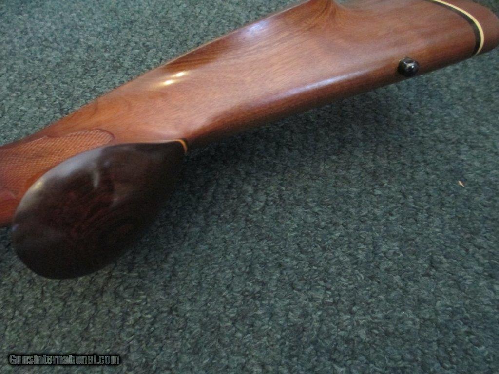 Description: Winchester, Mdl 70 Pre 64 .243, Leupold 2 piece base, jeweled bolt, 26" barrel, beaver tail forend with checkering, tear drop rosewood pistol grip cap, forend rosewood, roll over cheek piece, 13 1/4" length of pull, brown basket weave 3/4" Pachmayr pad, trigger shoe, sling swivel studs, 97% overall condition SOLD |