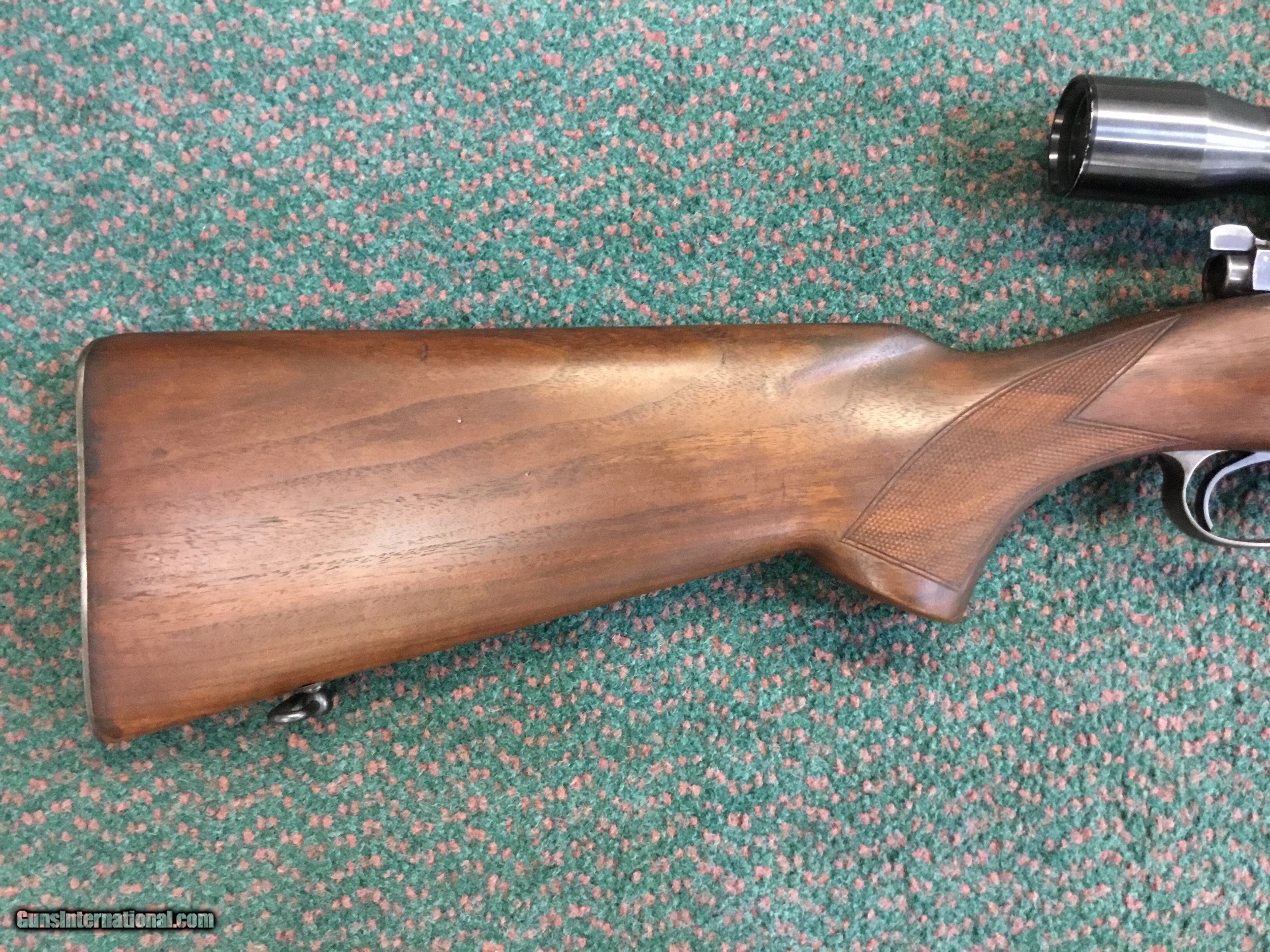 Description: Winchester model 70, 22 Hornet, 24” factory barrel with good bore, factory metal spur butt plate, Weaver T-20 scope, weaver bases and rings. Rifle is in excellent condition, some minor bluing wear from handling. Wood is very good, a few dings and scratches, but all minor. Overall , a very nice example of a model 70 in rare 22 hornet that has been taken care of through the years. This one is a 33k serial number, a pre war rifle. SOLD |