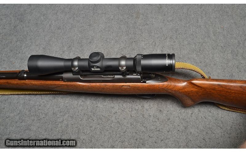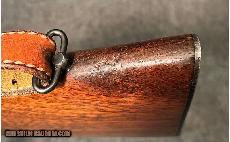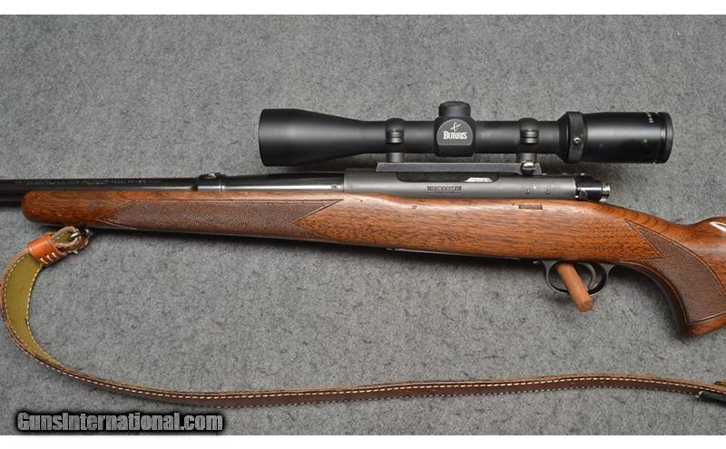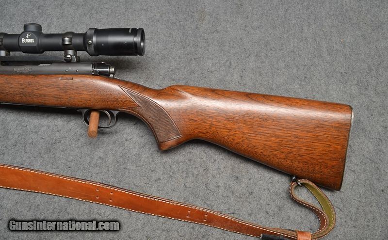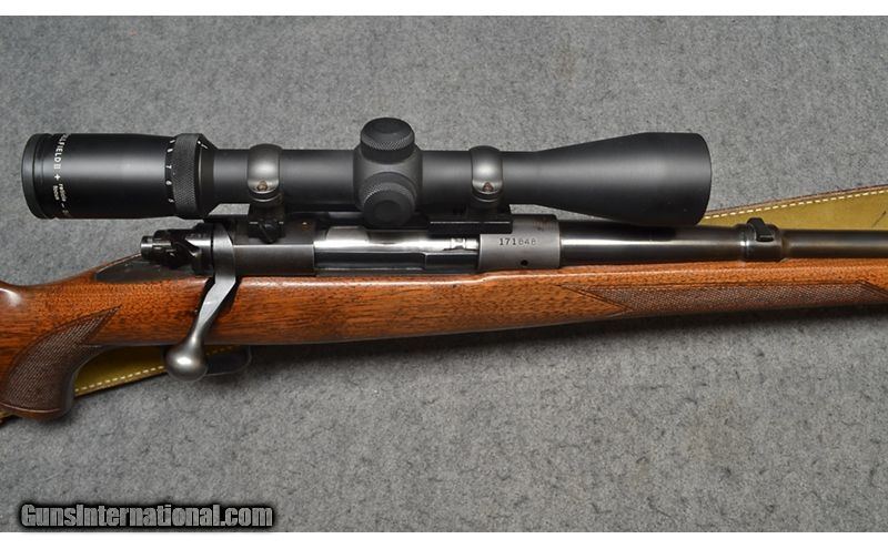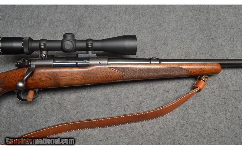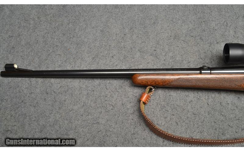 Description: This venerable bolt action rifle is a Winchester Model 70 (1950) chambered in .270 Winchester. It has a leather sling, a steel butt plate, diamond checkered forearm and pistol grip, and a hooded ramp mounted blade front sight. The furniture is in good condition with much of the high gloss finish intact. It shows a number of handling marks, including a dent to the left side of the stock and a number of mars to the upper and lower portions of the furniture. It is missing the factory rear sight, but it does come with a Burris 3X - 9X Fullfield II scope. .270 Winchester SOLD Curio/Relic: Yes Metal Condition: "Bluing is in overall very good condition, with some loss noticeable at the muzzle and sharp edges Wood Condition: "It shows a number of handling marks, including a dent to the left side of the stock and a number of mars to the upper and lower portions of the furniture. Bore Condition: "Bright and shiny bore, with crisp rifling intact. Barrels: 24 inch barrel Stock Dimensions: "13½ LOP, 44½ overall length Fore End: Checkered wood forearm Butt Pad: Checkered steel butt plate Weight: 9 lb - 6 oz Sights: "Hooded blade front sight, no rear sight. Burris 3X - 9X Fullfield II scope Item Location: Wichita, KS |