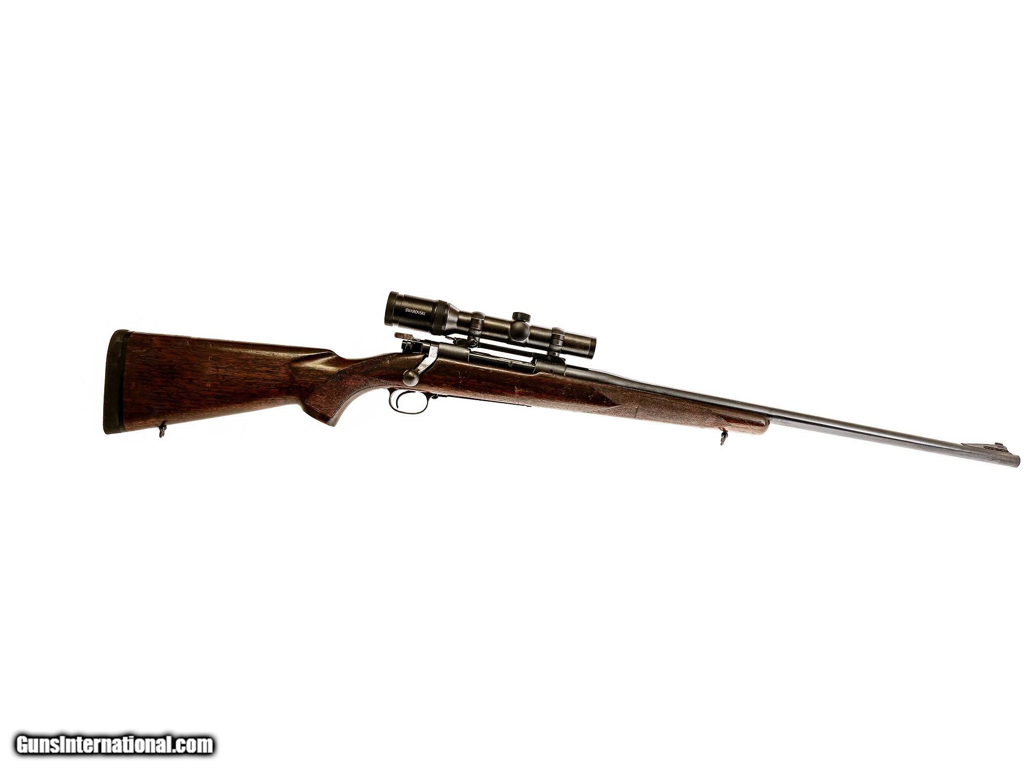 Description: Winchester - Model 70, .375 H&H Magnum. 25" Barrel. Pistol grip stock, claw extractor, 1941 production, Decelerator recoil pad, fitted with Swarovski 4-24 Scope, gun remains in good overall condition with regular handling marks from hunting, excellent example of a .375 H&H Model 70, available for immediate delivery. Inv: 62613 9 lbs. 14 oz. 13 3/4" LOP $1,999.00 SOLD |