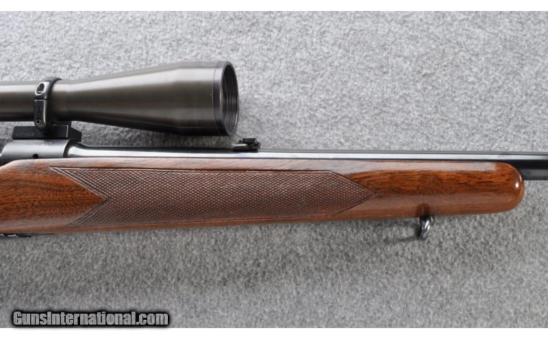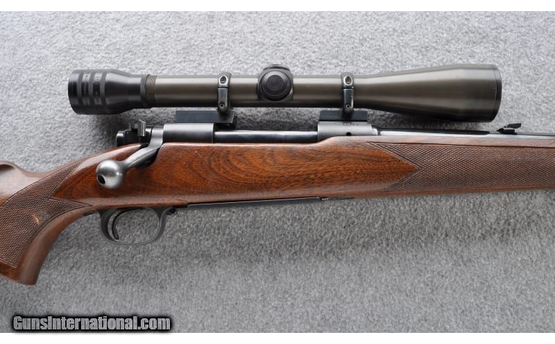 Description: Made in 1957. .243 Winchester SOLD Chambers: .243 Winchester in a five round box magazine bolt action rifle Metal Condition: "Good, showing use wear at the butt plate, muzzle, floor plate and bolt handle Wood Condition: "Good, Shows scattered field marks and gouge in the checkered field of the right wrist and flattened area on the left side. Possible refinish at some point. Bore Condition: Bright with crisp rifling Barrels: 22" Tapered Triggers: Single Stock Dimensions: 13 1/2" LOP Fore End: Checkered walnut with sling swivel Butt Pad: Checkered aluminum Weight: 8 LBS Sights: "Hooded blade front, folding leaf rear and a Kollmorgen 6X Bear Cub Scope in vintage Leupold mount and rings Item Location: Grand Junction, CO |