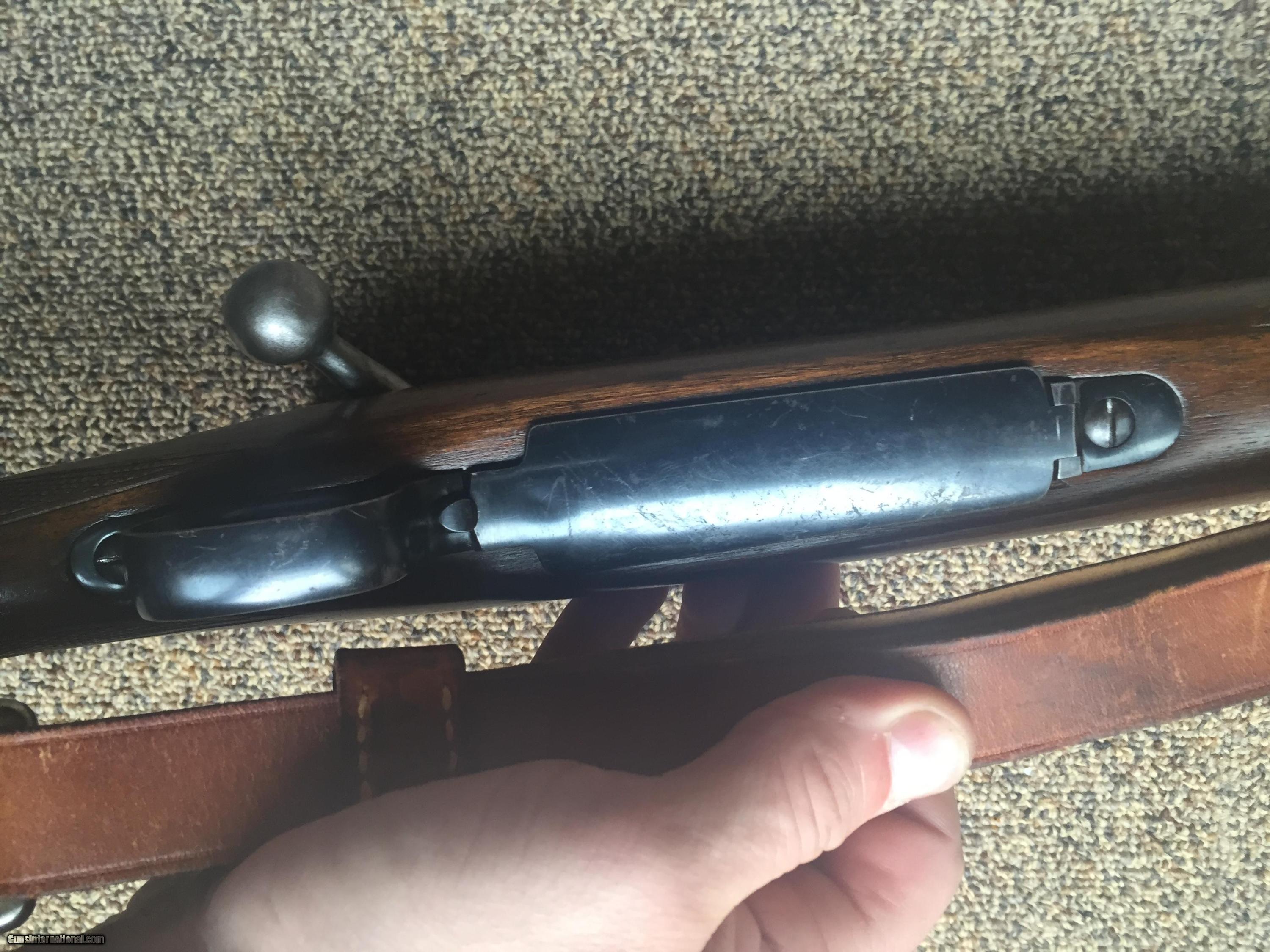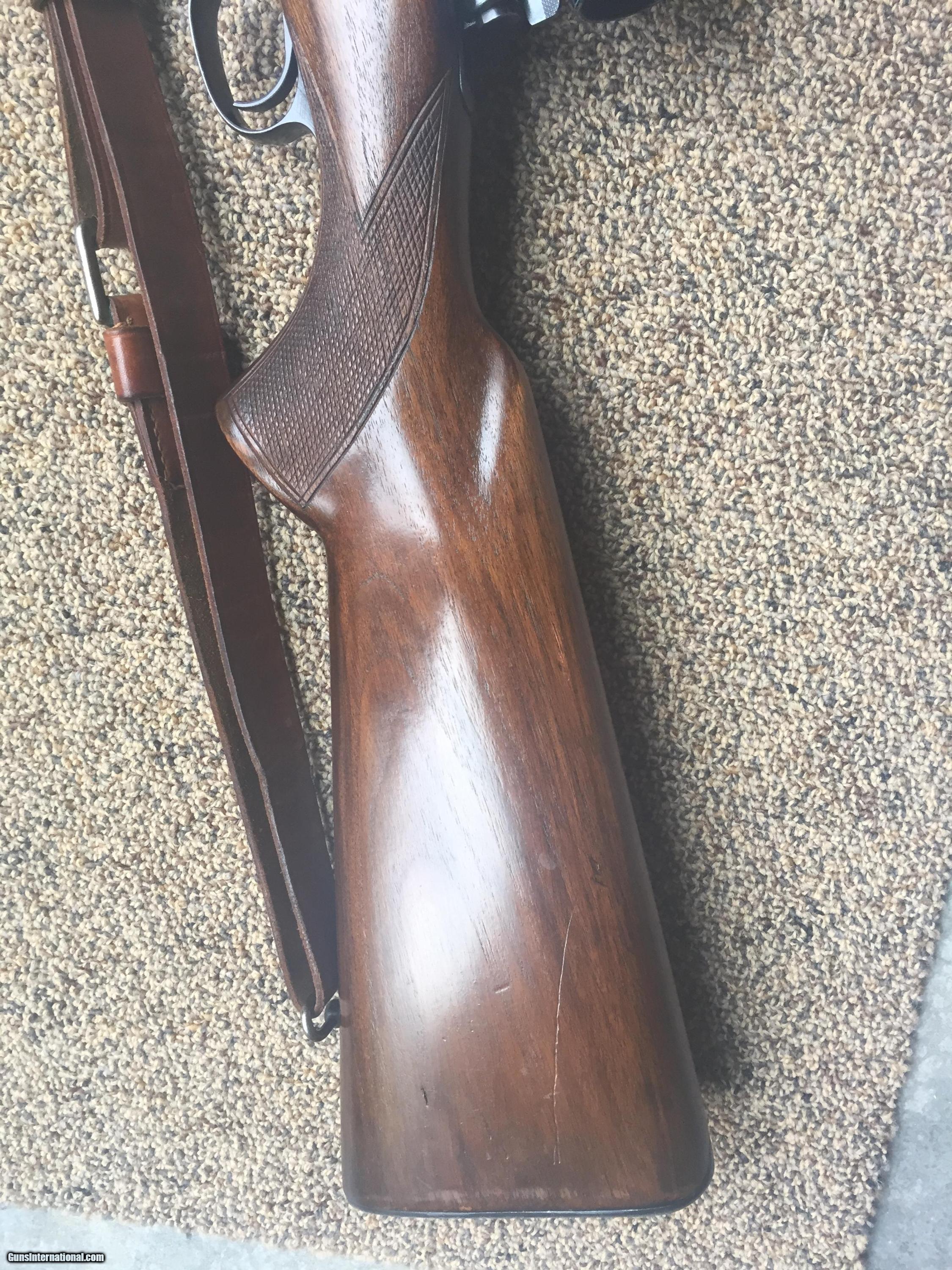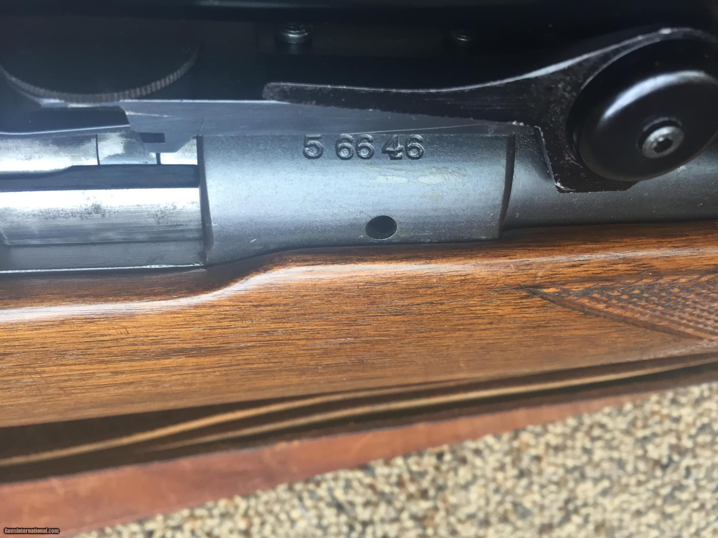 Description: Winchester Model 70 in .220 Swift. 1945 Manufacture, between "pre-war" and "Transition". Front Sight Base an integral part of the barrel like a "Carbine", but it has the 26 inch barrel. Front Hood missing, rear iron sight not on the rifle, but comes with it, due to the scope mounts. Honestly used, stocks are slightly dinged and scratched from use, finish still good, and bore excellent. Period Stith Mount and Stith "Master" Scope included, good clear optics with thick crosshairs. Stith mounts use the rear screw holes on the left side of the reciever and the front two holes, requiring no additional drilling. There are no holes drilled in the rear of the receiver. Please see photos for condition. A great collectable rifle. If paying with a credit card or PayPal, an additional 3% fee will be added. Insured Shipping $75. SOLD Manufacturer: Winchester Model: 70 Serial Number: 56646 Caliber Info: .220 Swift |