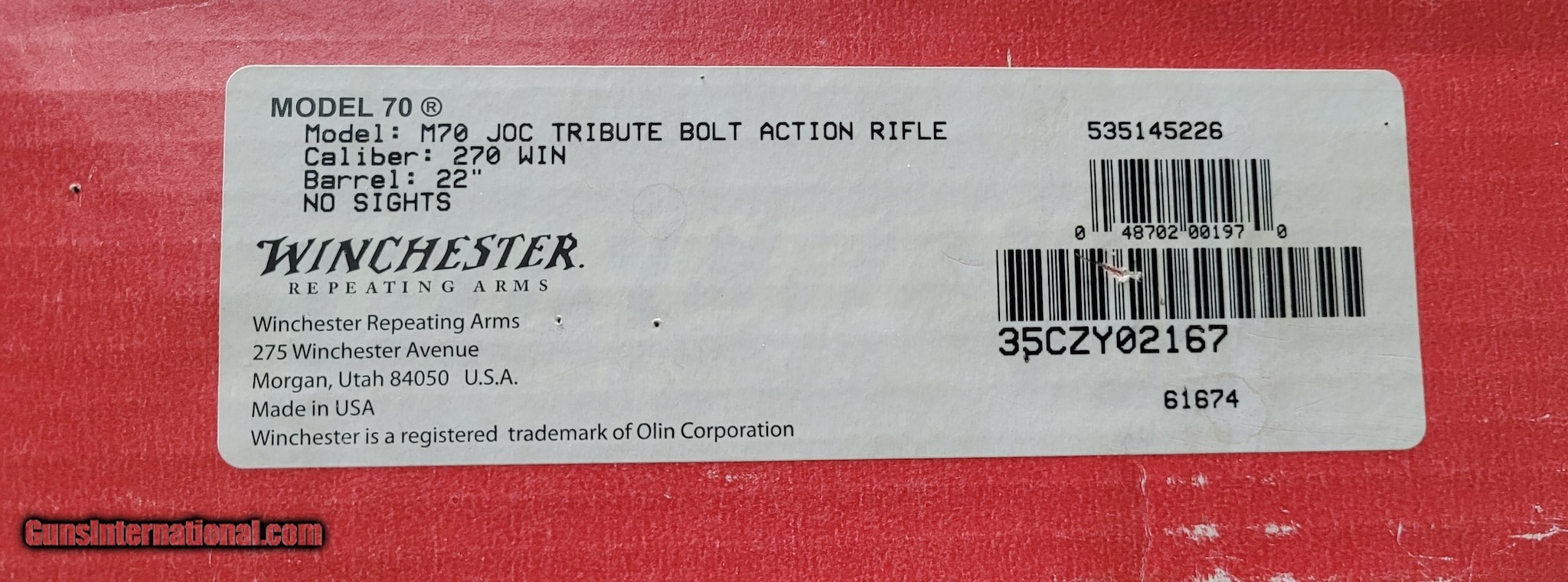 Description: Guns Listing ID: 645361 Built on a pre-64 style controlled round feed action with the long Mauser style extractor and a tapered featherweight barrel manufactured without sights. The top of the receiver is factory drilled and tapped for scope bases. Mounted on a fleur-de-lis checkered pistol grip stock with a contrasting wood forend cap, engraved blue steel grip cap and floor plate, inset sling swivel eyes, and a rubber recoil pad. The rifle was designed as a tribute to noted outdoorsman, hunter, conservationist, and writer Jack O‚‚Connor perhaps best known for his time as the shooting editor for \"Outdoor Life\" magazine. The rifle is chambered in .270 Winchester, Mr. O‚‚Connor‚‚s favorite caliber. The floor plate is engraved with a bust of a bighorn sheep surrounded by oak leaf and acorn scroll, and the trigger guard features a silver inlaid reproduction of O‚‚Connor‚‚s signature. (Included is the original Winchester box, papers, and Leupold 30mm rings with mounts.) Rating Definition: Near new, with only the slightest handling marks. Mechanically excel SOLD Curio/Relic: Yes Manufacturer: WINCHESTER Model: MODEL 70 JACK O‚‚CONNER TRIBUT Caliber Info: 270 WIN Condition: Used - Non-Certified Barrels: 22 BARREL Finish: WALNUT BLUE |