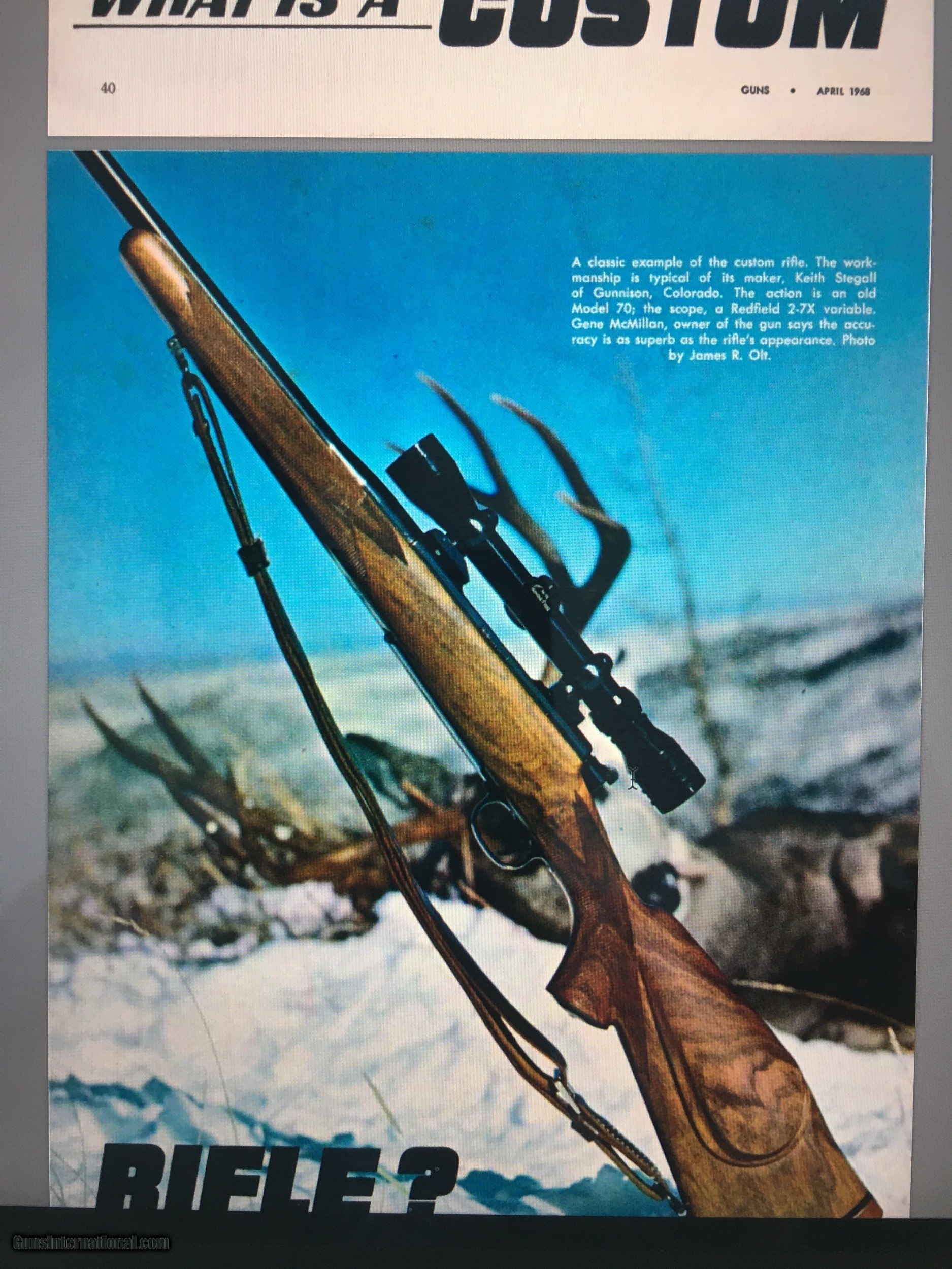 Description: Superb Keith Stegall built Wildcat 25/270. Keith was perhaps Jack O'Conners favorite gunsmith. Gun dates 1950 , Gunsmithing by Keith was said to be done in 1964. Heavy Wildcat 24" barrel said to dead on at 1/2 a mile, Rare 25-270 marked K. Stegall. Lyman period correct 10x scope with weaver rings. Fantastic Tiger Stripe stock with his signature steel grip cap. A real piece of Winchester history. Very slight small freckling by the serial number and a tiny mar shown about midway on the outside of the barrel , Real nice bore and wood with even matched tiger at all angles and the famous Stegall hand carved check piece Pictures show real well but much better in person. The precision work on the bolt is superior , Fully adjustable trigger, All work by Keith Stegall. This is a more than fair Buy it now price for a collectable that you can hunt with. If you need to to text or talk I'm around from from 8AM till 9 PM EST- seven days. A good check or Venmo is fine, She will ship overpacked, fully insured and Priority to your FFL or C&R for $55 SOLD Curio/Relic: Yes Manufacturer: Winchester Model: 70 Serial Number: 131946 Barrel Length: 24 Condition: excellent Metal Condition: Very good Wood Condition: Very good Bore Condition: Very Good Action: Bolt Triggers: adjustable Stock: Tiger |