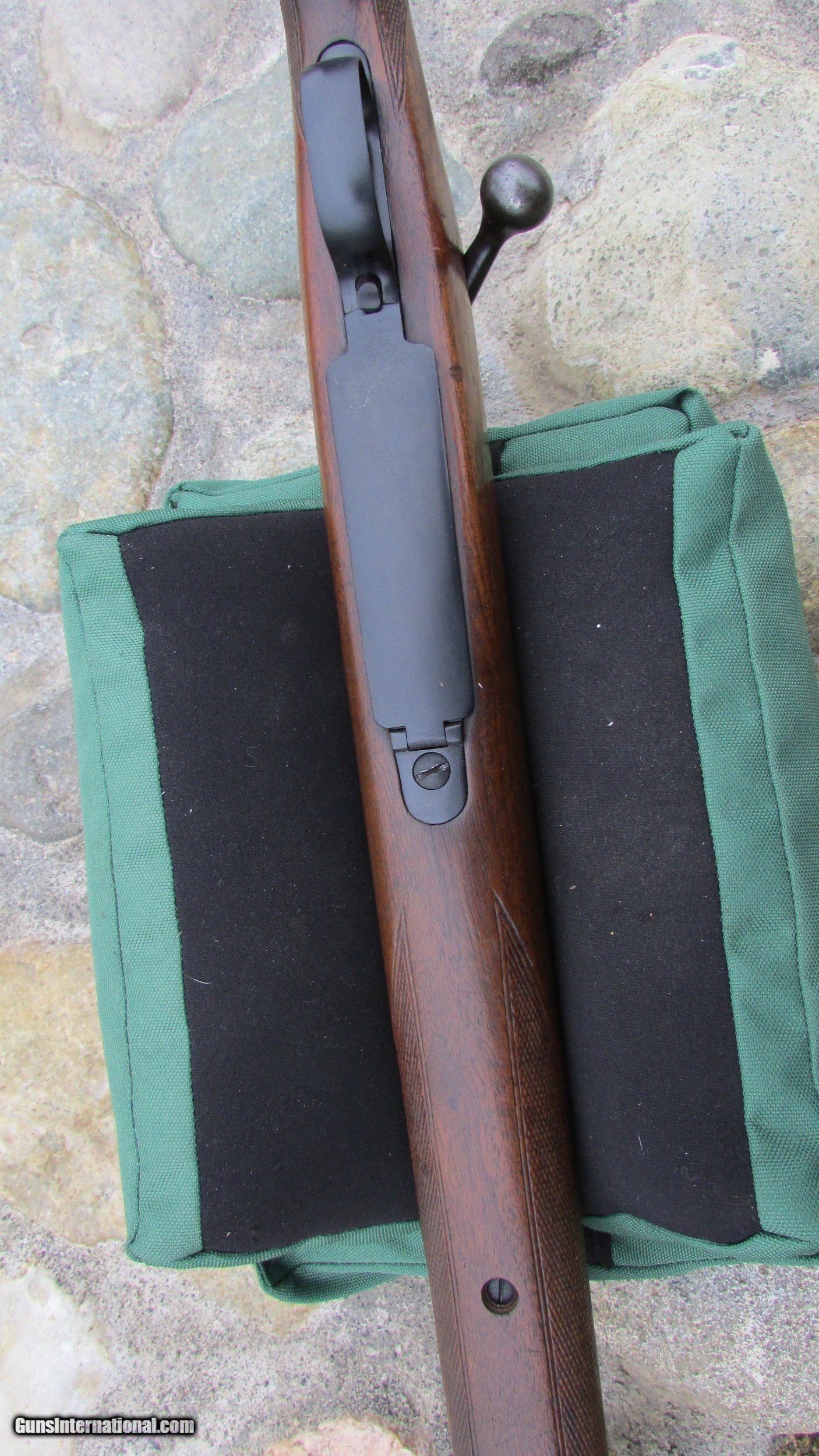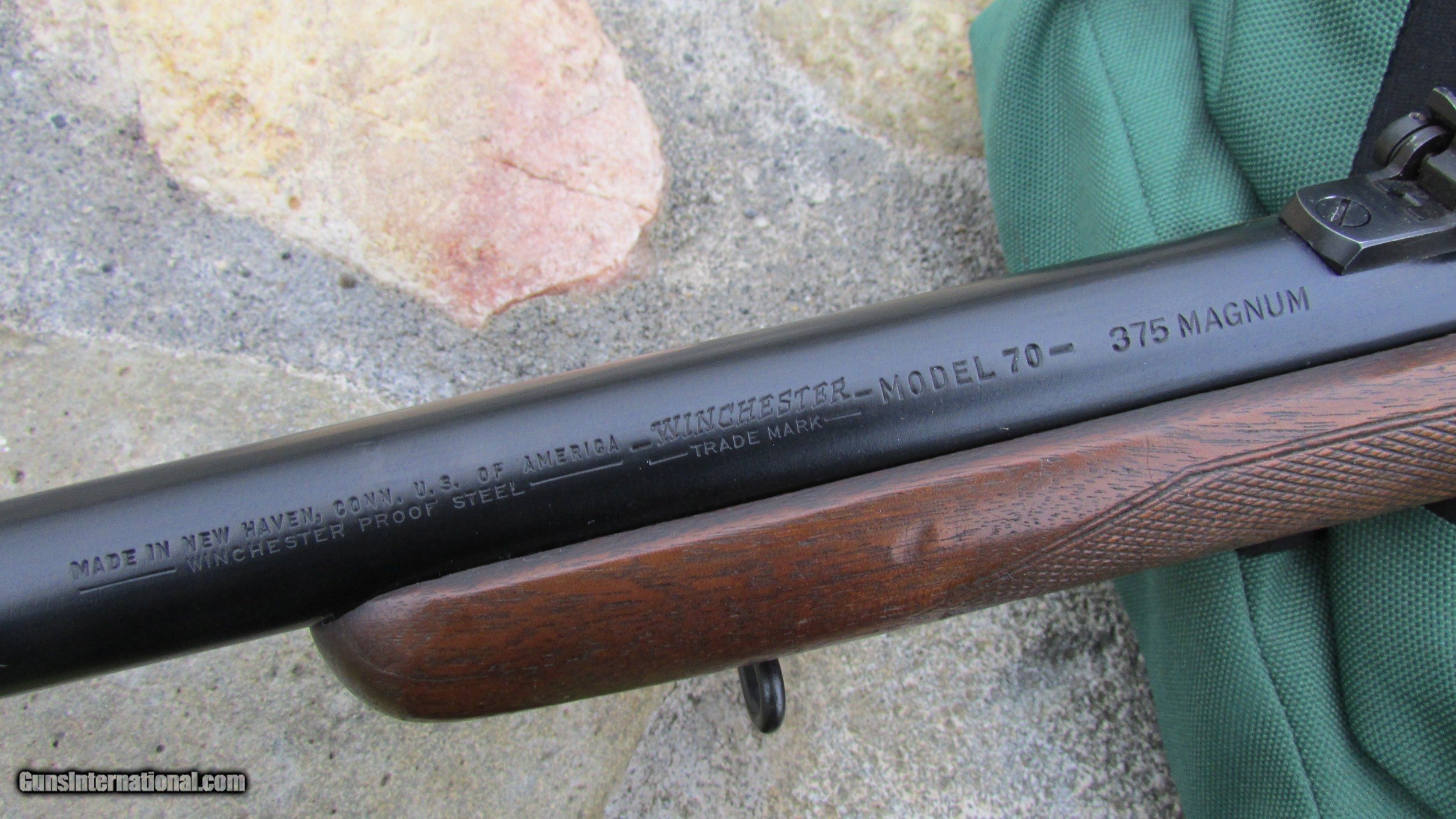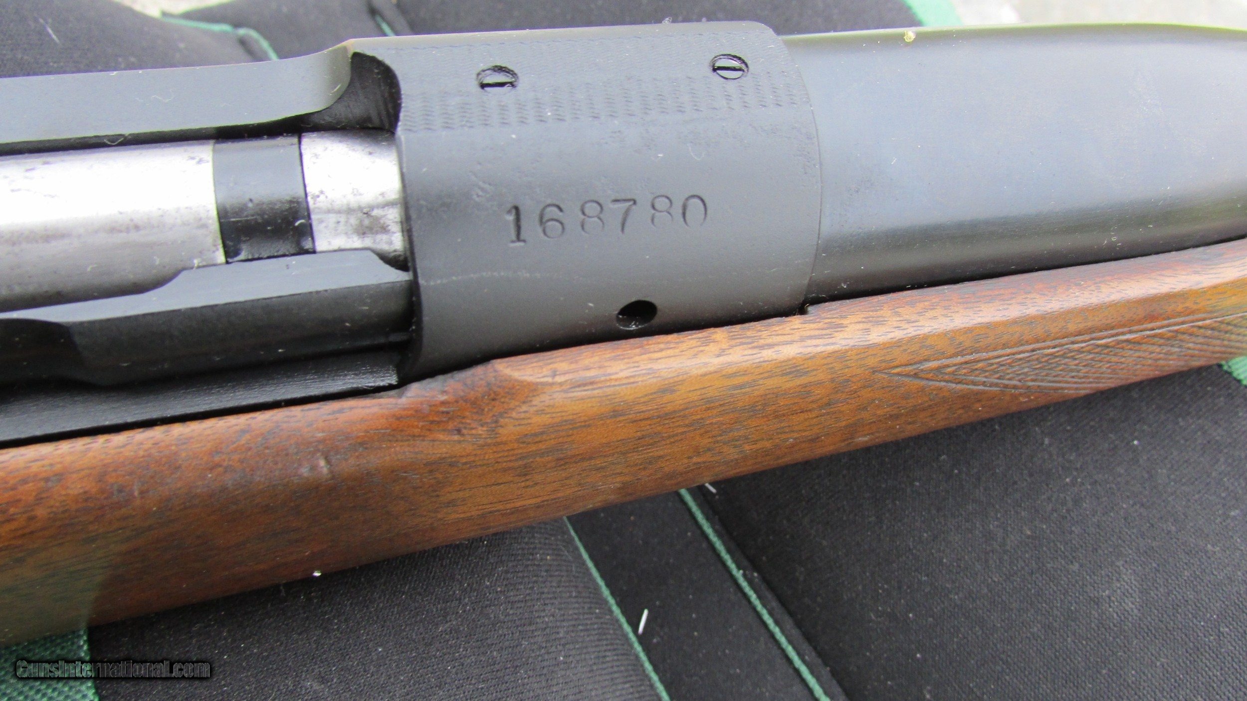 Description: Nice Winchester model 70 pre-64 375 Magnum, made in 1949. Rear bridge has not been tapped. Normal wear from use and age. Metal is nice, has been re-blued. Stock shows finish loss, smooth checkering, recoil pad is still flexable and soft with some wear. Stock has some nicks and dings from use and age. Minor hair line cracked back by tang. Stock shows sign of peep sight install. Still a good solid piece of Winchester Walnut. Winchester Logo and Trade Mark are easily read. Winchester roll stamping is clear and easily read. Bore is strong with well defined lands and grooves. Has not been crowned. Make a great shooter on your next Afican adventure. . $100.00 shipping to lower 48. Will be shipped in plastic case. SOLD Curio/Relic: Yes Manufacturer: Winchester Model: 70 pre-64 Serial Number: 168780 Caliber Info: 375 Magnum Bore: strong with well defined lands and grooves Condition: good Metal Condition: very good minor bluing loss Wood Condition: Good with minor nicks, dings, compression marks from use and age Bore Condition: strong lands and grooves Barrels: 25 Barrel Type: steel Action: bolt Triggers: standard Stock: walnut Stock Dimensions: 32 1/4" with Winchester recoil pad Stock Comb: straight Stock Heel: rubber Butt Pad: rubber LOP: 14 Finish: factory Weight: 9 Sights: Winchester 70 B Roll Over Manufacture Date: 1949 Item Location: Oregon |