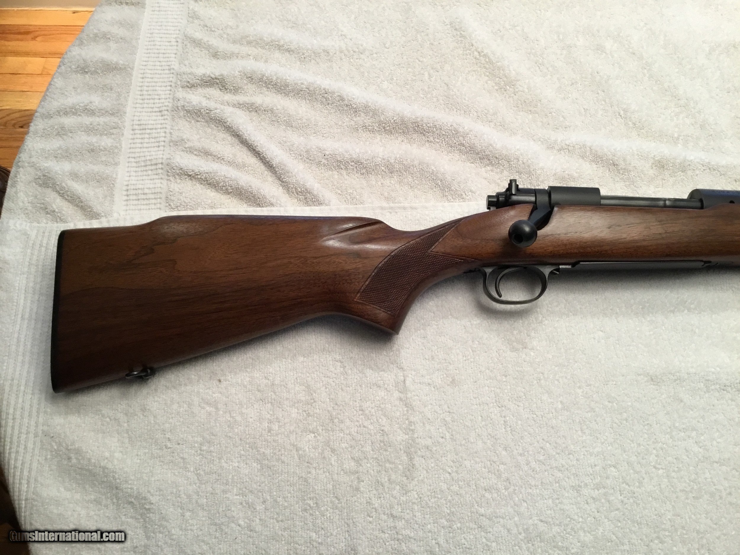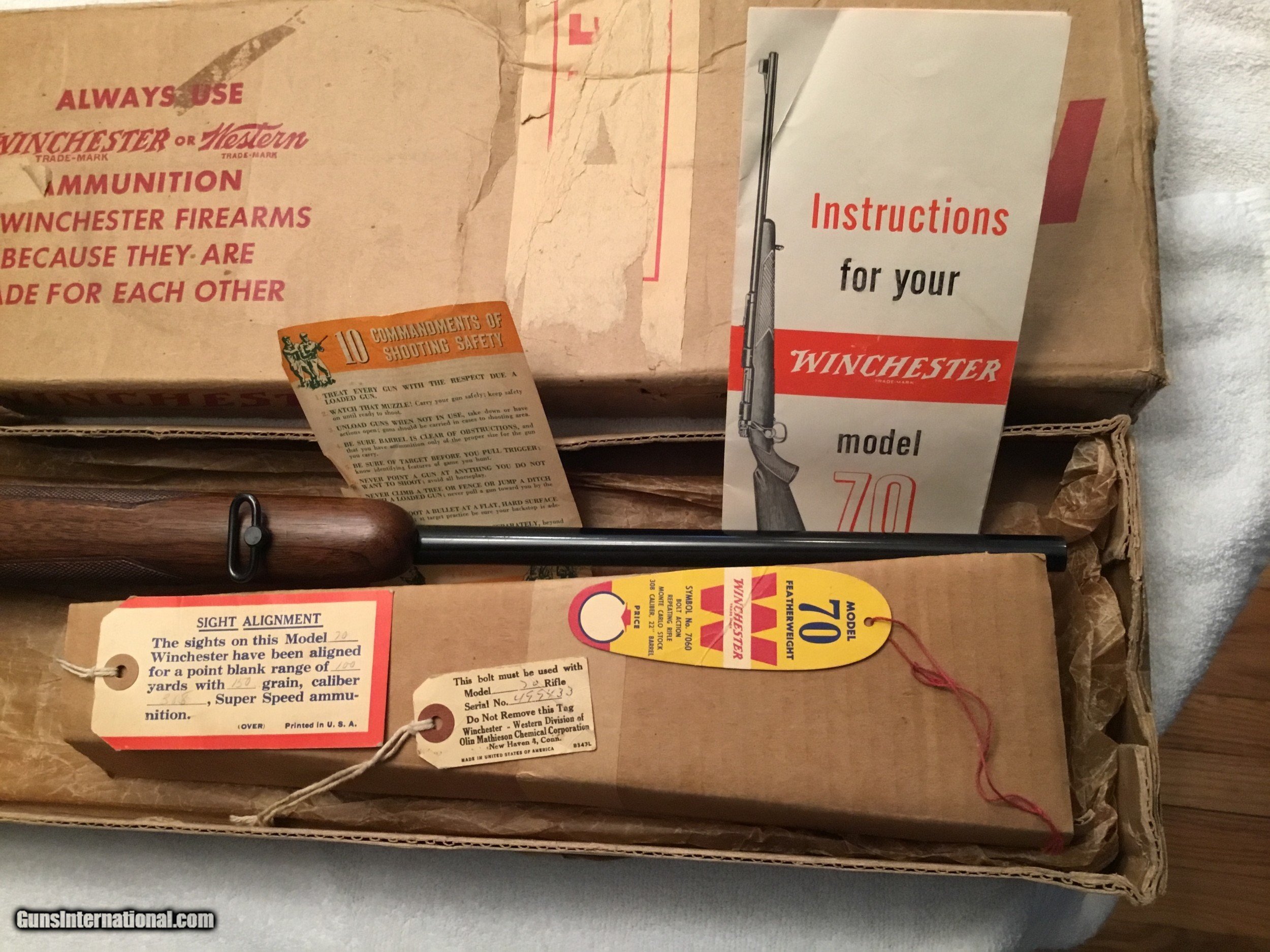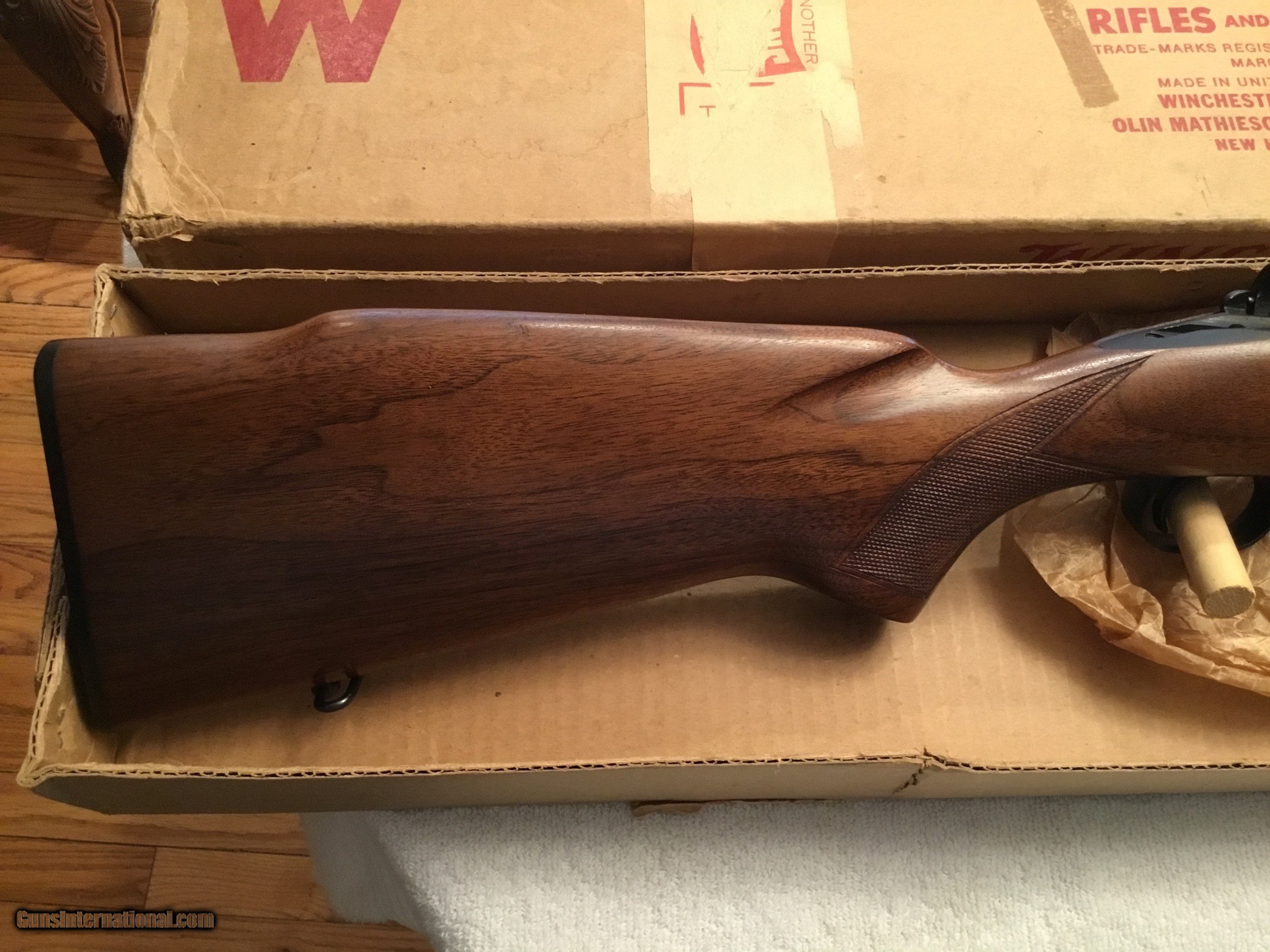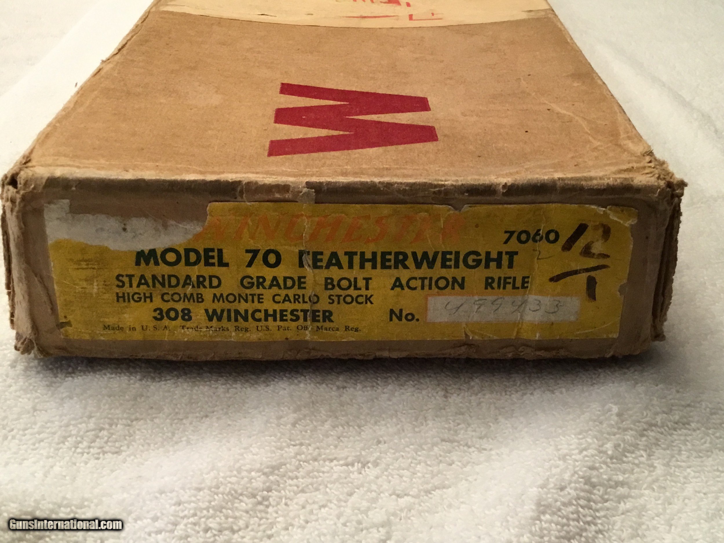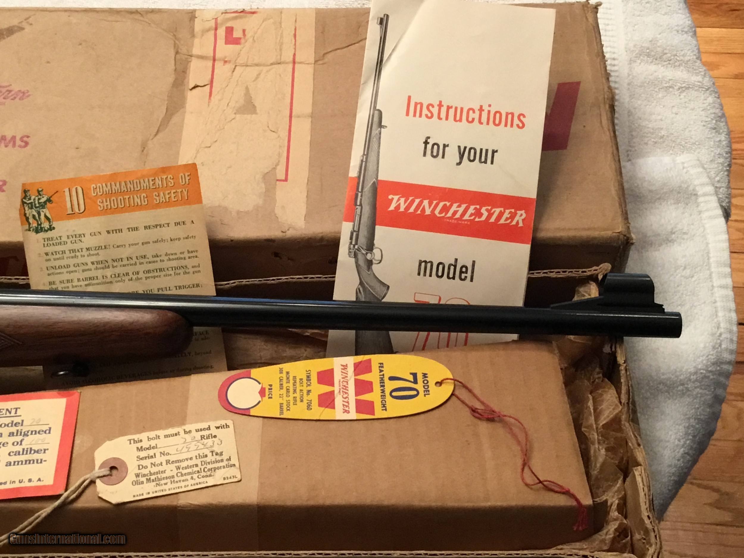 Description: Winchester Model 70 Featherweight with box and paperwork. Caliber .308 Serial No# 499433 (1960 ) Barrel 22" with factory sights. ( Correction has been made Barrel length is 22" ) Gun is in Excellent conditions wood is 99 % and Metal is 99% Bolt is serial numbered to the receiver Winchester is 100% original and has been fired very little If you are looking for a great Winchester model 70 this is the gun Box label is in good condition and serial numbered to the gun. SOLD SOLD Curio/Relic: Yes Manufacturer: Winchester Model: 70 pre-64 Serial Number: 499433 Barrel Length: 22” Caliber Info: .308 Condition: 99% excellent Metal Condition: 99% Wood Condition: 99% Bore Condition: 99% Barrel Type: Rifled Action: Winchester Triggers: Single Stock: Wood Monty Carlo Stock Dimensions: Factory original Stock Drop: Factory Stock Comb: Factory high comb Stock Heel: Original factory Stock Cast: Neutral factory Fore End: Checkered Butt Pad: Factory Winchester LOP: 13 5/8” Finish: Blued Sights: Factory Manufacture Date: 1960 Extras: Factory box Item Location: Mt Vernon IL. |