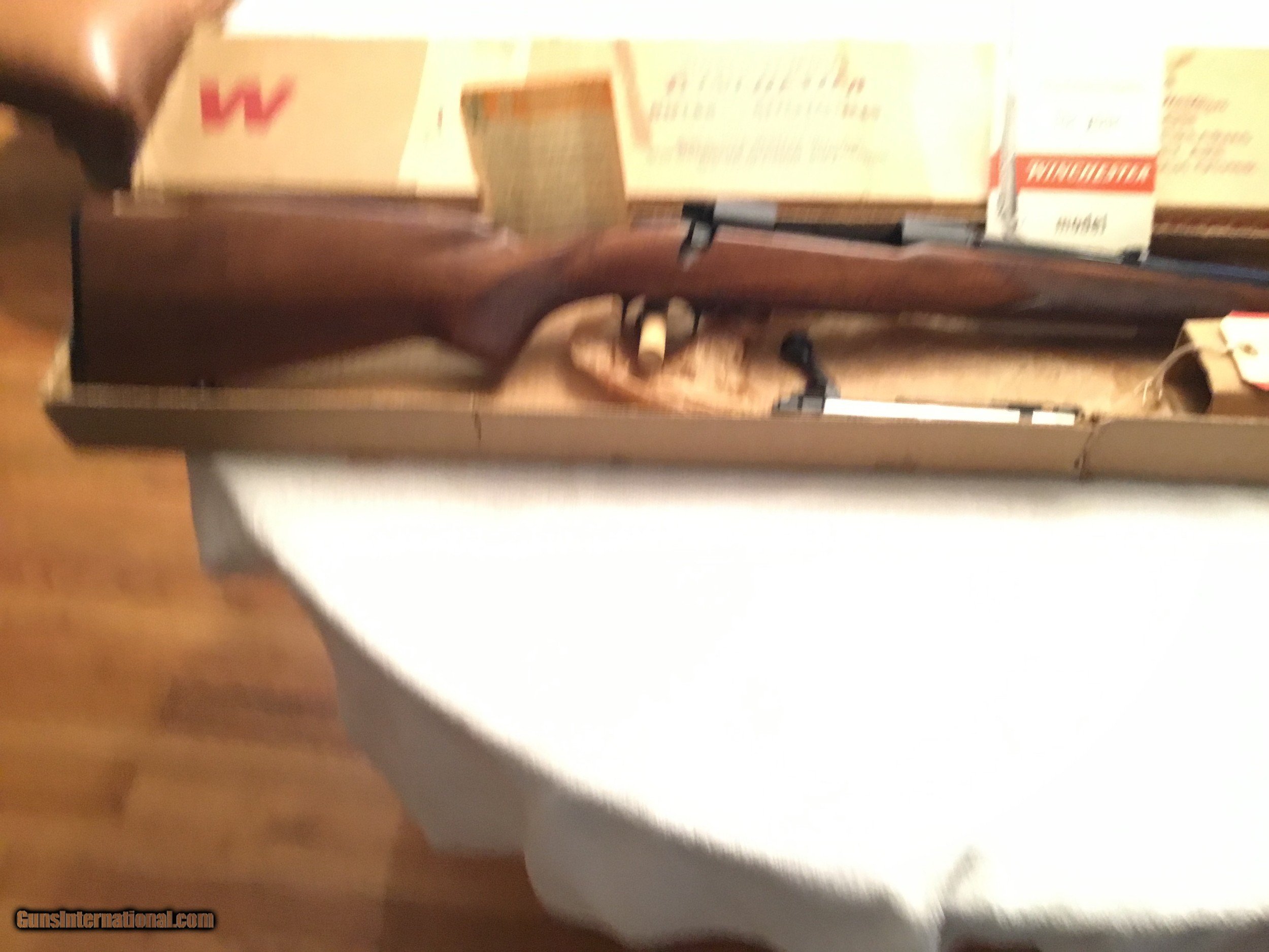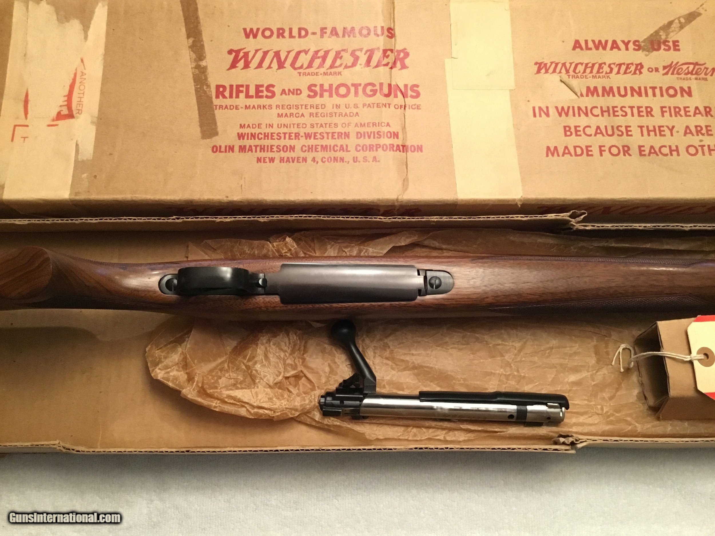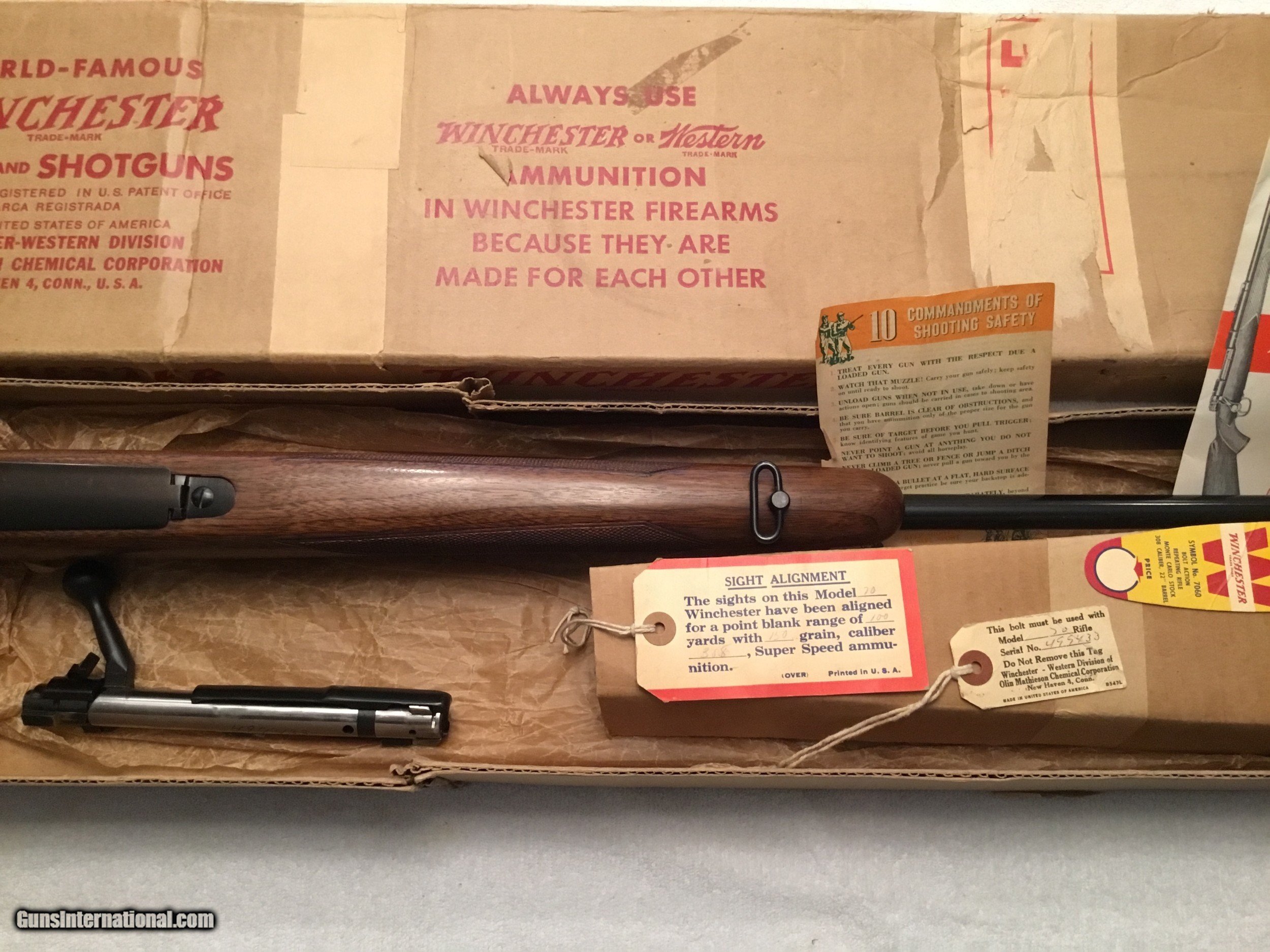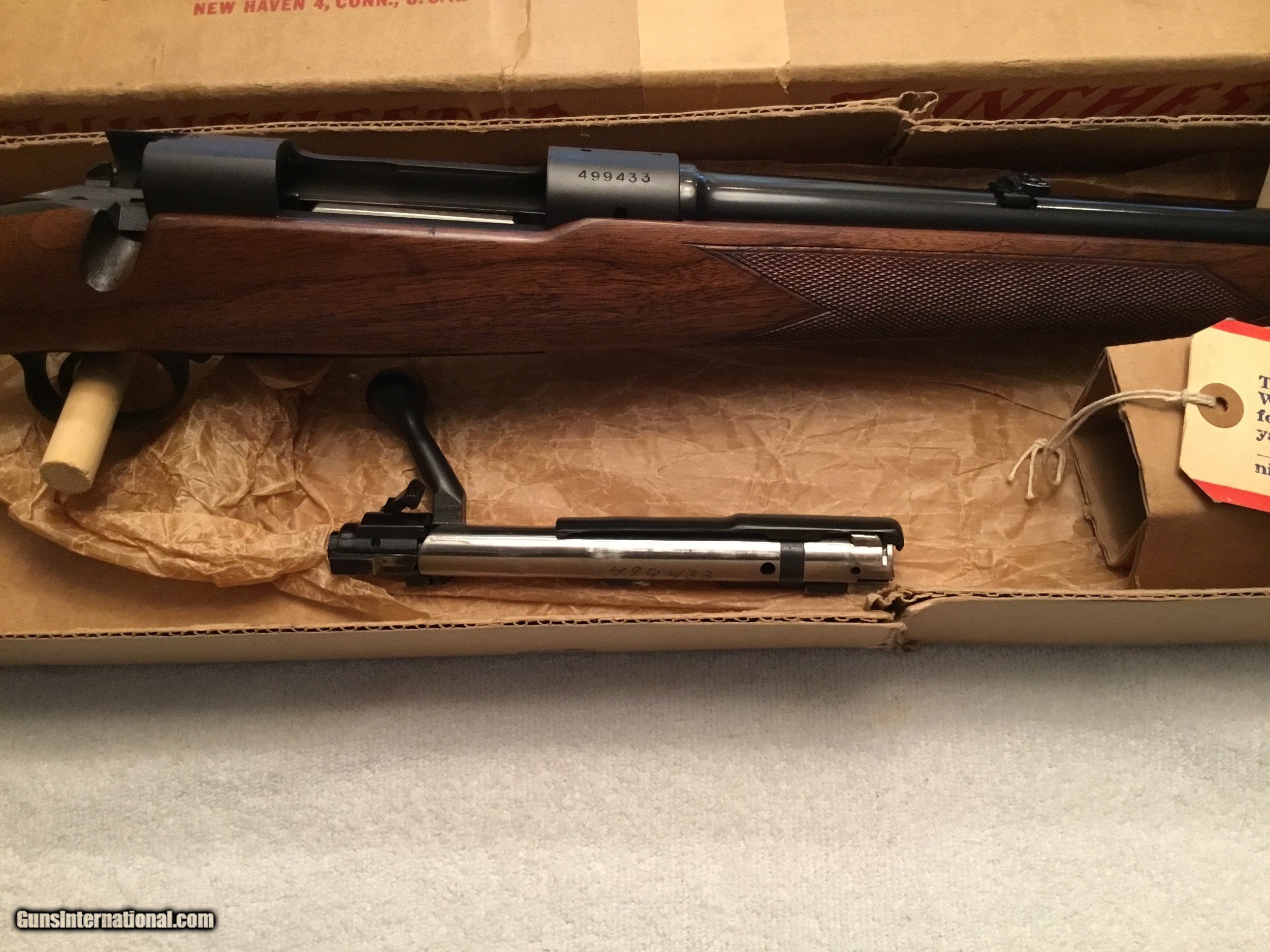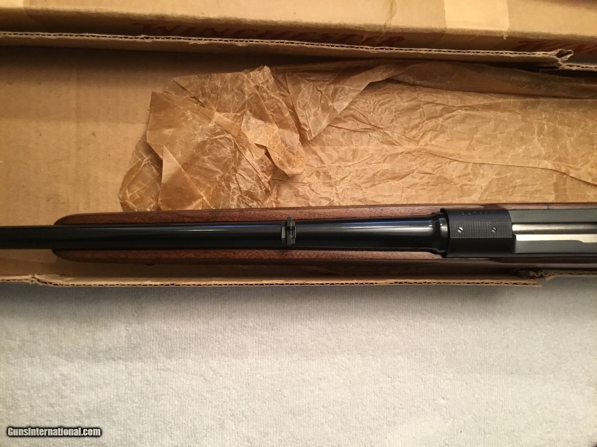 Description: Winchester Model 70 Featherweight with box and paperwork. Caliber .308 Serial No# 499433 (1960 ) Barrel 22" with factory sights. ( Correction has been made Barrel length is 22" ) Gun is in Excellent conditions wood is 99 % and Metal is 99% Bolt is serial numbered to the receiver Winchester is 100% original and has been fired very little If you are looking for a great Winchester model 70 this is the gun Box label is in good condition and serial numbered to the gun. SOLD SOLD Curio/Relic: Yes Manufacturer: Winchester Model: 70 pre-64 Serial Number: 499433 Barrel Length: 22” Caliber Info: .308 Condition: 99% excellent Metal Condition: 99% Wood Condition: 99% Bore Condition: 99% Barrel Type: Rifled Action: Winchester Triggers: Single Stock: Wood Monty Carlo Stock Dimensions: Factory original Stock Drop: Factory Stock Comb: Factory high comb Stock Heel: Original factory Stock Cast: Neutral factory Fore End: Checkered Butt Pad: Factory Winchester LOP: 13 5/8” Finish: Blued Sights: Factory Manufacture Date: 1960 Extras: Factory box Item Location: Mt Vernon IL. |