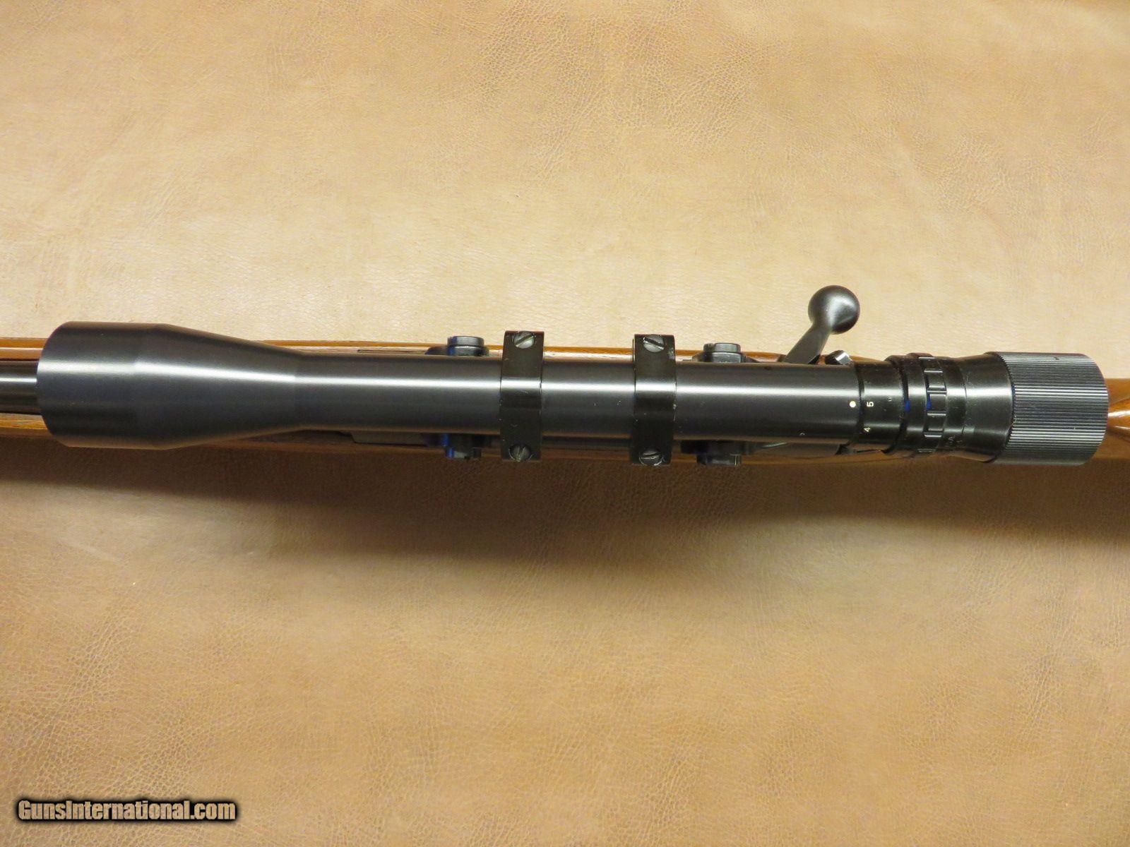 Description: .243 Winchester has 22 inch barrel with original sights including the front hood. Has a Bausch & Lomb Balvar 5 2.5 to 5 power scope with tapered crosshair mounted in fully adjustable Bausch & Lomb mount. Serial number 375xxxX. X suffix may indicate duplicate serial number. Checkered walnut stock with sling swivels and original aluminum butt plate. Metal is 99% and the wood is 98%. SOLD |