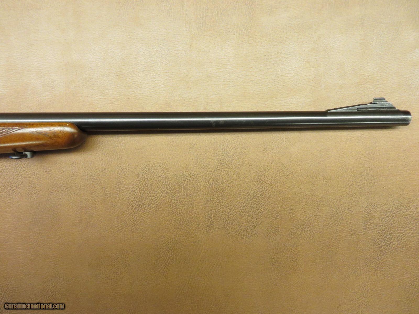 Description: .222 Remington rechambered from .22 Hornet has 24 inch barrel with original front sight missing the hood and a blank in the rear dovetail. Serial number 182xxx. Refinished checkered walnut stock has original butt plate and sling swivels. Extra checkering, pistol grip cap, and brass initial plate have been added. Blue is about 95%. SOLD |