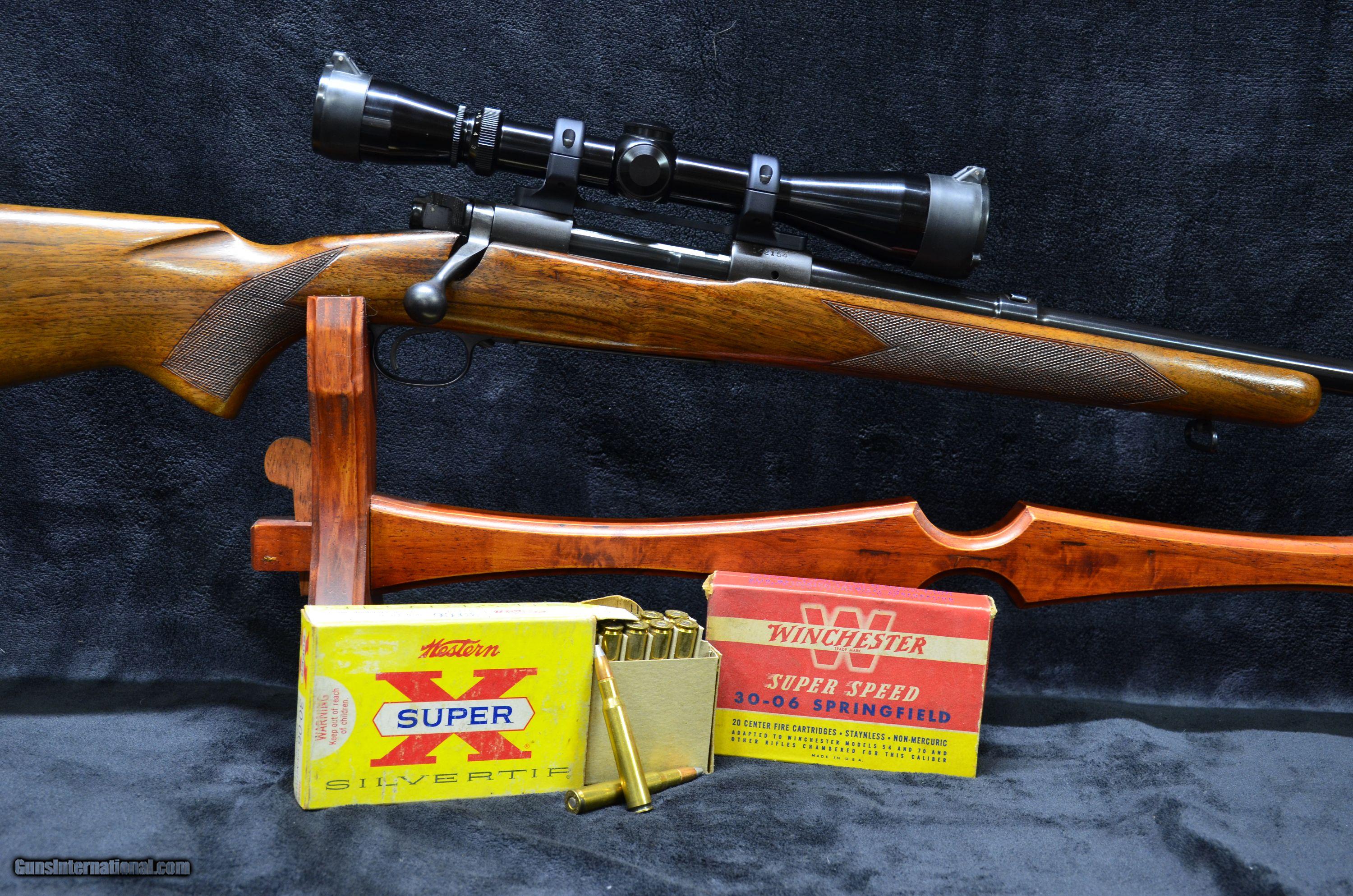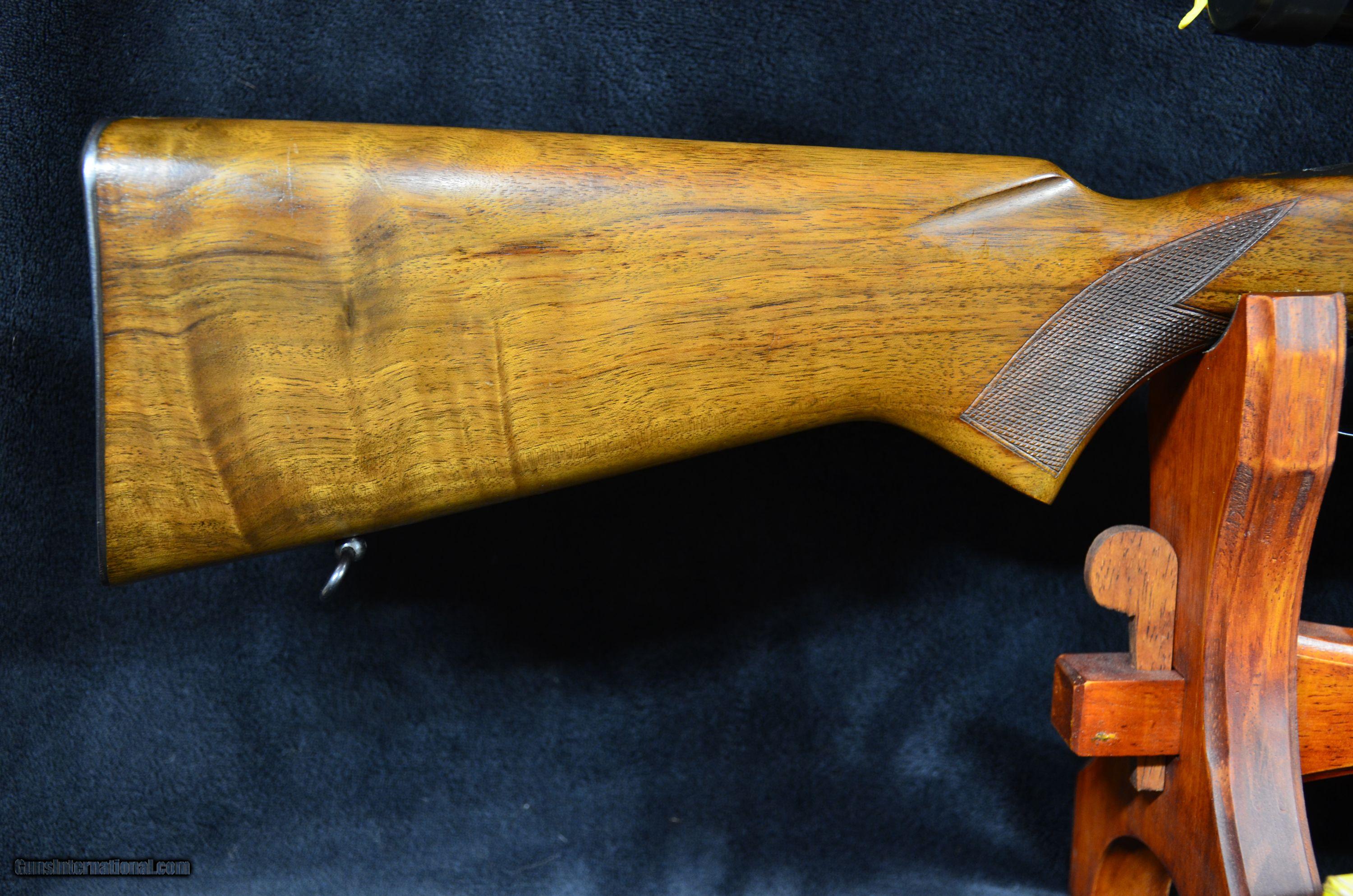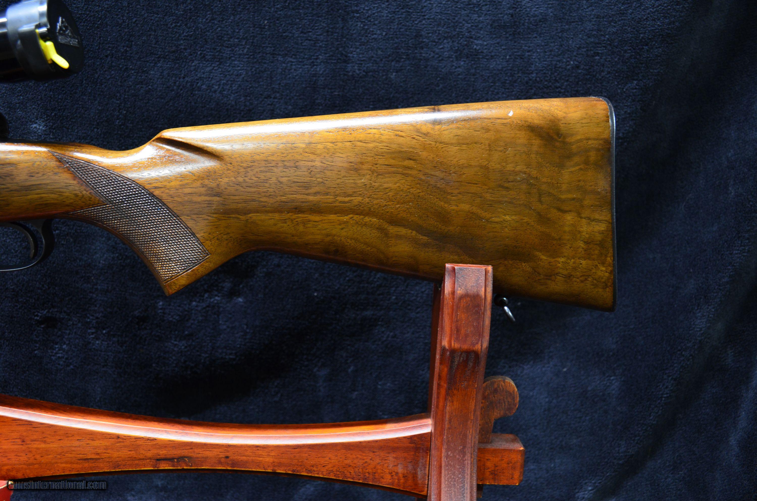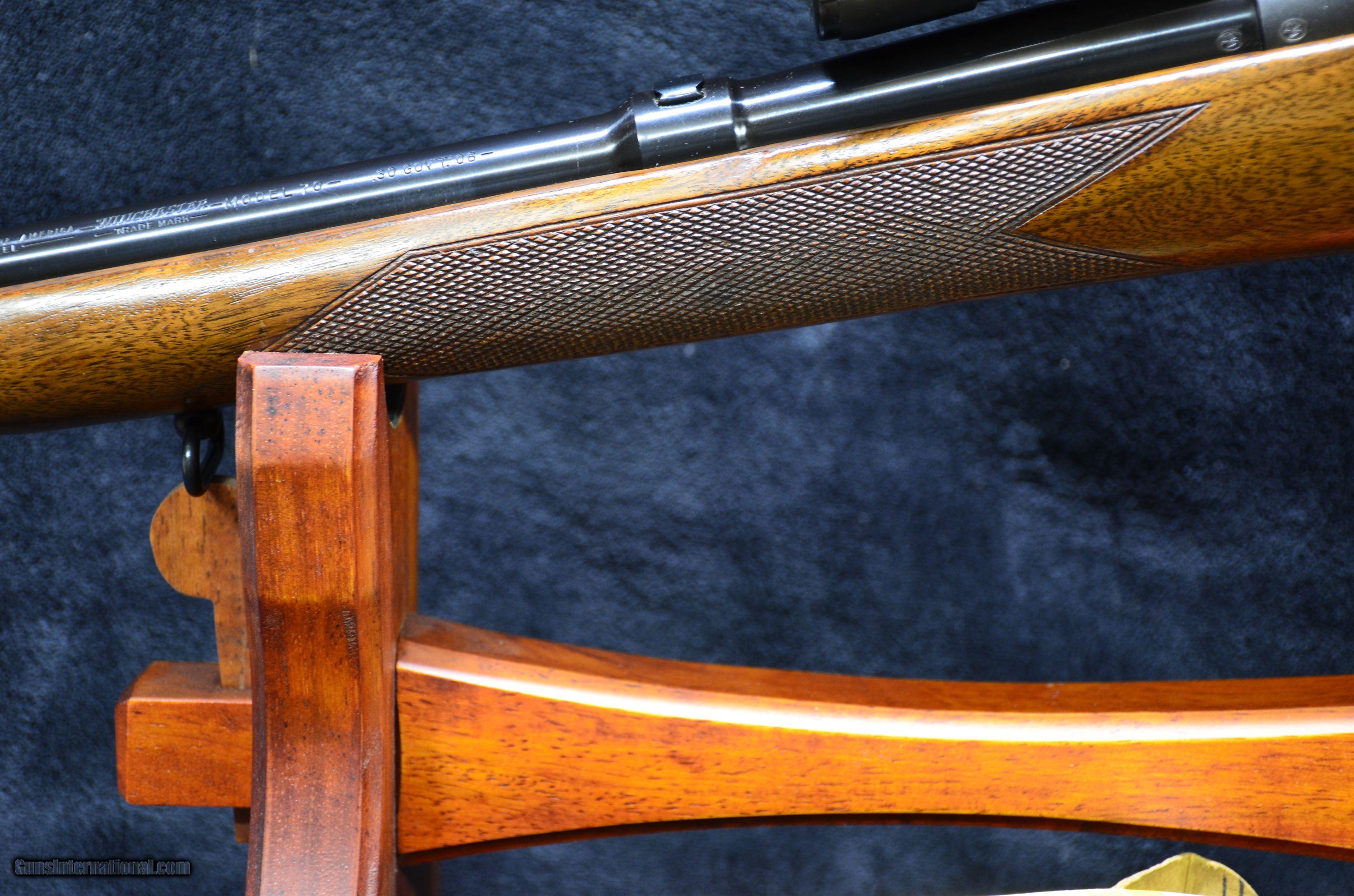 Description: Outstanding Pre-64 Model 70, 30-06, 24" barrel, Built 1950, Test fired only. Beautiful Walnut stock sporting a exceptional wood grain considering a majority were bland and dull. Factory sharp cut checkering + checkered steel butt plate. Blueing & stock 99%+ DNZ Scope Mount Leupold Limited edition 100th anniversary 3-9x Golden Ring Scope (1907-2007) includes knife & coin. As New condition. SOLD Curio/Relic: Yes |
