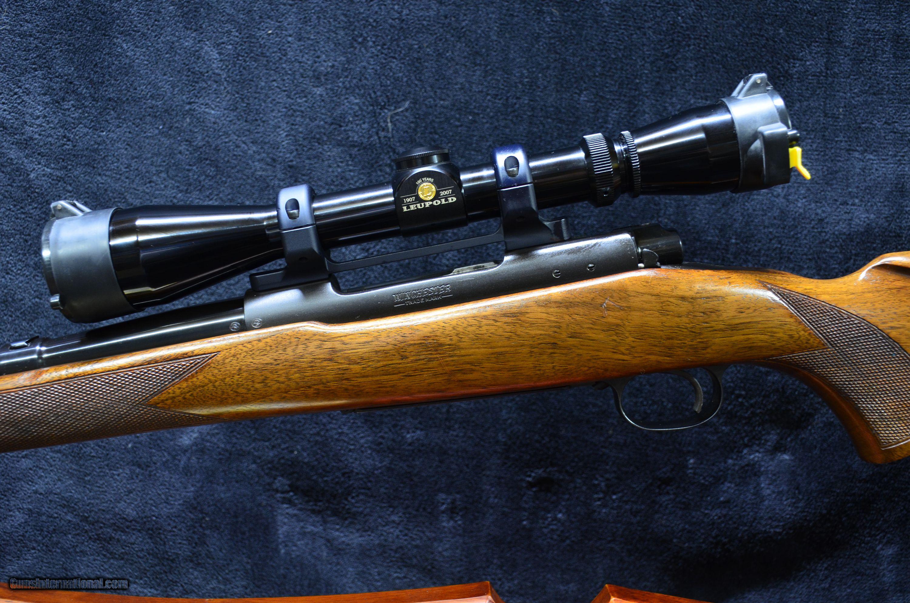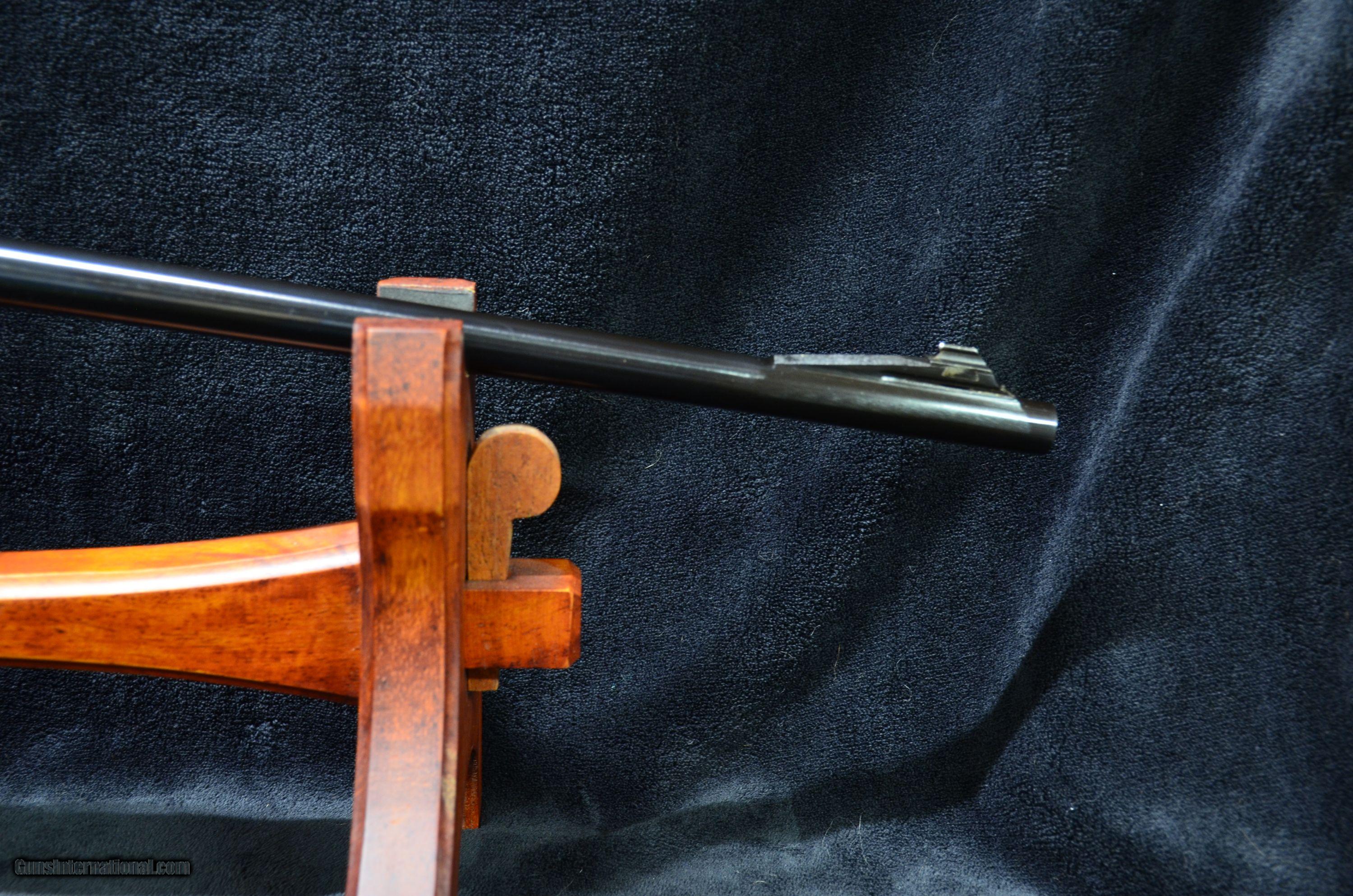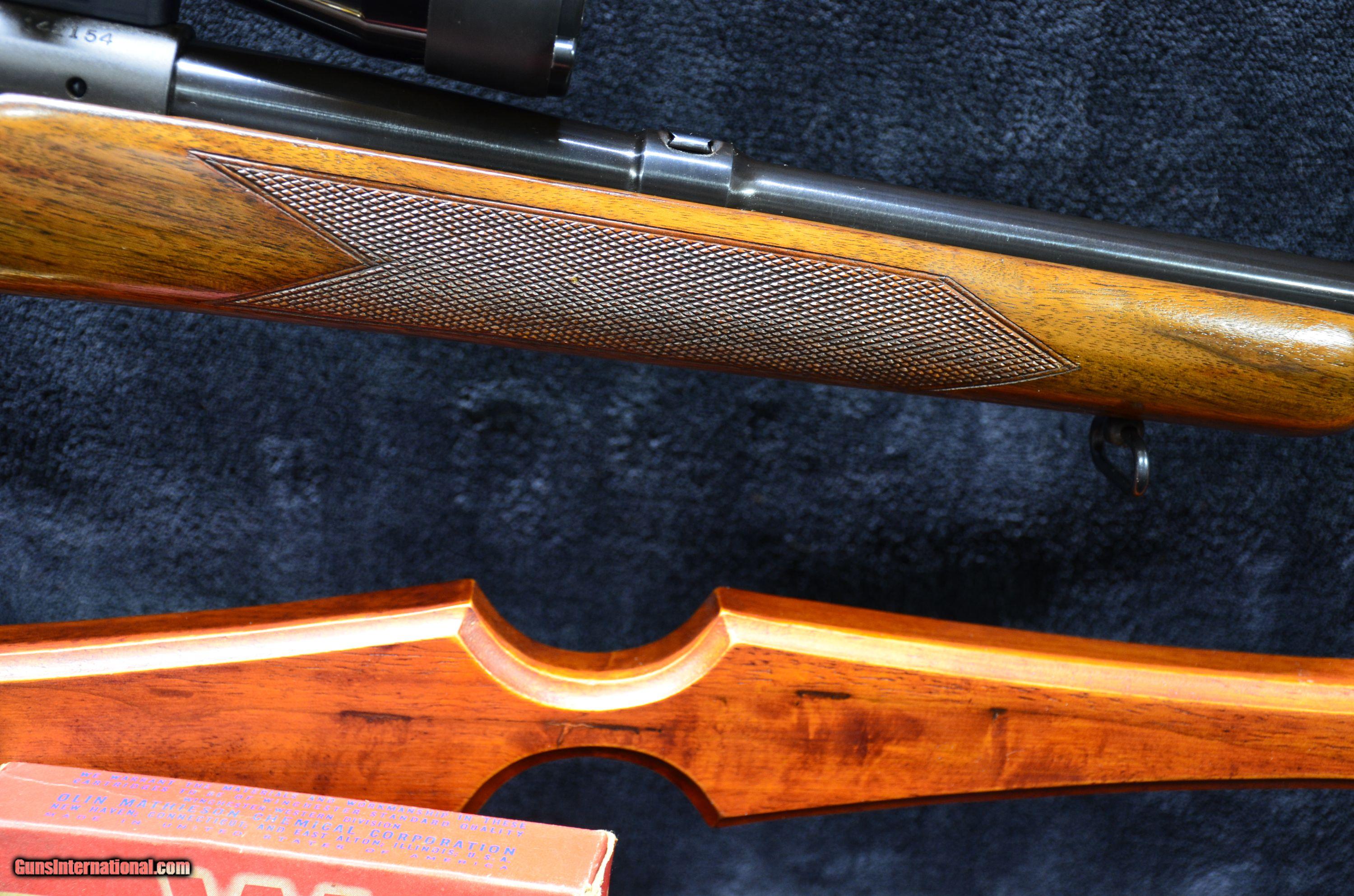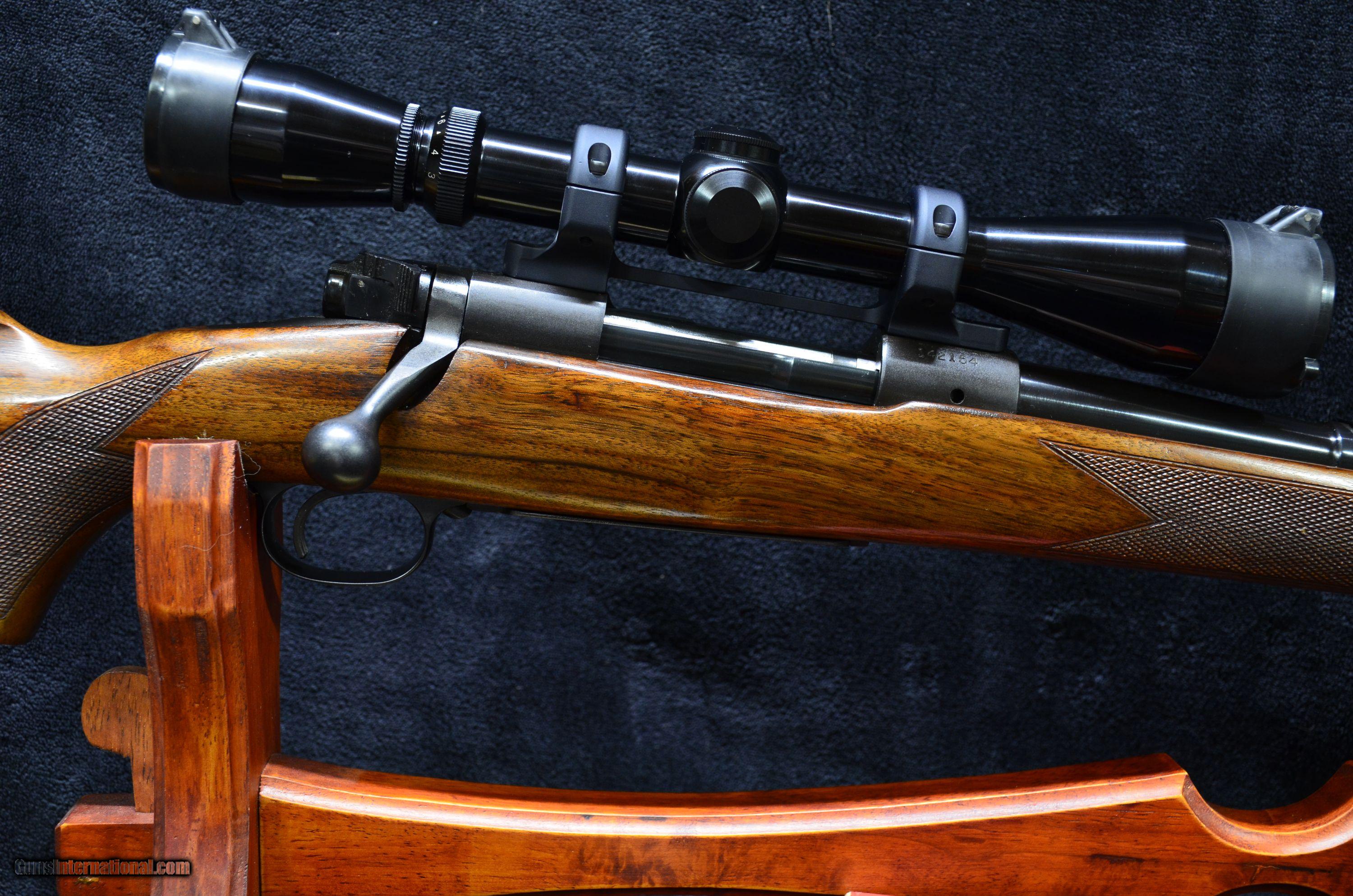 Description: Outstanding Pre-64 Model 70, 30-06, 24" barrel, Built 1950, Test fired only. Beautiful Walnut stock sporting a exceptional wood grain considering a majority were bland and dull. Factory sharp cut checkering + checkered steel butt plate. Blueing & stock 99%+ DNZ Scope Mount Leupold Limited edition 100th anniversary 3-9x Golden Ring Scope (1907-2007) includes knife & coin. As New condition. SOLD Curio/Relic: Yes |