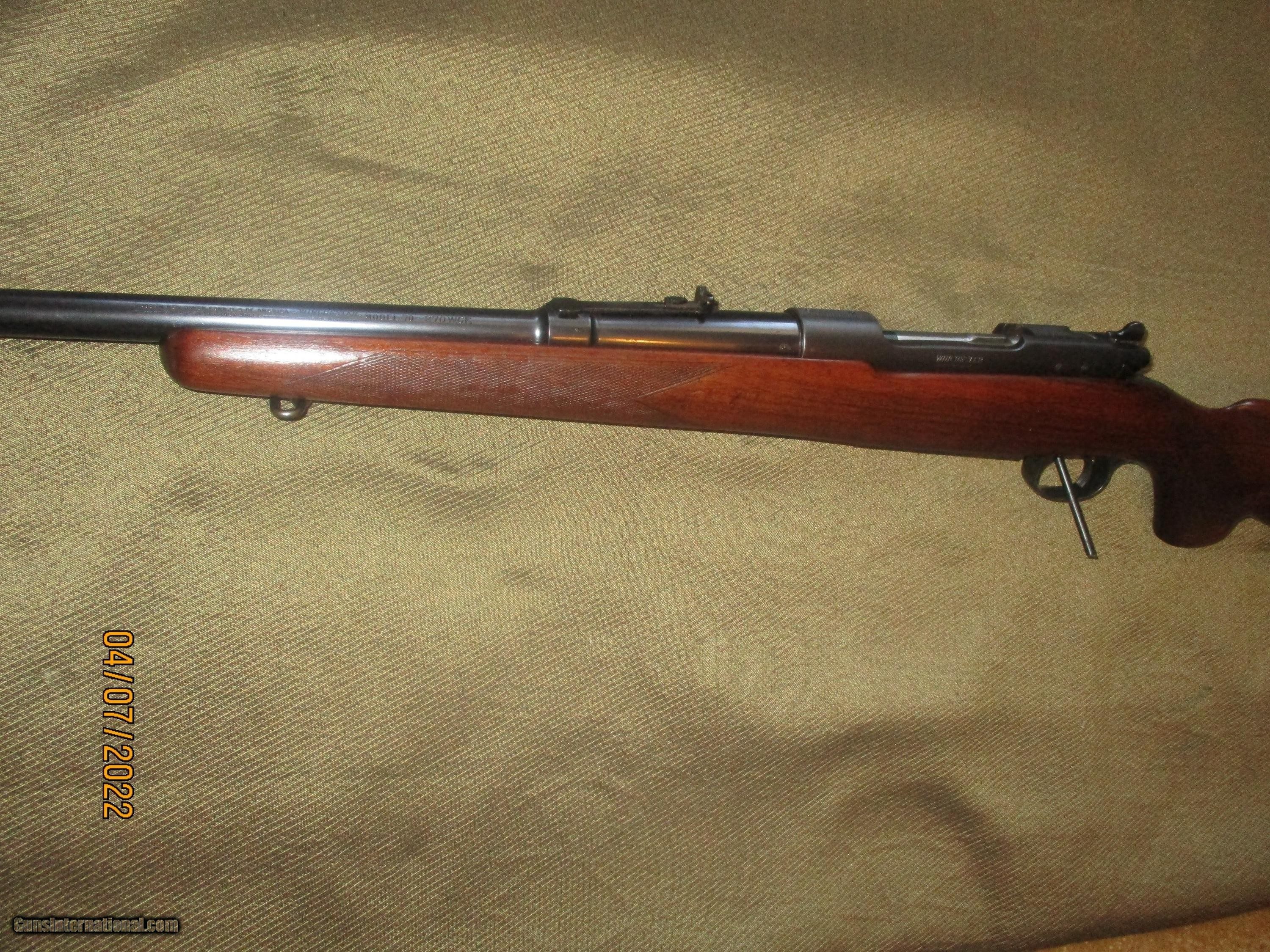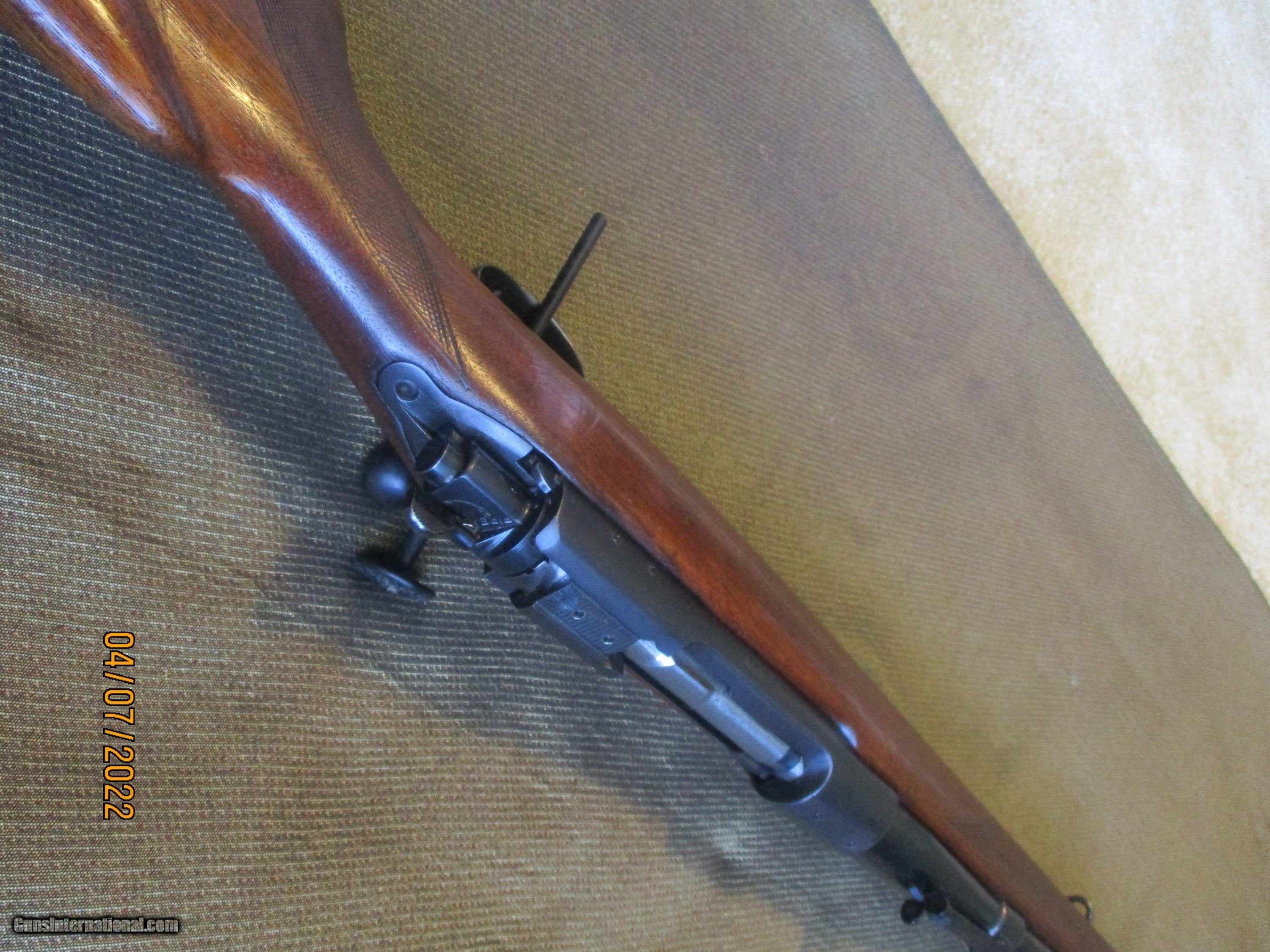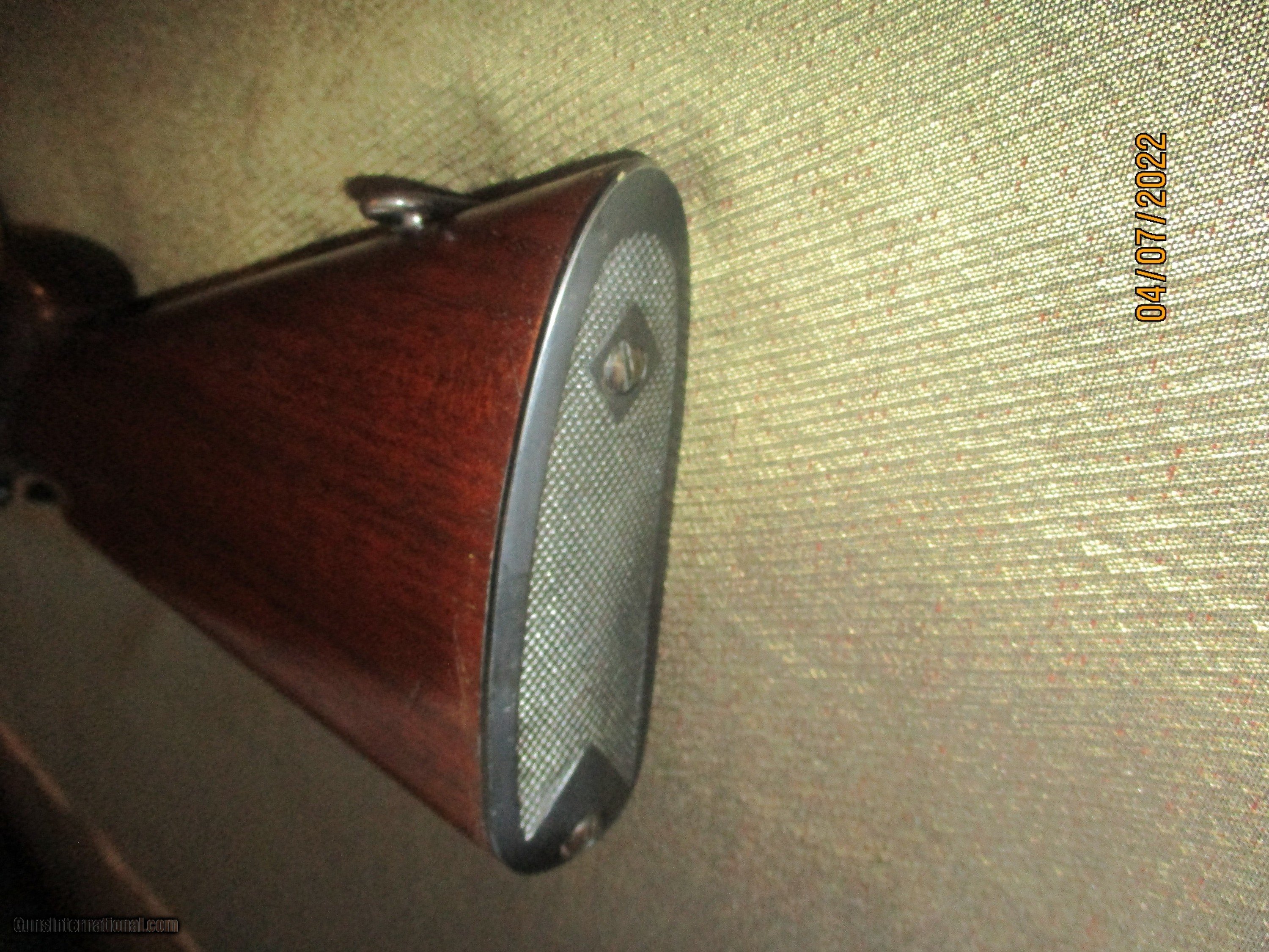 Description: 24" bbl. hooded front raised bead, open Buckhorn rear, corectly & neatly drilled & tapped for scope, 95% orig. blue, some minor scratches & handling use only, checkered steel buttplate, no cracks, split or repairs, 100% original, excellent shiny bore with sharp rifling, very tight, clean desirable Pre-War 70 for only SOLD |