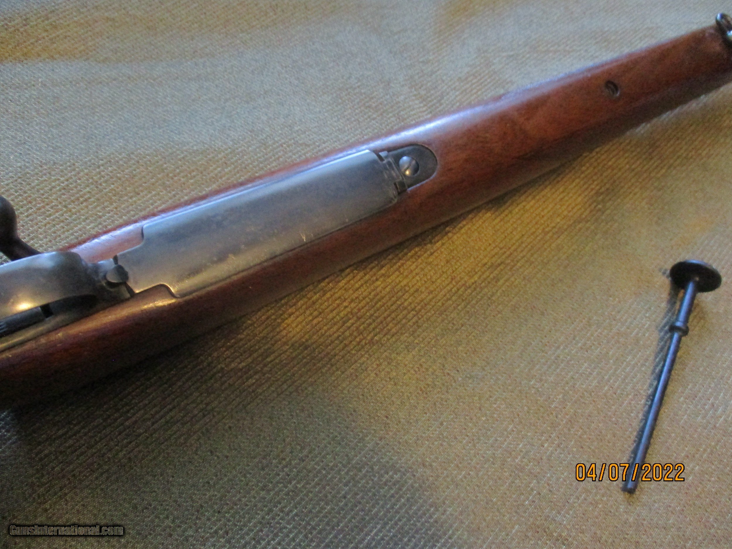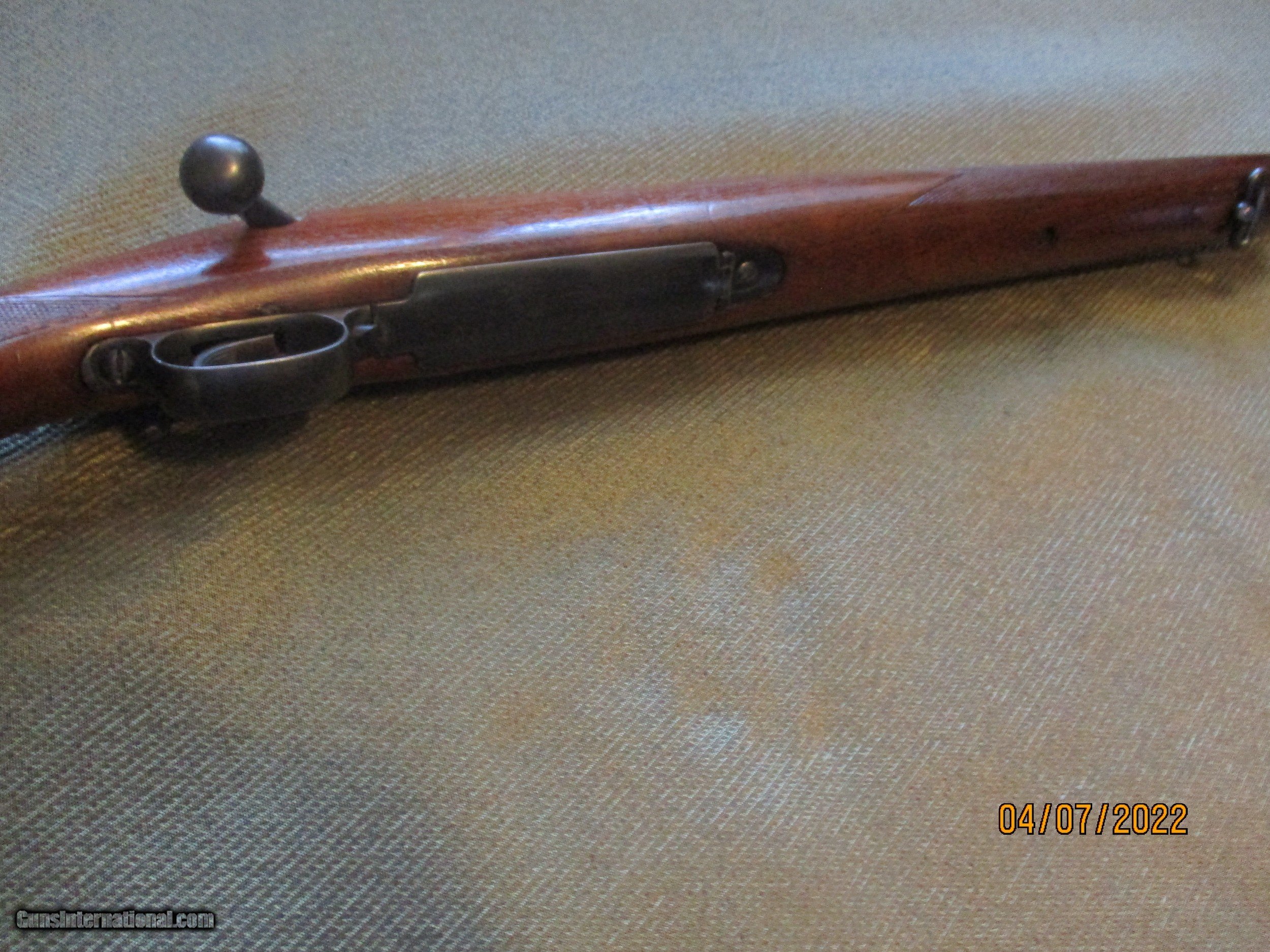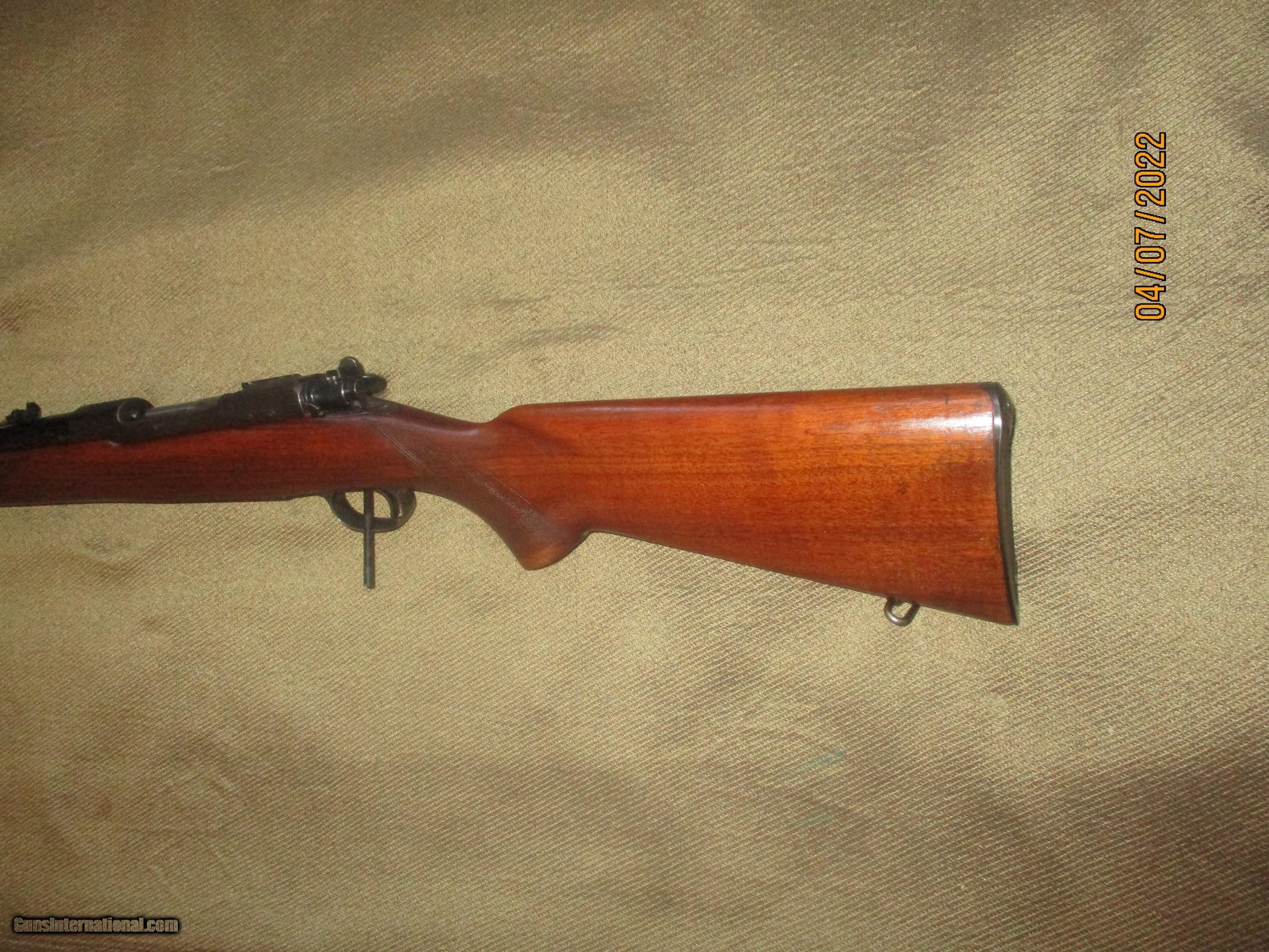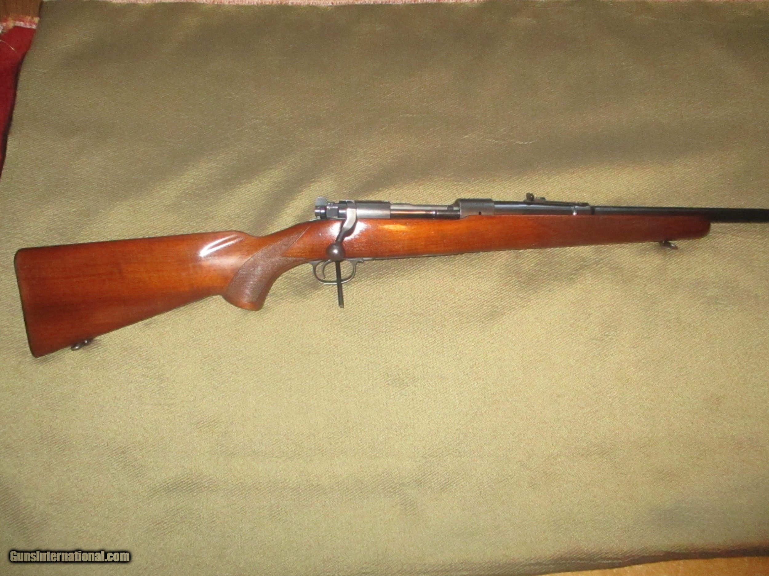 Description: 24" bbl. hooded front raised bead, open Buckhorn rear, corectly & neatly drilled & tapped for scope, 95% orig. blue, some minor scratches & handling use only, checkered steel buttplate, no cracks, split or repairs, 100% original, excellent shiny bore with sharp rifling, very tight, clean desirable Pre-War 70 for only SOLD |