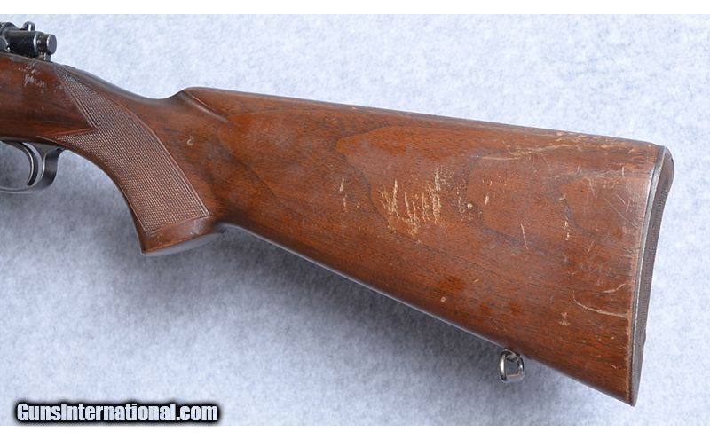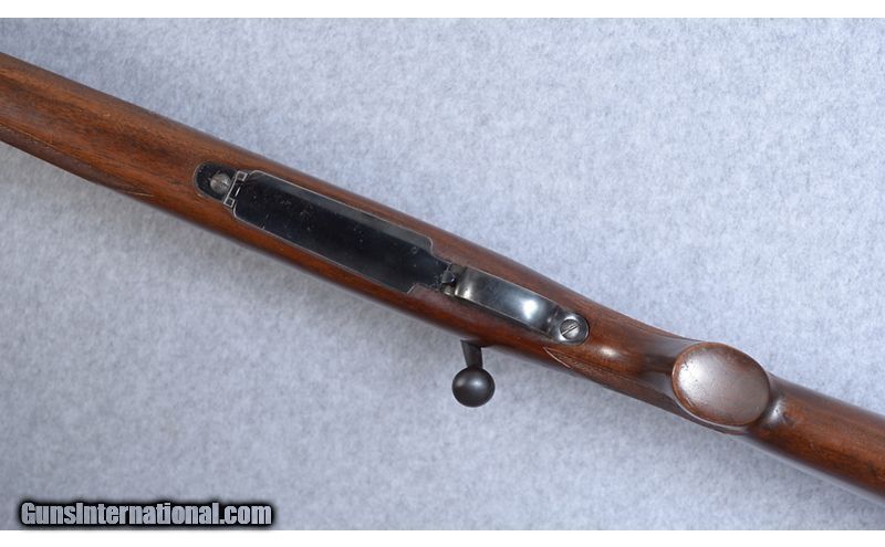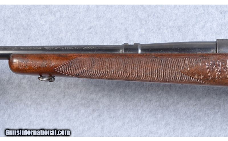 Description: This Winchester Model 70 is a very eary transition model made after World War II in 1946. .30-06 Springfield SOLD Curio/Relic: Yes Metal Condition: "Fair. There is some very minor surface pitting on the receiver. The bluing is worn at the crown and in two spots on the top of the barrel, but is complete over most the barrel and receiver. Wood Condition: Fair. The left side of stock is in very good condition. The right side has Barrels: 24 Stock Dimensions: 13.5" Length of Pull Butt Pad: Checkered metal butt pad Weight: 8.25 lbs Sights: Front sight only. The rear dovetail Item Location: Boise, ID |