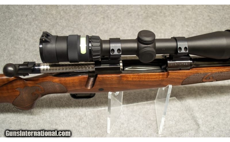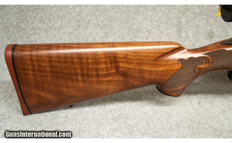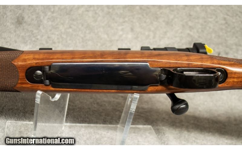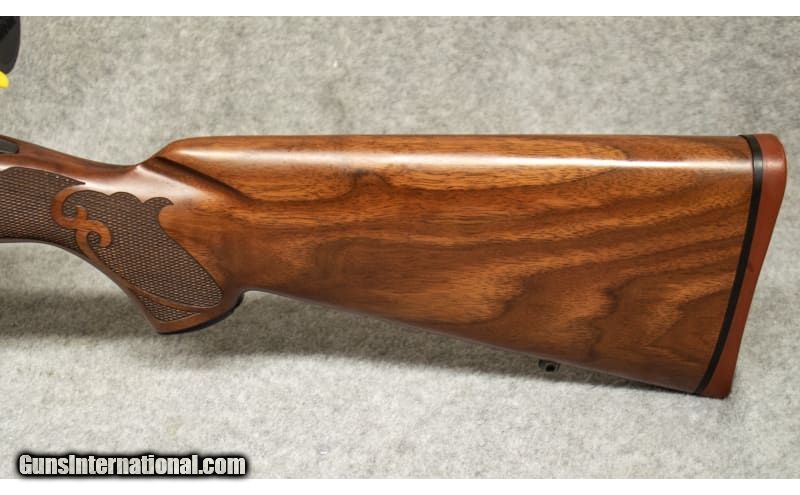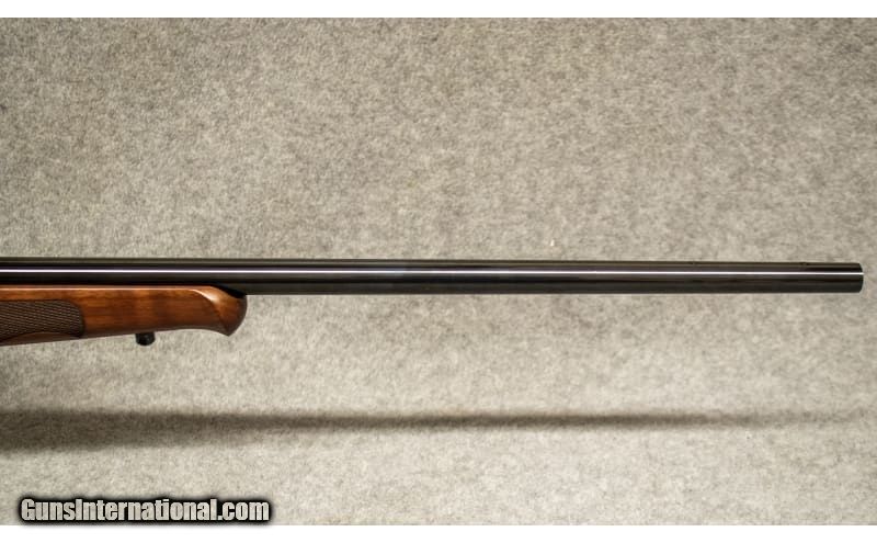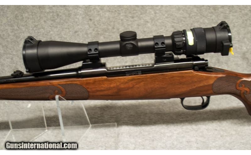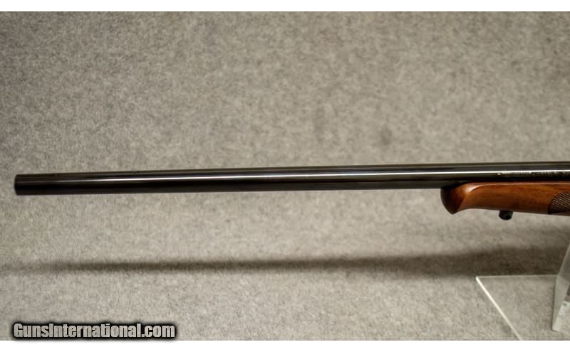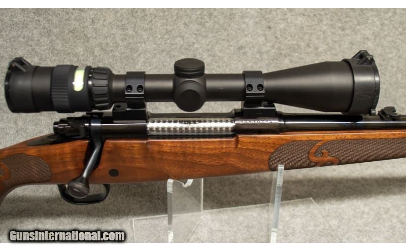 Description: .243 Winchester cal., pre-64 style controlled round feeding, blade type ejector, 5 shot mag., 22 in. hammer forged blue barrel w/o sights, one-piece trigger guard and hinged mag. floorplate, high polish bluing, satin finished Grade II fleur-de-lis checkered walnut stock with Schnabel forend, jeweled bolt, knurled bolt handle, 3-position safety, Pachmayr Decelerator recoil pad, Trijicon 3-9 riflescope with duplex reticle and fiber optic dot. .243 Winchester SOLD Curio/Relic: Yes Metal Condition: Excellent Wood Condition: Excellent Bore Condition: Excellent Item Location: Greenville, SC |