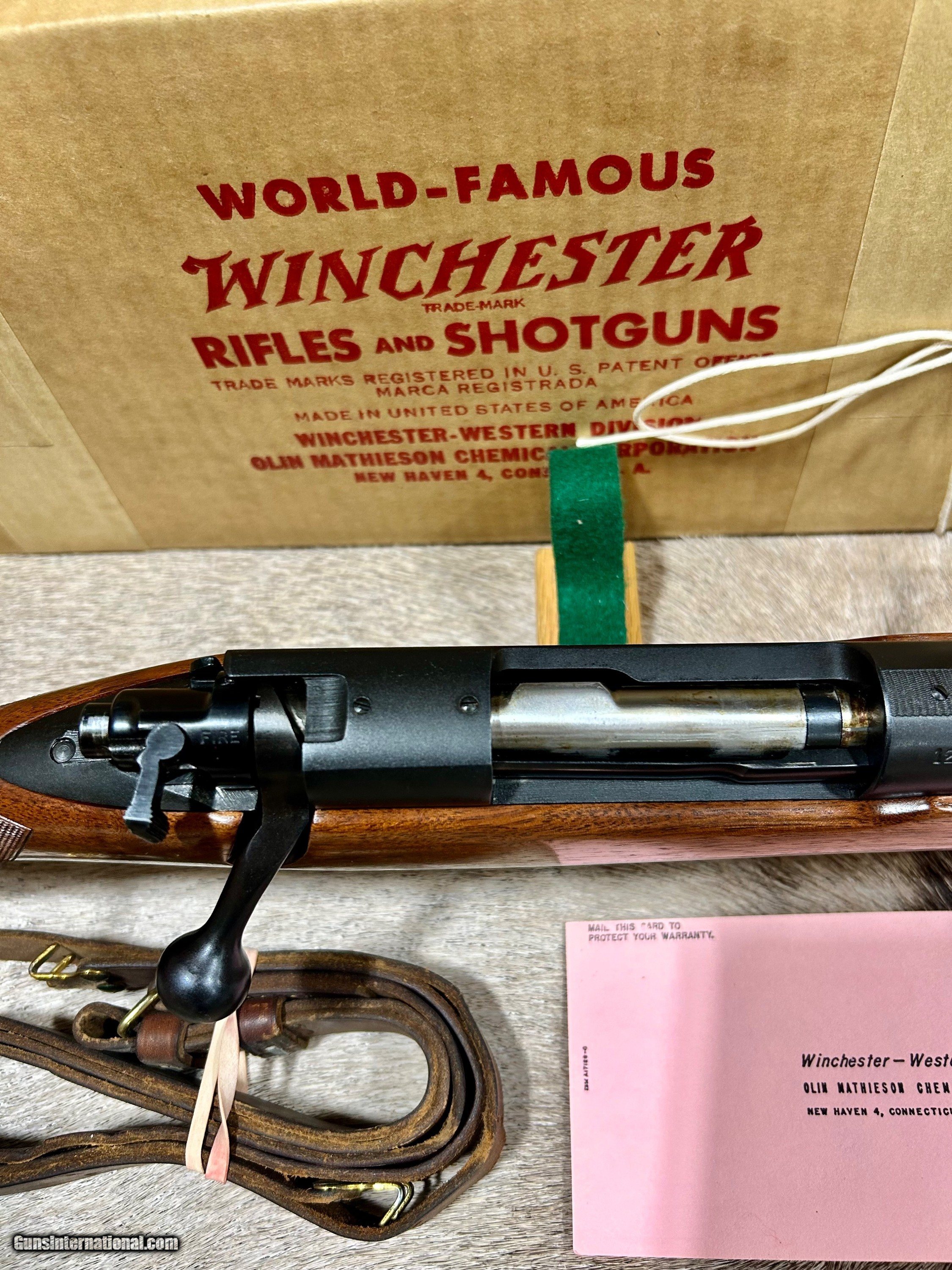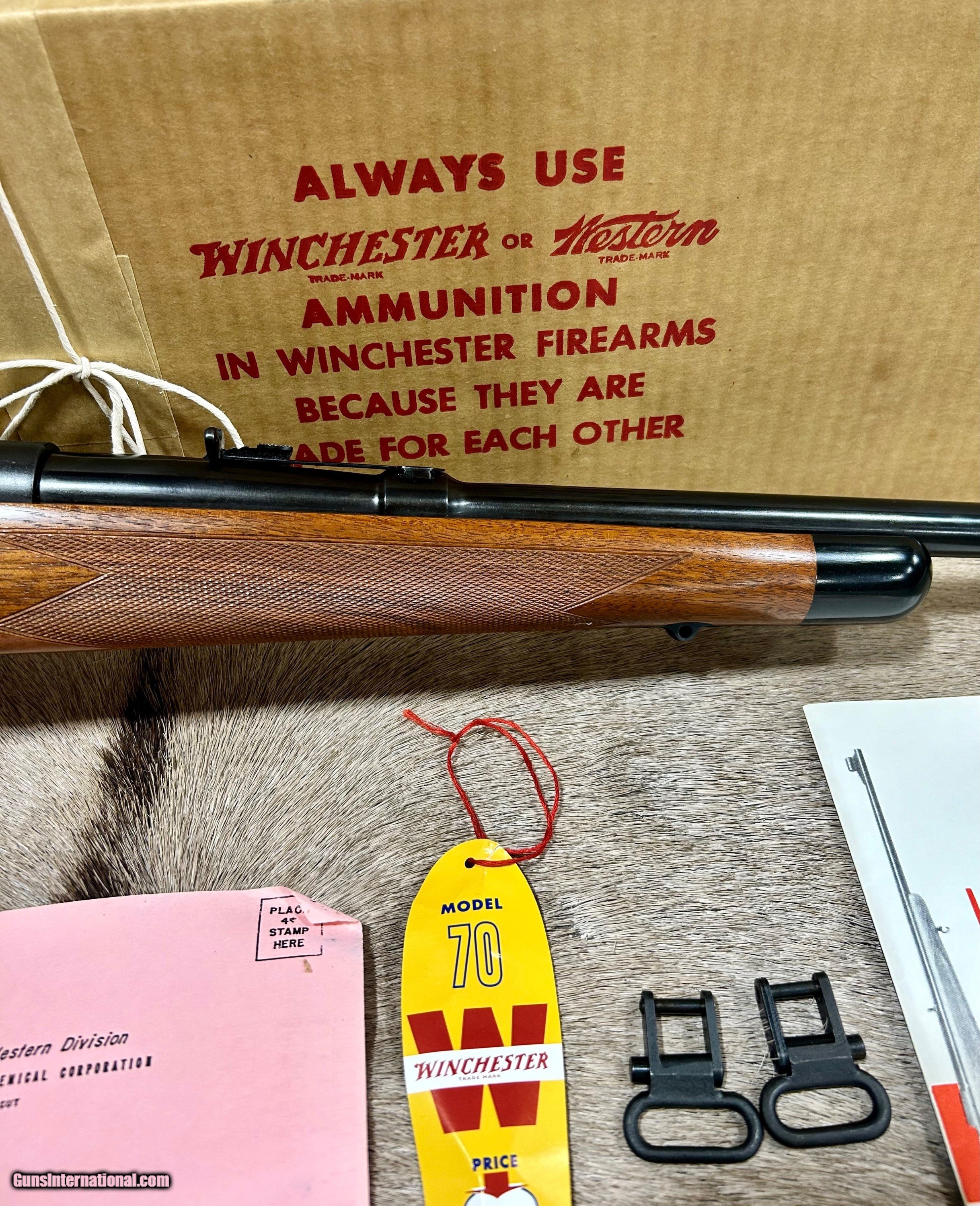 Description: *****Sold*****want to start by saying that this is, without a doubt the finest and most beautiful model 70 I have ever listed. This is a pre 64 model 70 chambered in the most sought after 22 Hornet caliber. This fine rifle was made in 1950 and has the most beautiful piece of wood on it that I have ever witnessed on a Winchester. This had to be a special ordered gun with a substantial upcharge to leave the factory with piece of wood like this on it. Another thing that just sends this rifle over the top is that it's 100% NIB. The brown paper tape on the box is still holding the top to the bottom and has never been cut. I also want to say that I have never listed a model 70 that still had the string in the box that they tied the box together with at the factory. Included in this package is the original sling swivels, sling, brochure, warranty card and hang tag. My humble opinion of the hang tag is I believe it is a reproduction but the rest of the package is 100% original. I'm telling you folks this is a true investment piece that will continue to climb in value and there will always be a strong market for this gun. Shipping and ins will be $99 and to FFL or C and R license holder only. Please don't hesitate to ask any questions or request anymore photos. SOLD |
