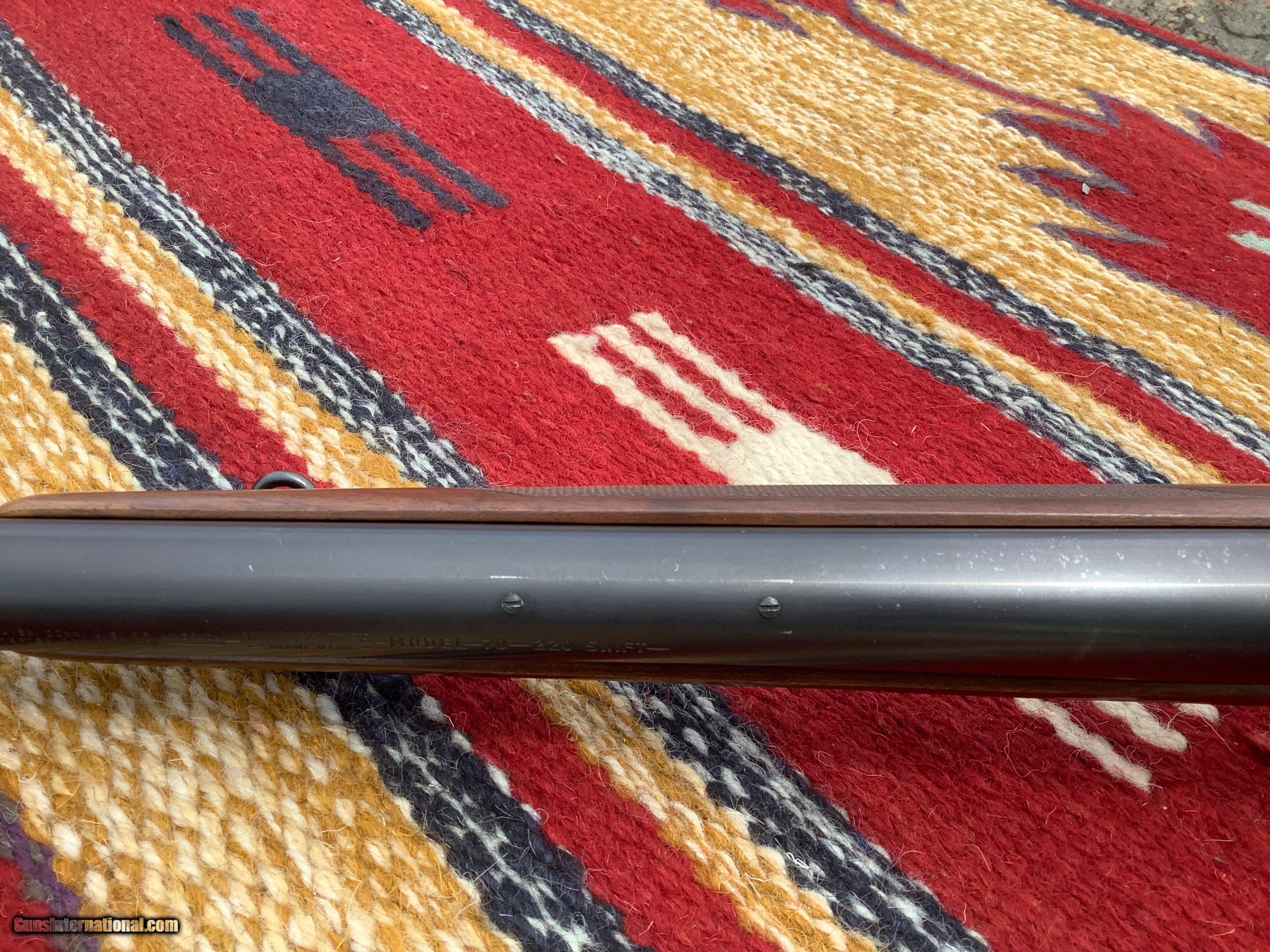 Description: Here is a great condition 220 swift varmint, serial 503888; 2/61 manufacture, 26 inch barrel, all correct mag box, bolt stop, follower, matching bolt number to receiver, beautiful stock, no glass, some sign of cleaner on barrel at muzzle and just ahead of receiver, excellent bore, correct swivels, try to find a nicer one, 2750.00, 75.00 shipping, must send to FFL or c and R. Call for more photos, thanks SOLD Rifle Caliber: .220 Swift |
