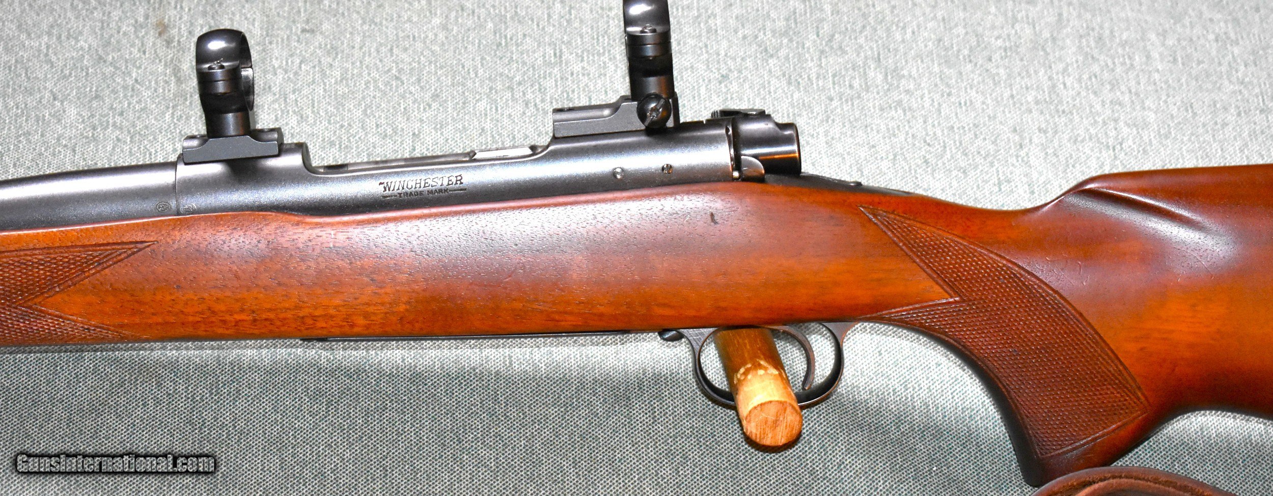 Description: Winchester pre 64 model 70 standard rifle in 220 Swift. Built in 1954, this rifle has a 26" stainless barrel with a mint bore. the rifle is in excellent condition retaining 95% of the original blue and wood finish. The stock is sound with no cracks or damage. The rifle retains the original steel buttplate and has a period correct leather military style sling installed. It comes with Leupold bases and 1" rings installed. A great varmint rifle or fun long range target gun. C&R eligilbe. SOLD Rifle Caliber: .220 Swift Manufacturer: Winchester Model: Model 70 Pre 64 Serial Number: 321872 Barrel Length: 26 Condition: Excellent Metal Condition: Excellent Wood Condition: Excellent Bore Condition: mint Barrel Type: Winchester Proof Steel Action: Bolt Butt Pad: FFactory Steel Buttplate Manufacture Date: 1954 Extras: Sling and scope mounts |