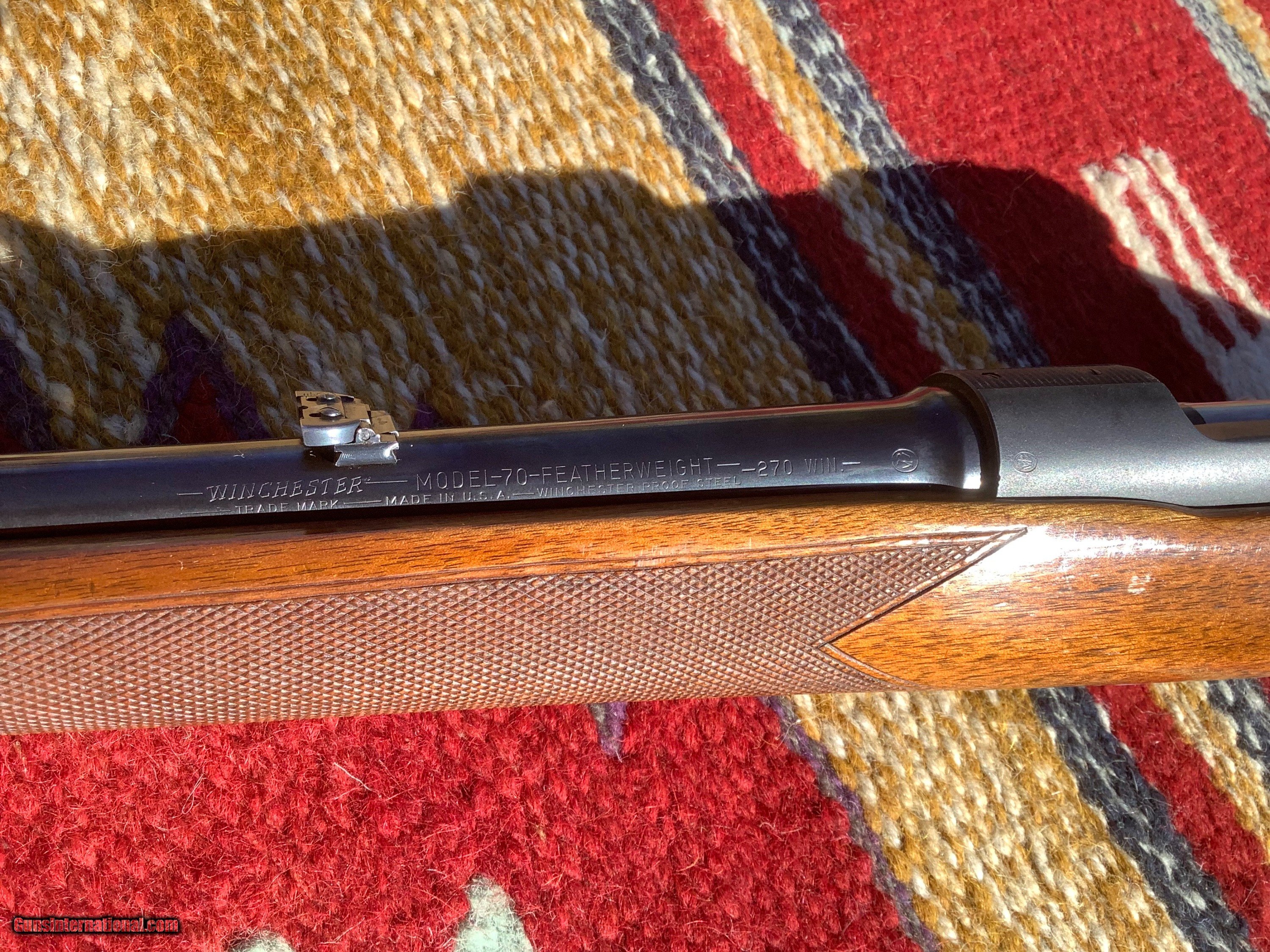 Description: Winchester Pre 64 Model 70 270 Featherweight, late 56 gun, all correct, beautiful gun, bolt numbered to action, original finish on stock, some impressions, nothing major, no cracks, metal at 95%, harder to find these with the aluminum buttplate, good condition, has been set on buttplate for sure. Good solid gun, ship to FFL only, cashiers check, check or money order, $1850.00, 75.00 shipping. SOLD |