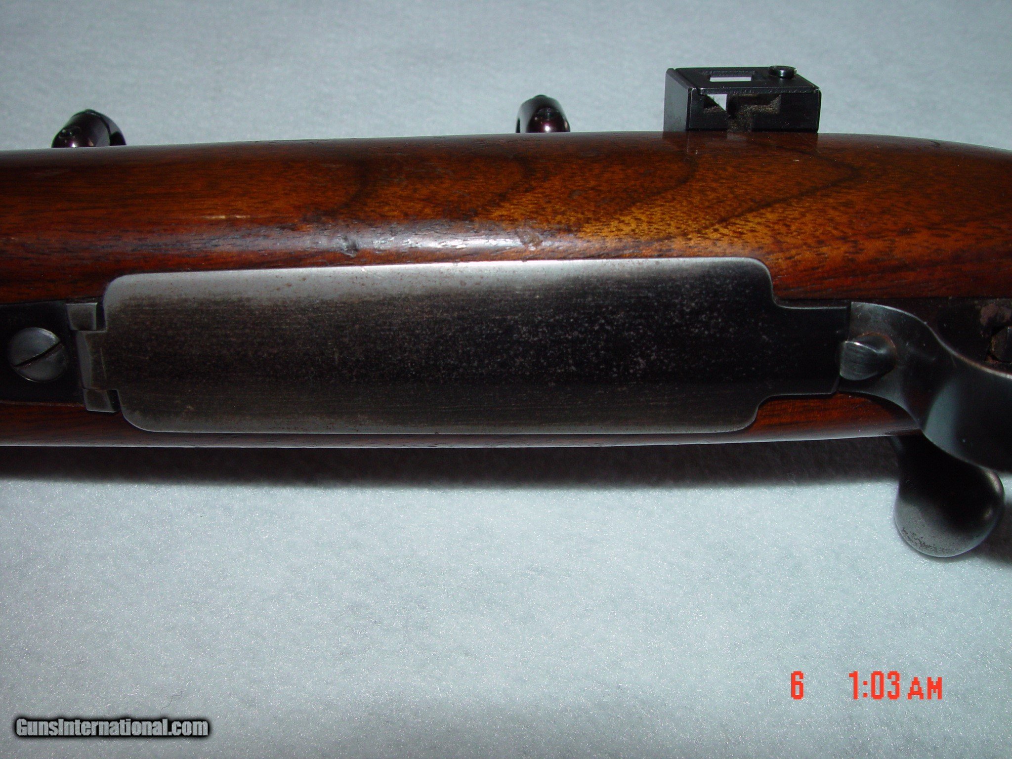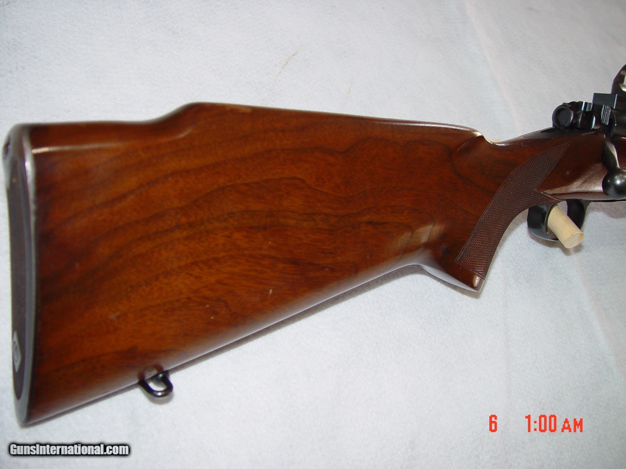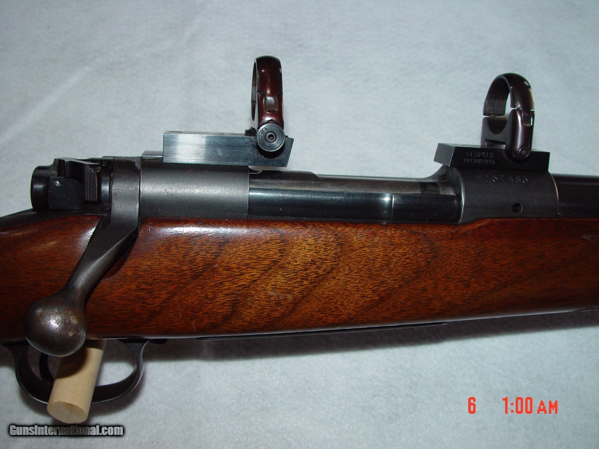 Description: BUILT IN 1953, THIS MODEL 70 IS IN EXCELLENT CONDITION WITH ALL ORIGINAL BLUING SHOWING LITTLE TO NO DAMAGE EXCEPT SOME LIGHT BLUING WEAR ON THE BOLT HANDLE, THE METAL BUTT PLATE, AND A LITTLE ON THE FLOOR PLATE. THE GUN COMES WITH LEUPOLD RINGS AND BASES AS WELL AS AN ORIGINAL BASE FOR A SIDE MOUNT RECEIVER SIGHT. THE WOOD SIMILARLY HAS SOME LIGHT HANDLING MARKS BUT NOTHING OVERLY DAMAGING. SOLD Curio/Relic: Yes |
