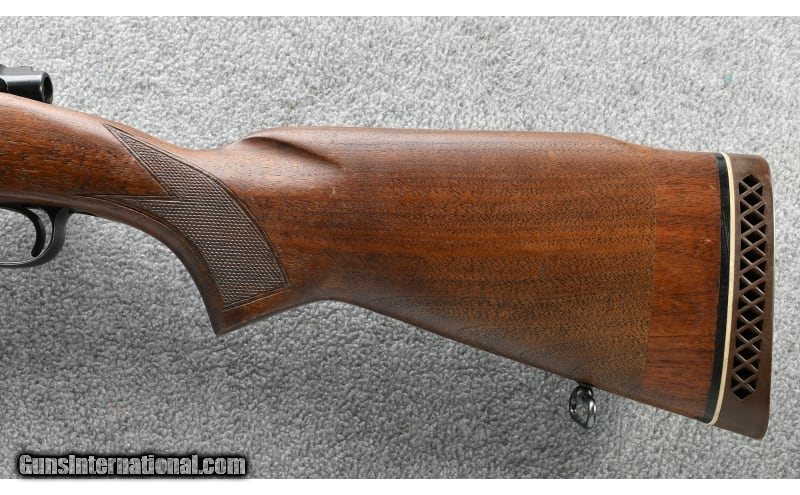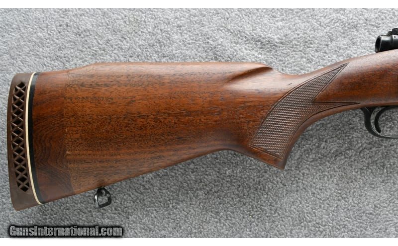 Description: This rifle was made in 1961 and is very accurate with proper ammunition .300 H&H Magnum SOLD Chambers: .300 Holland & Holland Magnum in a three round box magazine bolt action rifle Metal Condition: "Good, shows a little wear on the trigger guard and floor plate Wood Condition: "Good, was shortened 1 1/8"" at one time and then lengthened to the current LOP of 13"" Bore Condition: Bright and Sharp rifling Barrels: 26" with 1:10" Twist Triggers: Factory Stock Dimensions: 13" LOP Fore End: Checkered walnut with sling swivel Butt Pad: White Line vented by Pachmayr Weight: 8 Lbs. 4 Oz. Sights: "Hooded blade front, Folding leaf rear and two-piece steel scope bases Item Location: Grand Junction, CO |