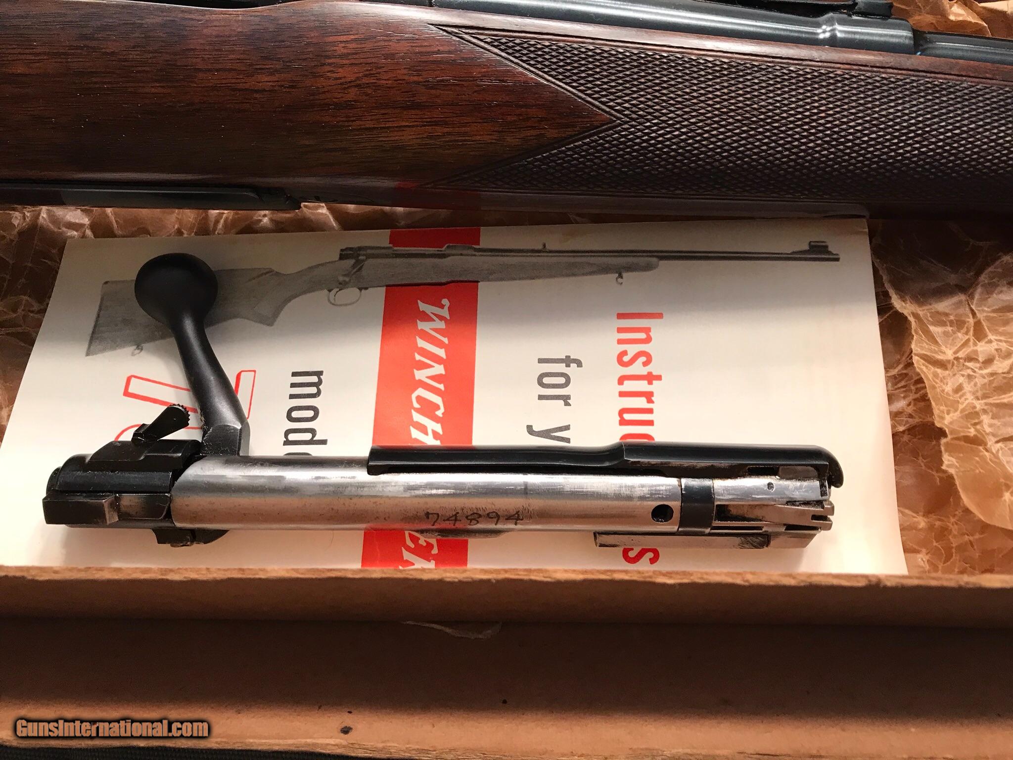 Description: Winchester model 70 pre- 64 caliber .22 hornet Manufactured 1947 transition period with pre- war safety and polished bolt with serial number of gun stamped in the bolt. With clover leaf receiver tang with factory sling swivels and standard Winchester proof marks on barrel and receiver buttplate is checkered steel and comes with factory papers and box with factory label gun retains . Gun has minor handling marks and retains 99% of factory blue and wood finish Serial No. 74894. factory box has end of box repaired. The factory label end is ok and label is good condition SOLD SOLD Curio/Relic: Yes Manufacturer: Winchester Model: Model 70 pre- 64 Serial Number: 74894 Caliber Info: .22 hornet Bore: Rifled Chambers: .22 hornet Condition: Excellent Metal Condition: 99% Wood Condition: 99% Bore Condition: Excellent Barrel Type: Rifled Action: Bolt Stock: Standard Fore End: Wood Butt Pad: Steel checkered Finish: Blued Sights: Factory Manufacture Date: 1947 Item Location: Carmi Il. |