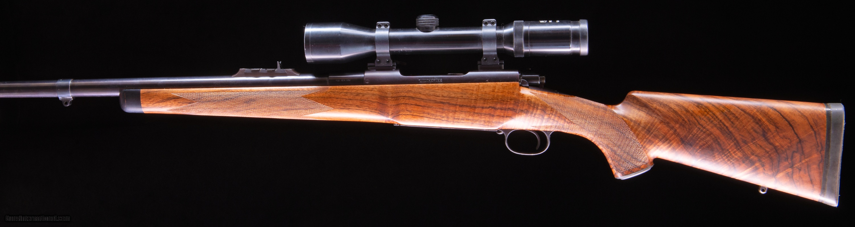 Description: Drillings, Double Rifles, and Rifles - This custom rifle was built by now deceased but well known rifle maker Lee Kuhns. Featuring a pre -64 Winchester Model 70 magnum action and lovely English walnut. The stock is invisibly reinforced to protect the wood from the recoil of this cartridge. Safari sights, steel grip cap, this is a first class rifle at a bargain price. It is in near new condition. *The scope is a Karl Kahles HELIA L 1.5-6x42 *** Note: To see this gun with high resolution photos and a zoom-in feature, go to the vintagedoubles main site and search for the gun ID: 4257 or browse the main site to see our full gun collection. |