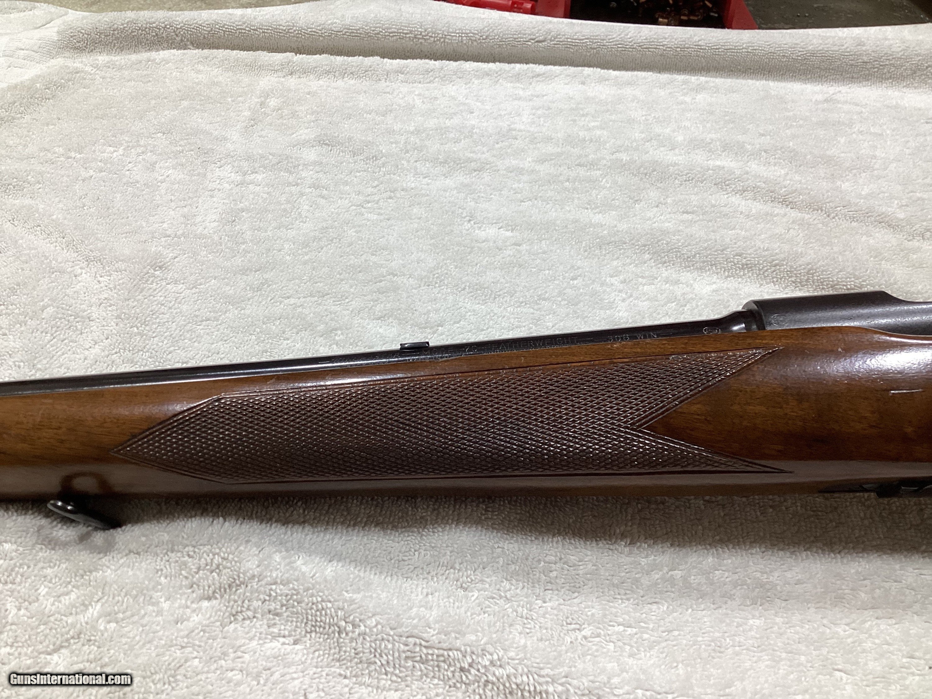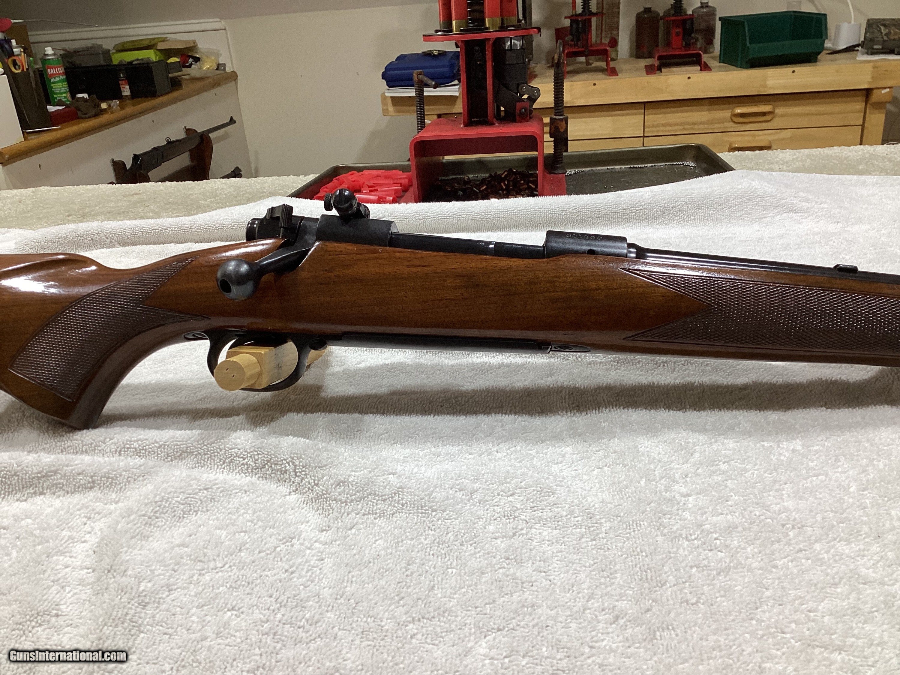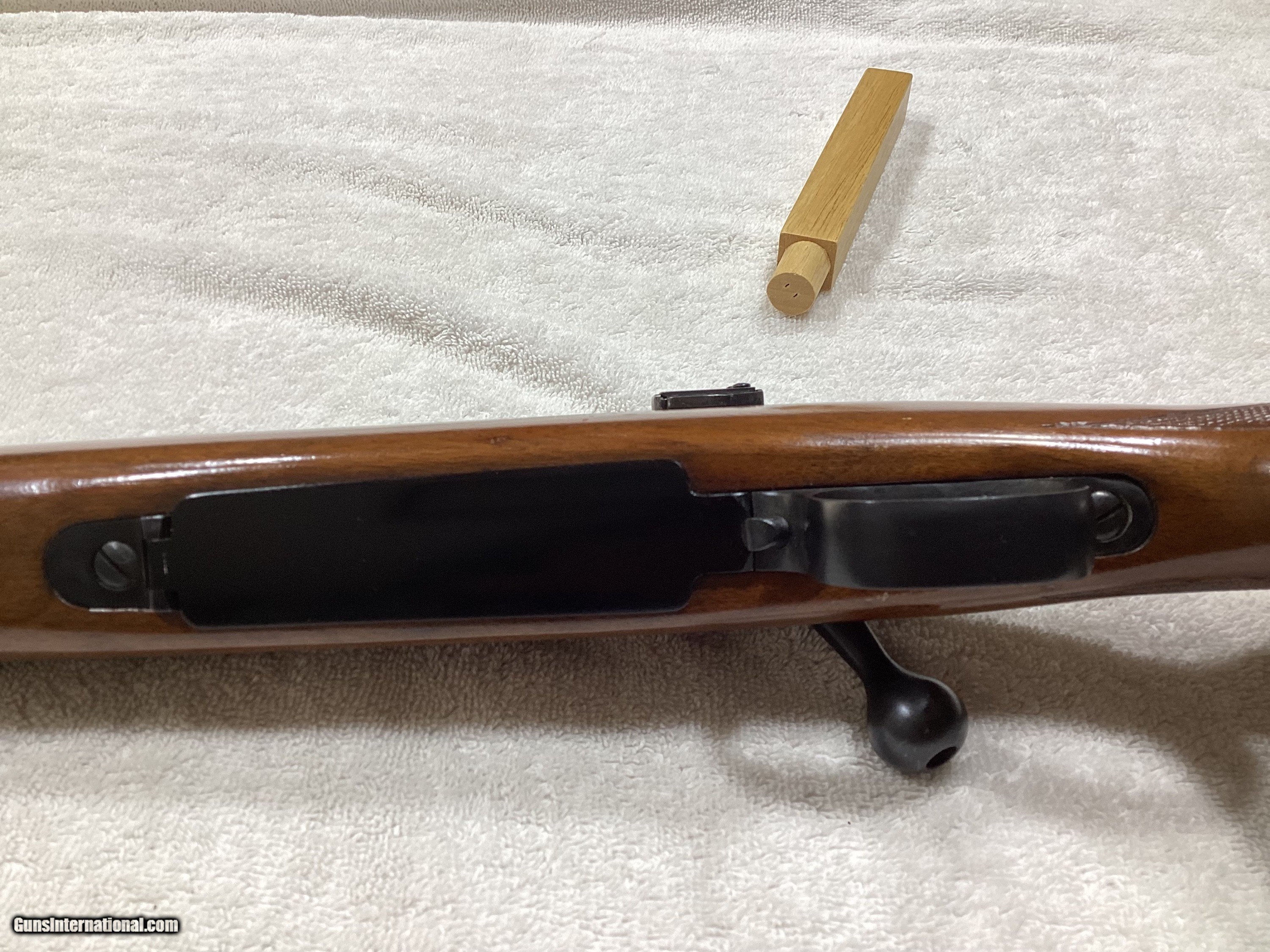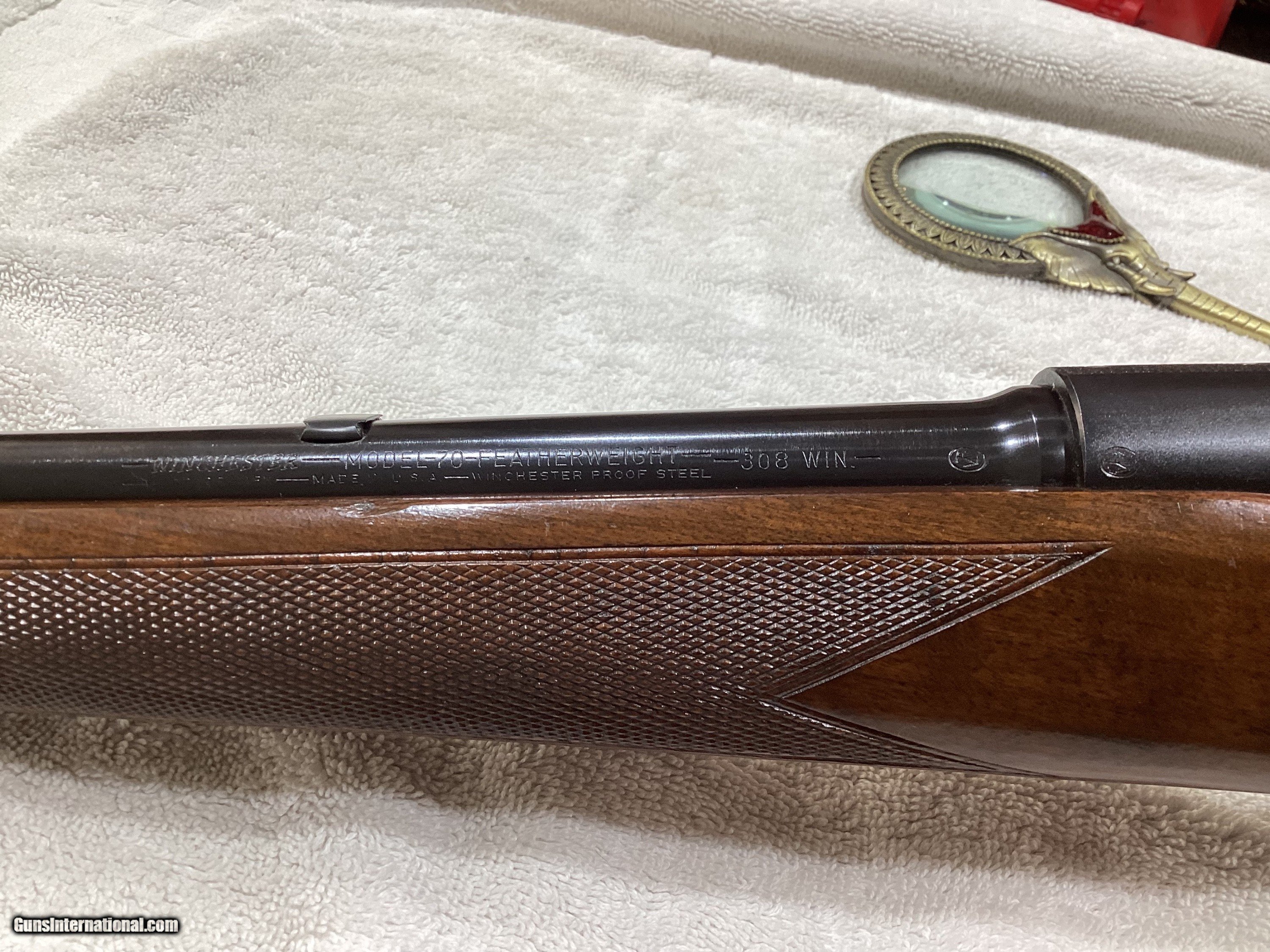 Description: Winchester pre 64 Model 70 Low Comb Featherweight, serial #301xxx, .308, manufactured 1953. This early featherweight retains 98% of the original factory blue. There are a couple of very minor handling marks, which you have to search for to notice. The wood retains 96% finish and exhibits several handling marks almost all of which are unobtrusive. There is one dent on the left forearm just below the rear sight blank. The checking is undamaged and crisp throughout. An era Redfield peep sight is installed and it is in excellent condition. A very handsome, early Featherweight with the rare low comb stock configuration. SOLD Curio/Relic: Yes |