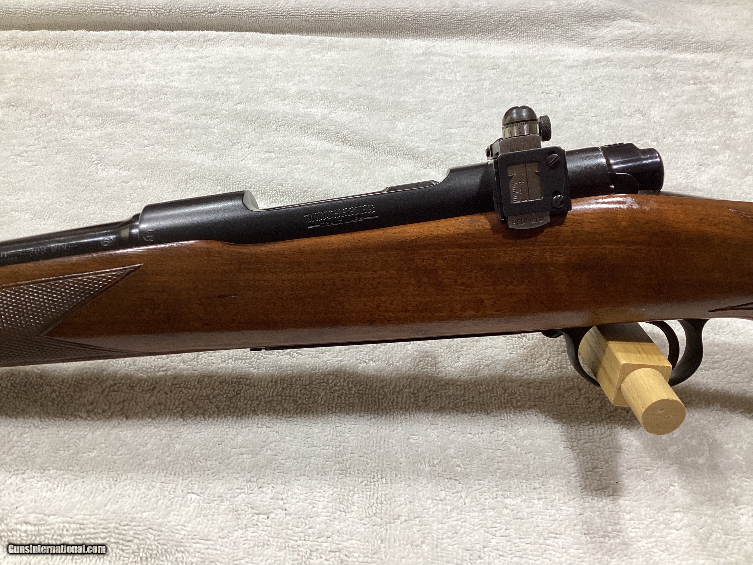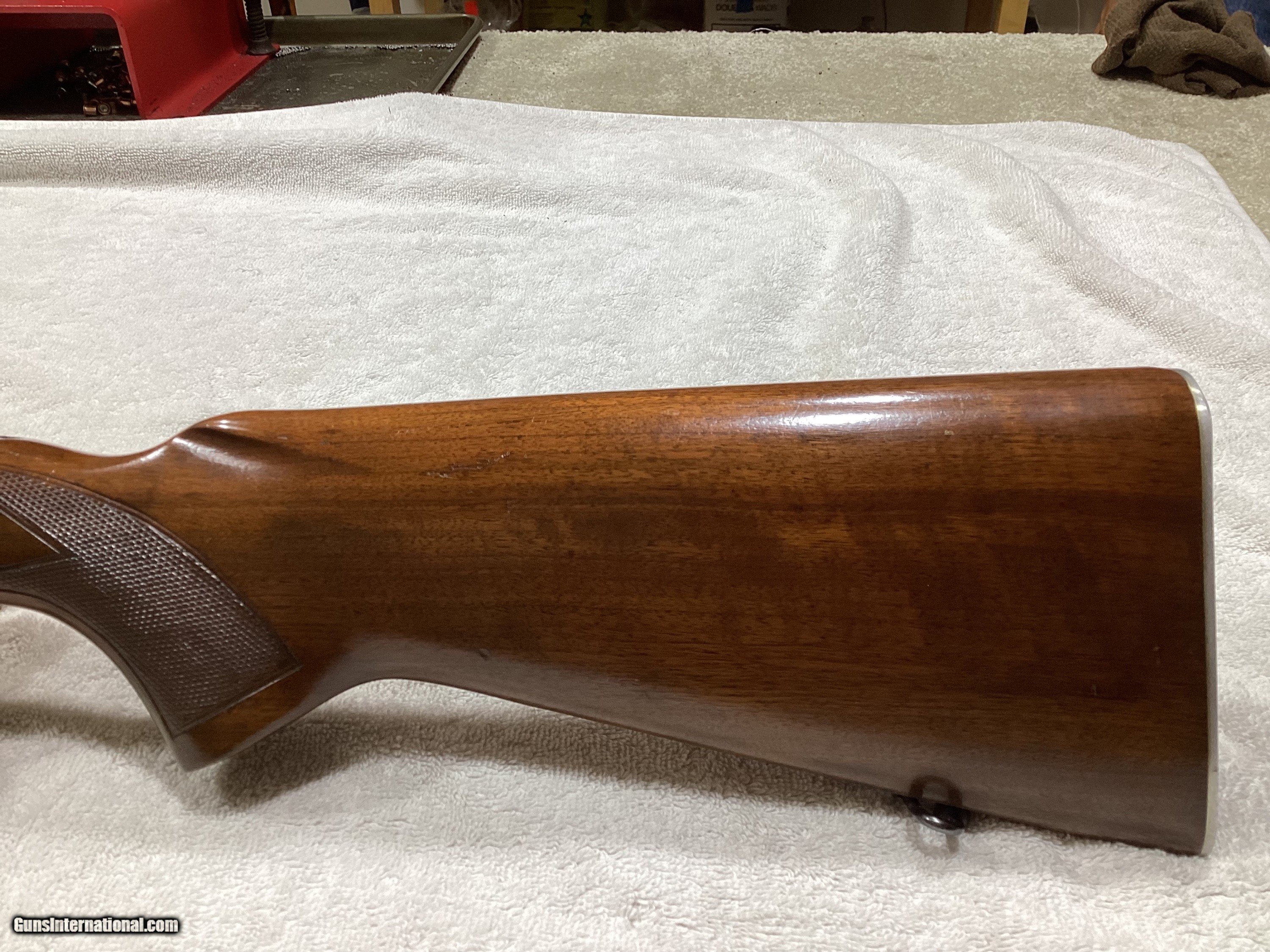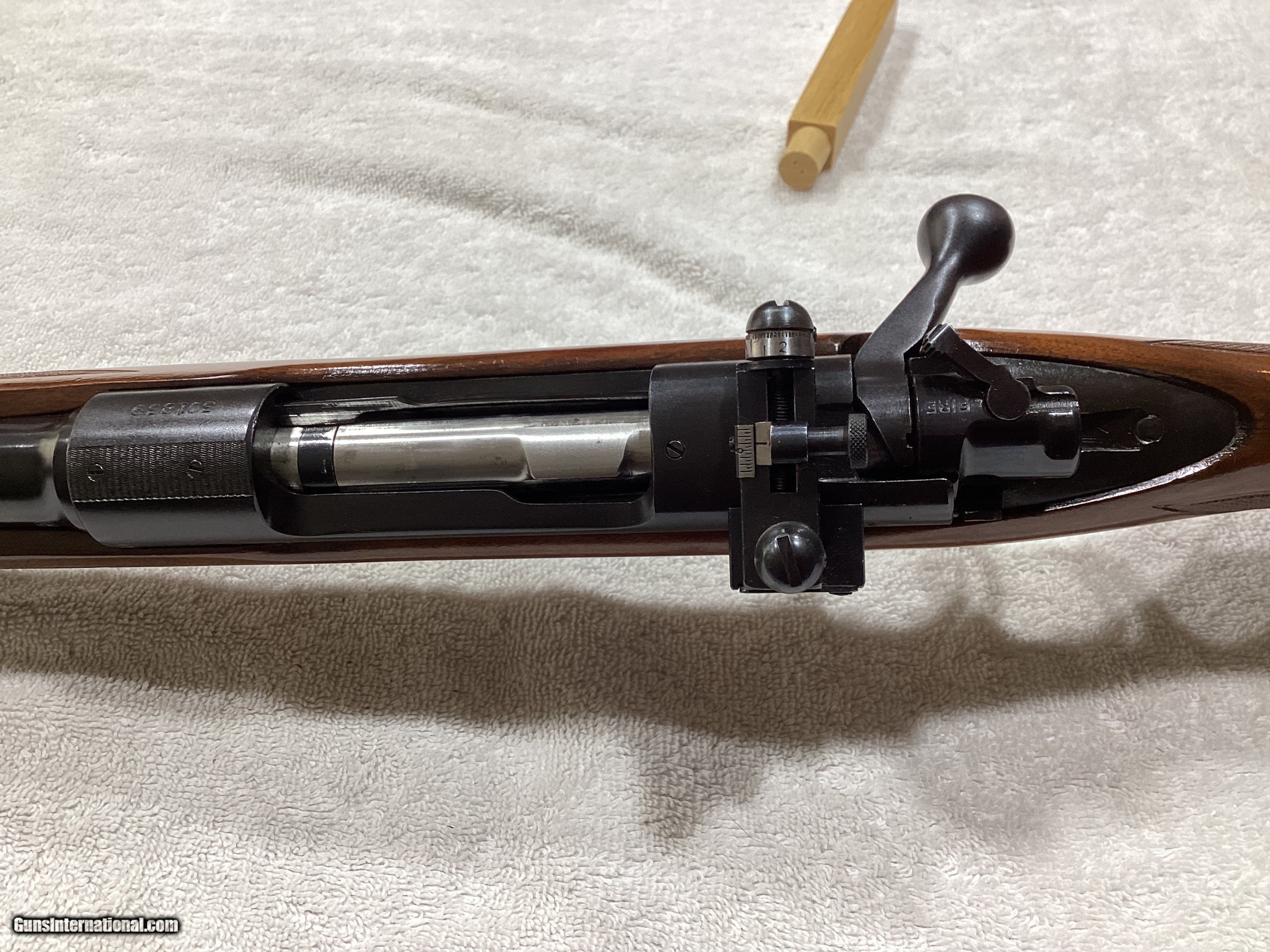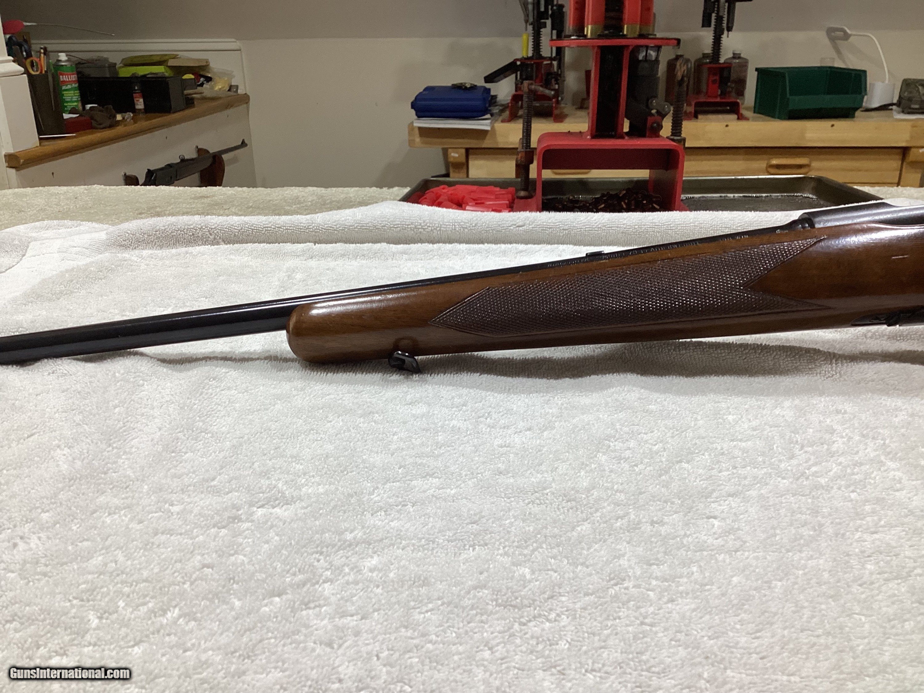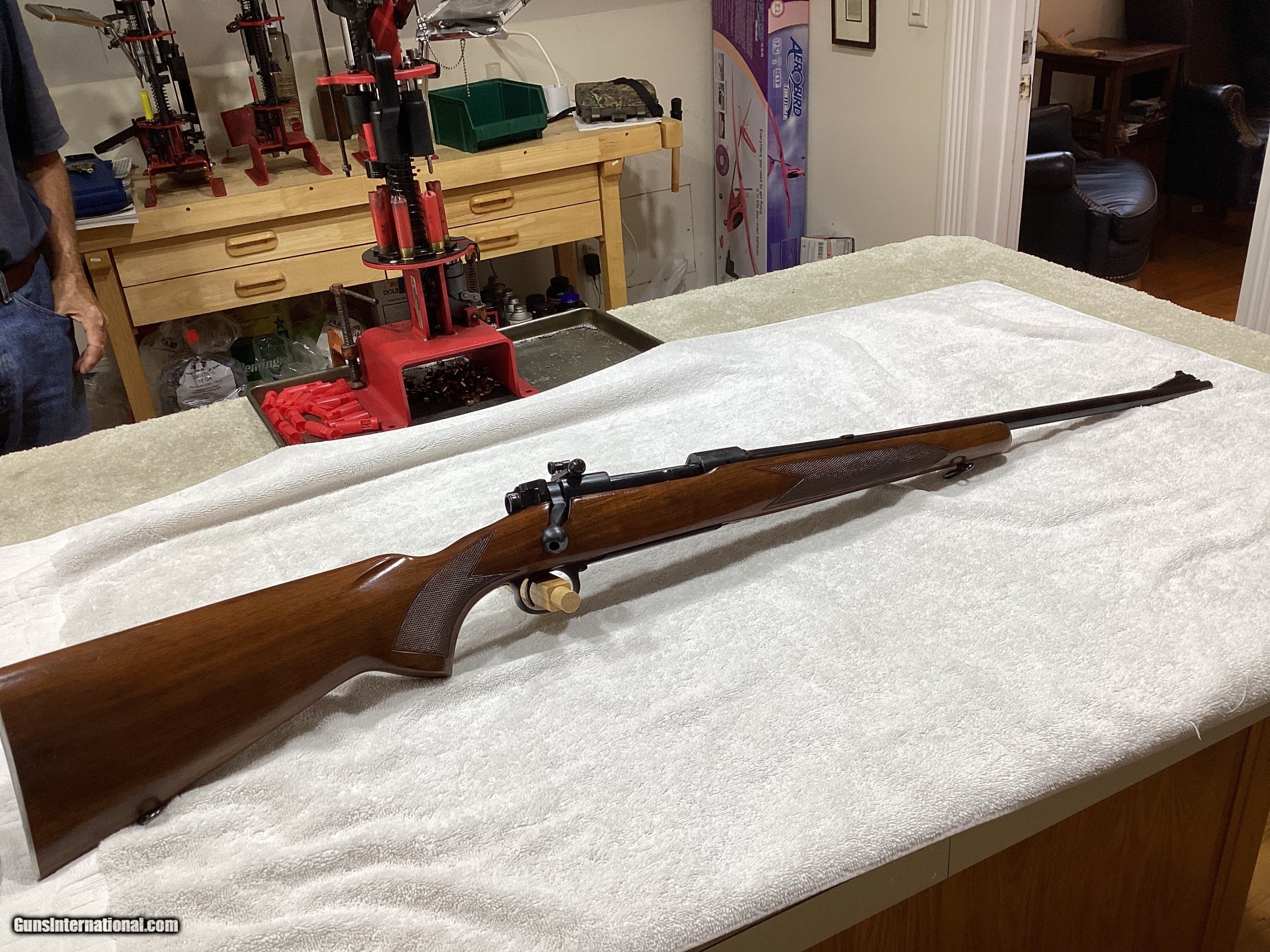 Description: Winchester pre 64 Model 70 Low Comb Featherweight, serial #301xxx, .308, manufactured 1953. This early featherweight retains 98% of the original factory blue. There are a couple of very minor handling marks, which you have to search for to notice. The wood retains 96% finish and exhibits several handling marks almost all of which are unobtrusive. There is one dent on the left forearm just below the rear sight blank. The checking is undamaged and crisp throughout. An era Redfield peep sight is installed and it is in excellent condition. A very handsome, early Featherweight with the rare low comb stock configuration. SOLD Curio/Relic: Yes |