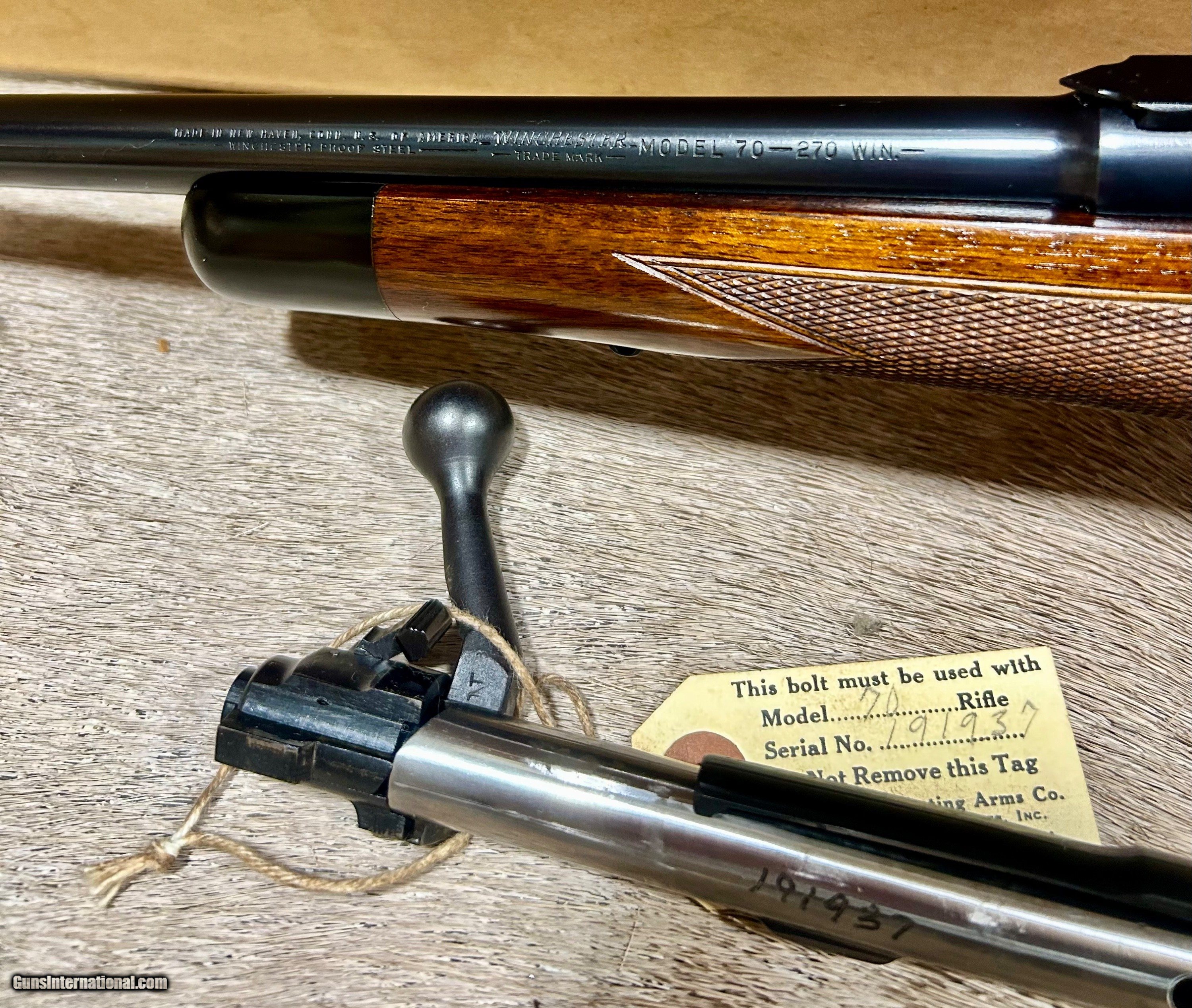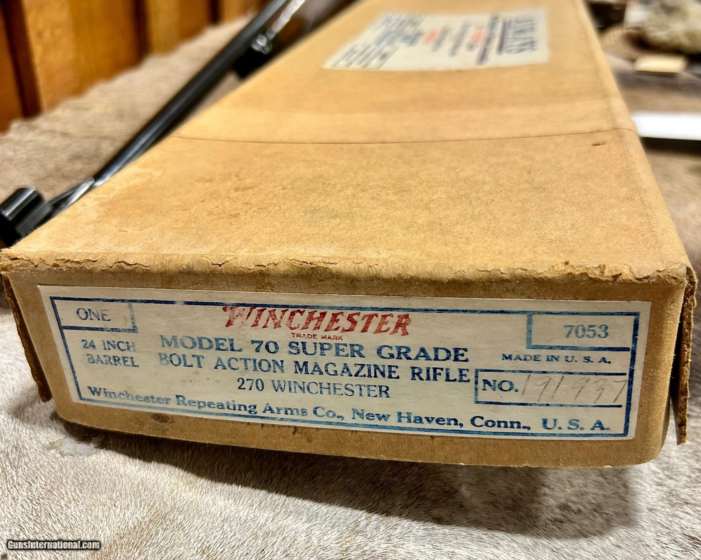 Description: *****SOLD****Up for sale I have an extremely nice Winchester Pre 64 model 70 chambered in 270. This is a Super Grade model made in 1952 and is still in its original box. This rifle is in 100% mint and original condition right down to the correct rear sight and front sight hood. You just don't know how rare of a find that this is, Super grade model 70s still in there original boxes just don't exist anymore. This rifle has its original bolt tag, manual, sling and sling swivels included. This rifle has never been scoped nor does is appear to have ever been fired. Shipping and ins will be $95 and to FFL or C and R license holder only. Please don't hesitate to ask any questions or request anymore photos. SOLD