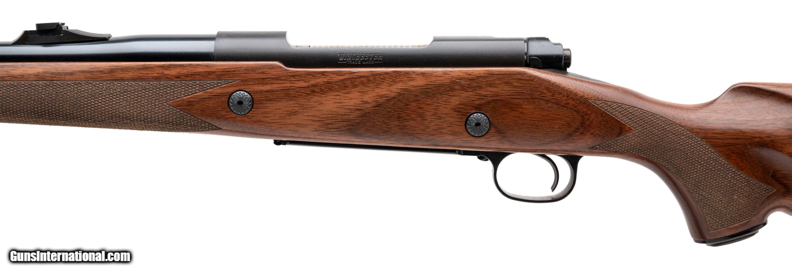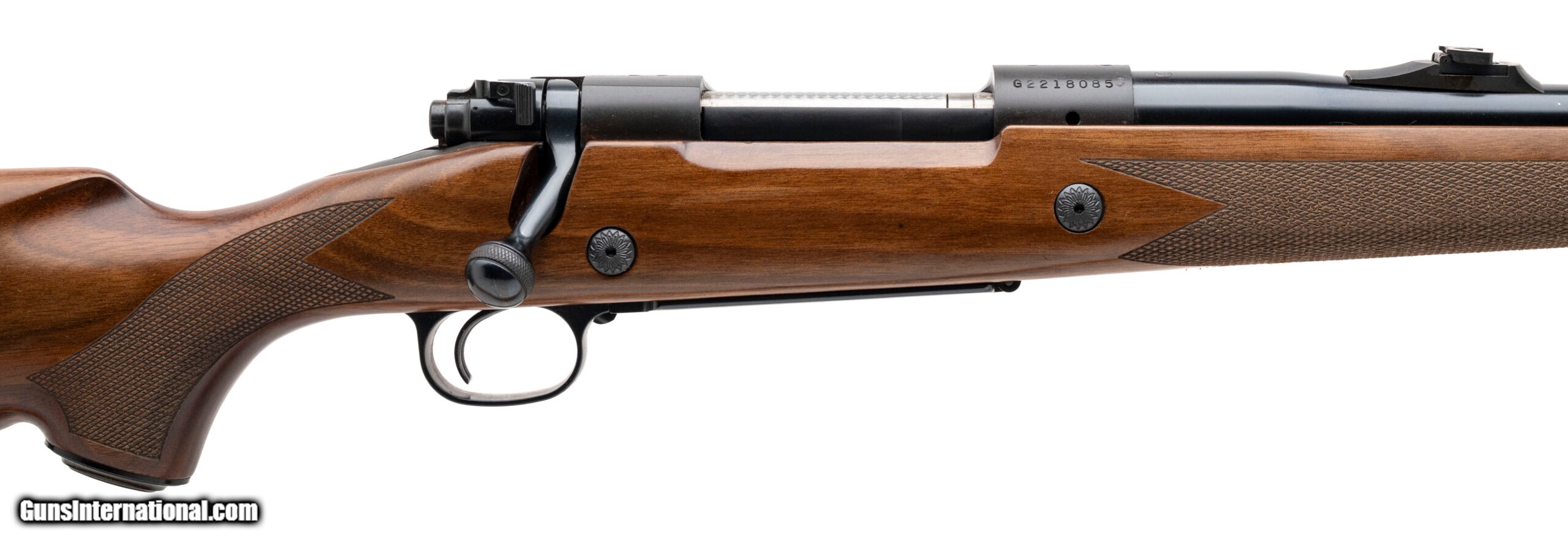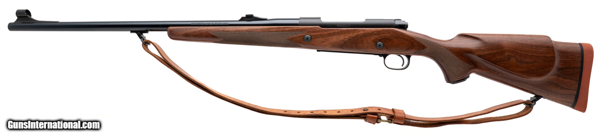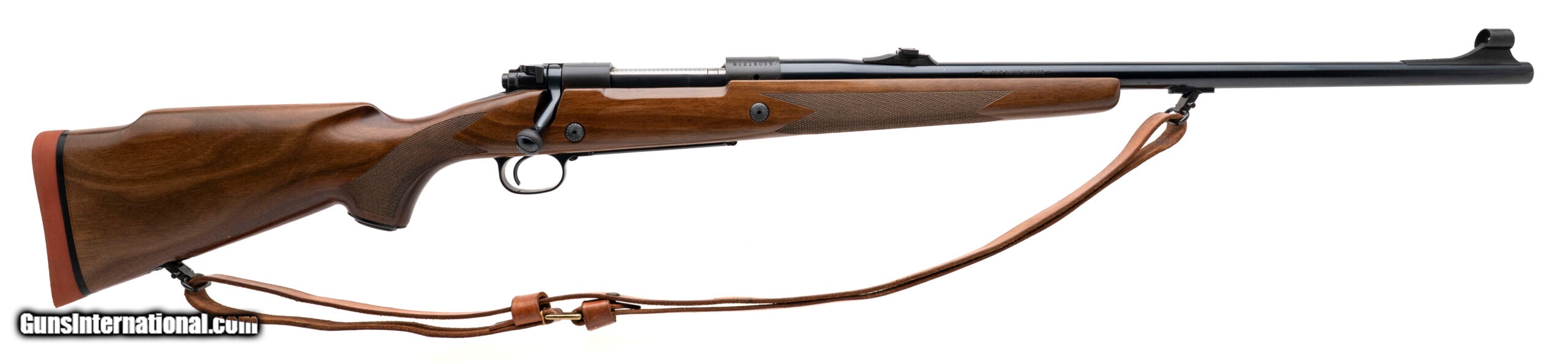 Description: "Sn: G2218085, modern production bolt action dangerous game rifle chambered in 375 H&H Magnum with a 24" round barrel with a hooded front ramp sight, rear island with adjustable flip up sight and barrel mounted sling swivel. Control round feed action with full length claw extractor, hinged bottom metal and 3 position safety. Blued barreled action and jewelled holt are in near excellent condition with minimal handling marks. Checkered walnut stock with the factory Winchester recoil pad, 2 engraved cross bolts and inlet rear sling swivel is also in near excellent condition and the bore is bright with strong rifling. Comes with leather sling. SOLD |