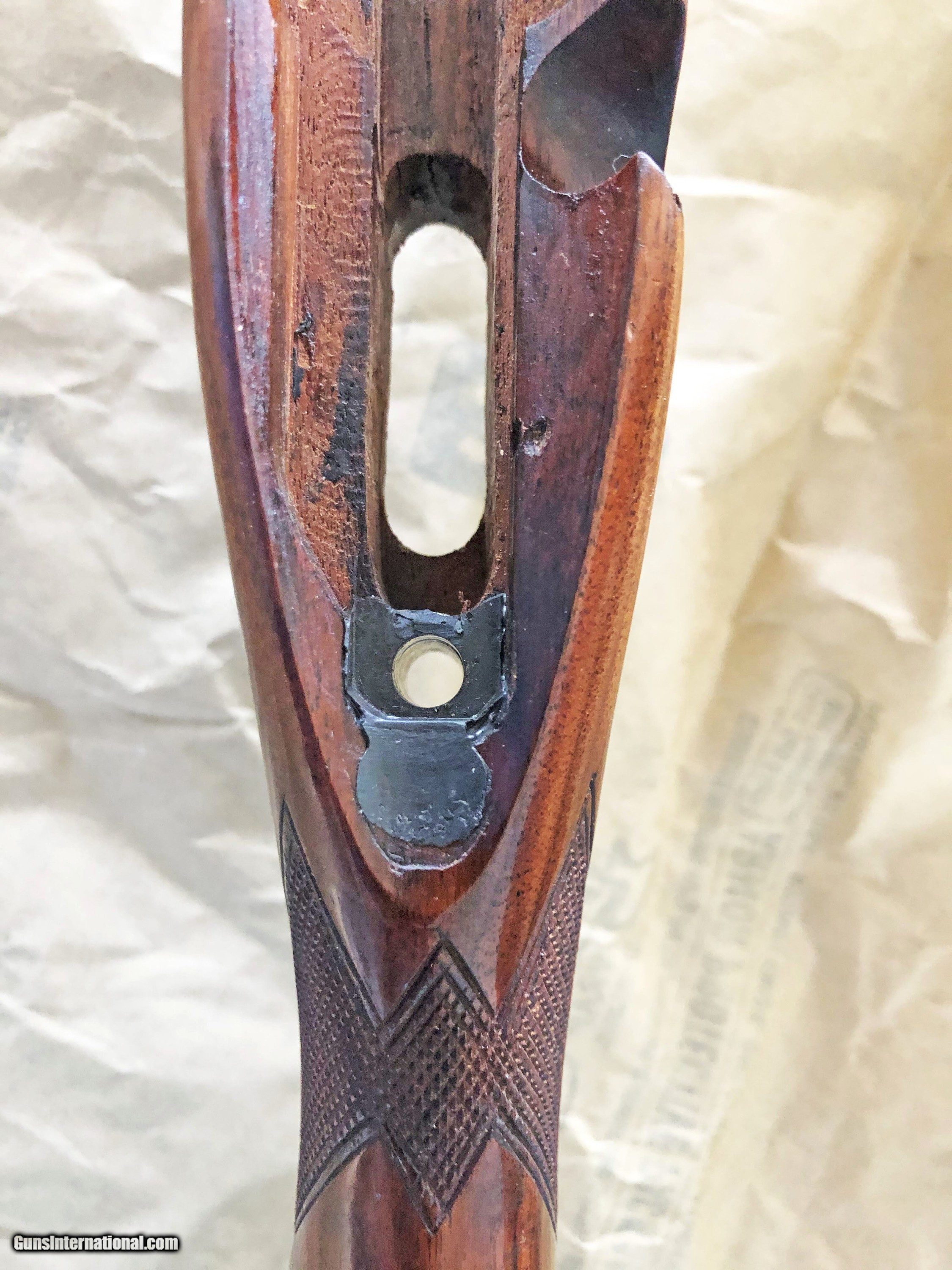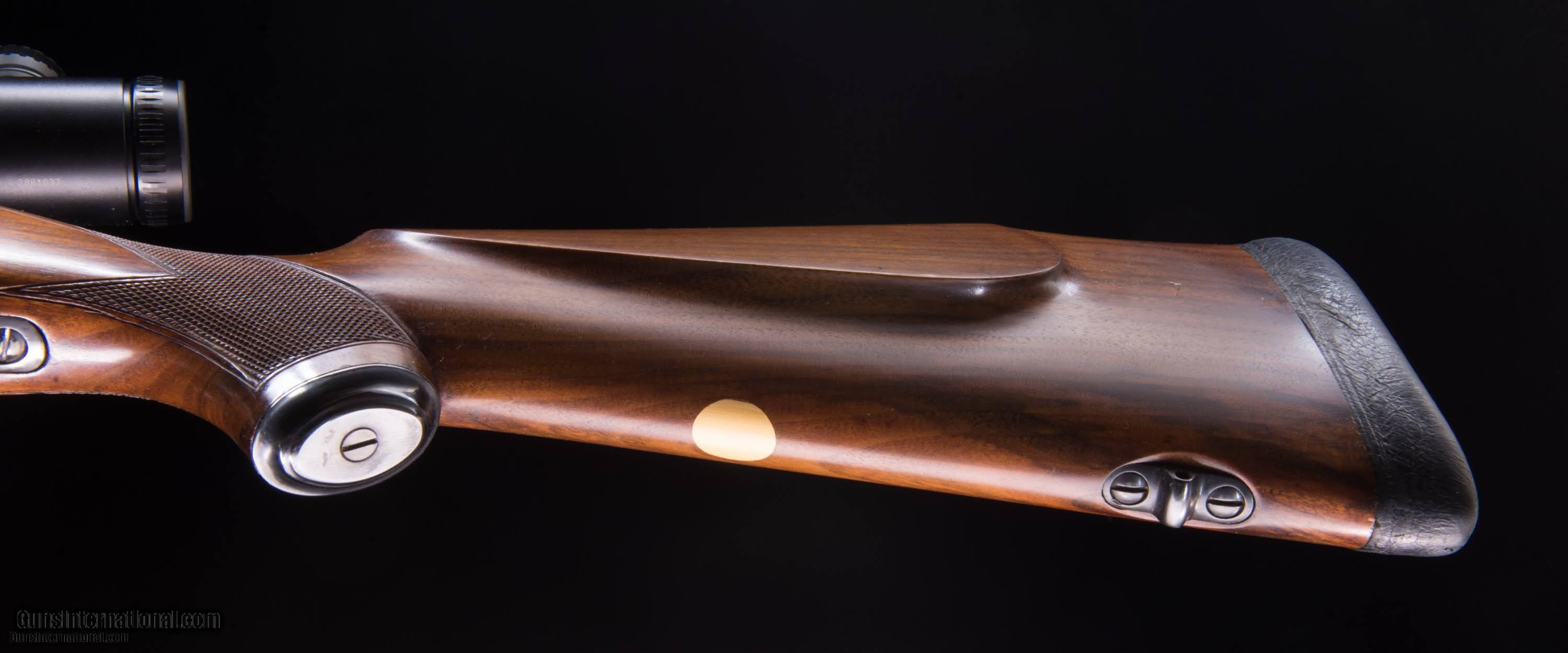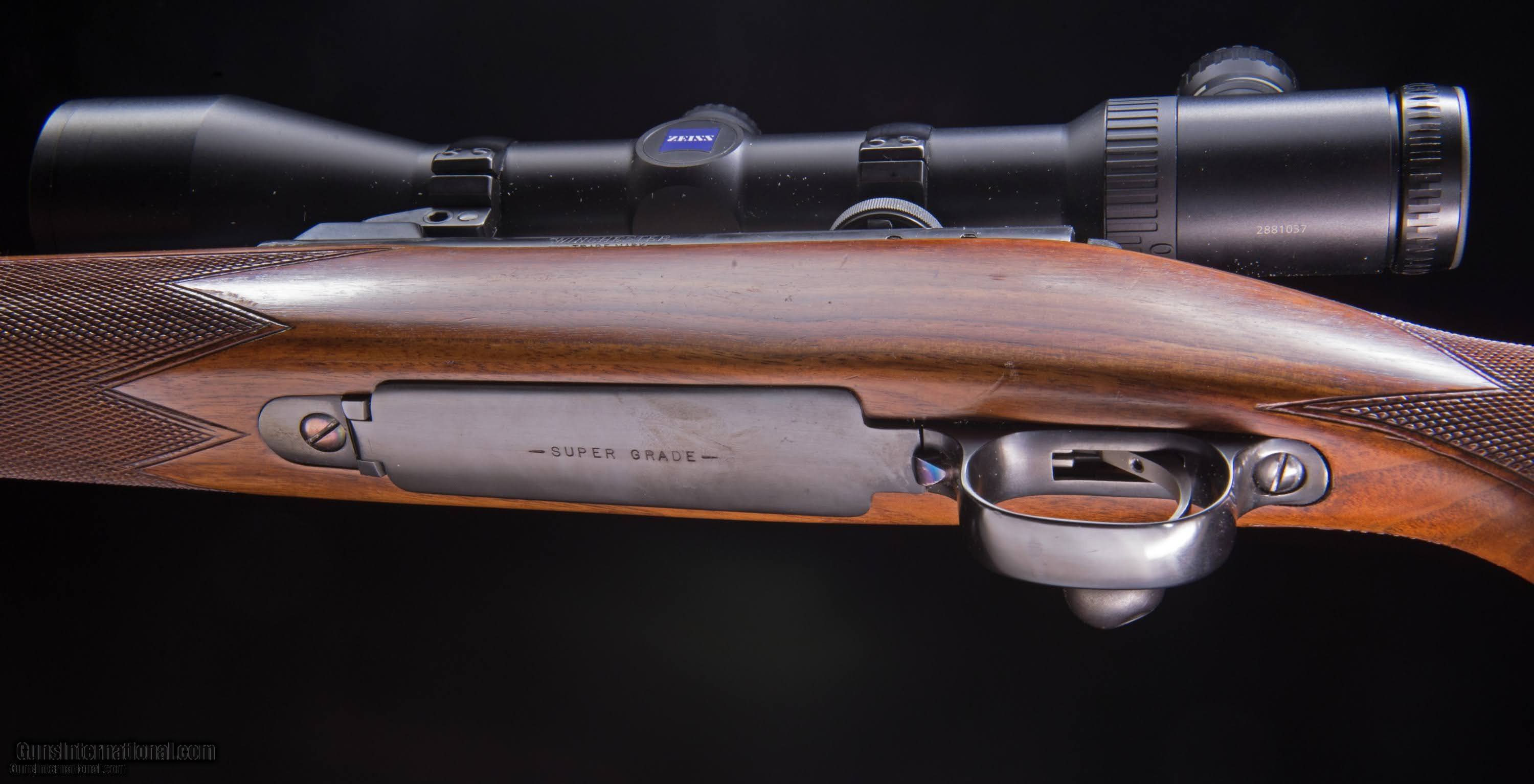 The stock is original Super Grade with the exception of the accessorizing work done by Hartmann & Weiss. As a Super Grade, it has the Monte Carlo comb with cheek piece, a black forearm tip, a factory pistol grip cap, and hand checkering that is much more extensive than Winchester Pre-64 Model 70 Standard Rifle. The SG checkering wraps over the wrist forming a diamond shape on the wrist, extends to the pistol grip cap and wraps around the forearm forming a diamond shape of wood surrounding the SG 24” barrel’s hold-down screw. It is typical rich dark walnut with characteristic SG wood figure from that period. The floor plate carriers the correct Super Grade inscription. The bolt and extractor are jeweled and the stock is fitted with the correct pair of two-screw hold swivel bases & swivels.