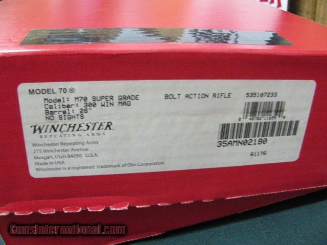 Description: 7186 Winchester 70 SUPERGRADE 300 WIN MAG 26 inch barrel, CLAW EJECTOR, SUPER GRADE ON BOTTOM OF FLOOR PLATE--AAAA++++HIGH FANCEY HEAVILY FIGURED WALNUT,,, BEST I HAVE SEEN. NEW IN BOX, BOLT NEVER PUT IN. NONE FINER... this walnut is the most highly figured i have seen...MAGNIFICANT---BOLT NEVER PUT IN--NONE FINER SOLD |