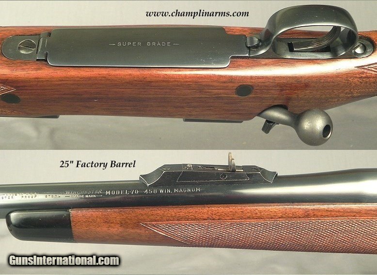 WINCHESTER 458 WIN. MAG. MOD 70 PRE-64 SUPER GRADE AFRICAN- 98% BLUE OVERALL- ORIG. WOOD FINISH at 97%- 1957- THE BORE is EXC.- SLING SWIVELS