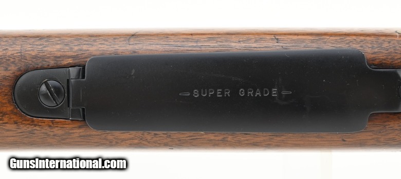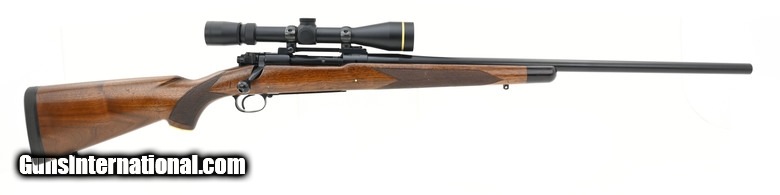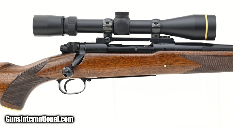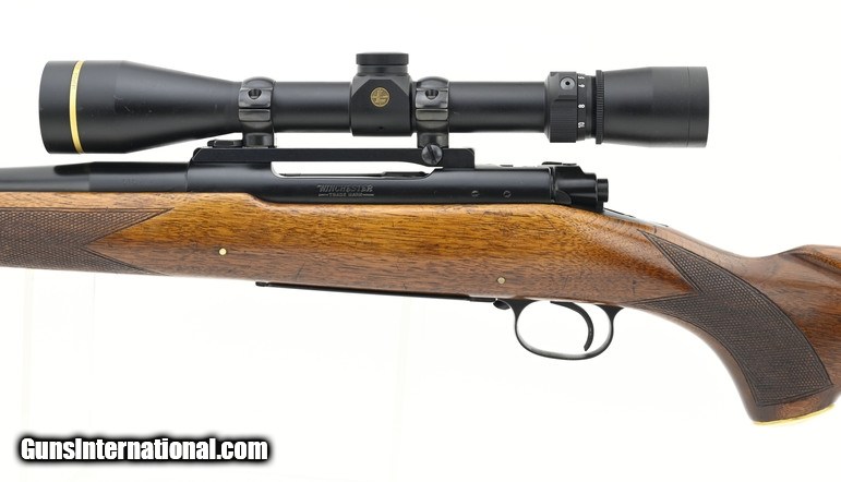 Description: Winchester 70 .375 H&H Magnum caliber rifle. Pre-64 Super Grade made in 1954. The barrel is a custom modern replacement, and the gun has a modern black finish. The stock has an ivory pistol grip cap and a rubber recoil pad added. Has a Leupold 3.5-10X scope. An interesting set up, in very good condition.