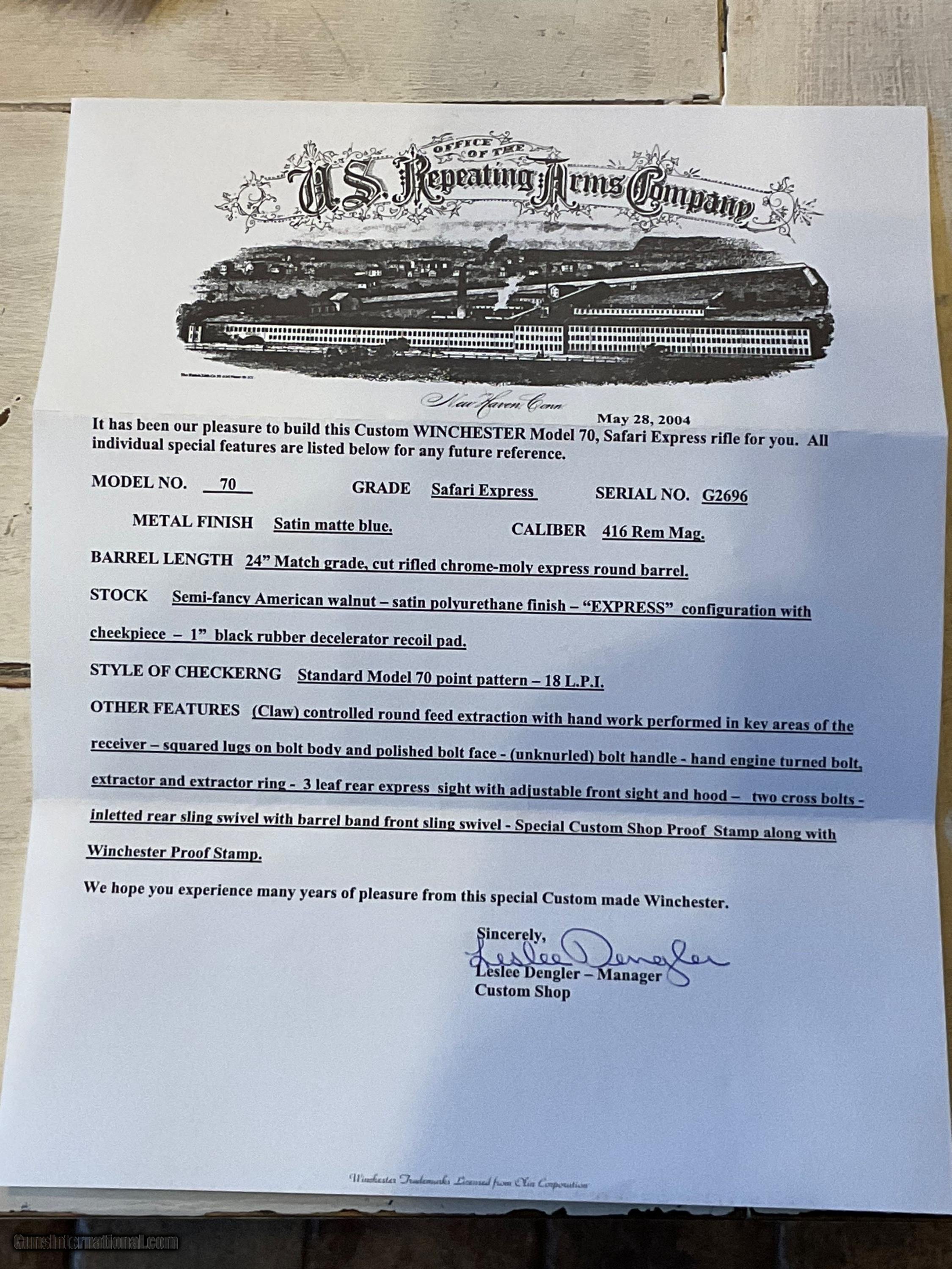 Description: Very hard to find Winchester Custom Shop Safari Express new unfired with all paperwork and Custom Shop letter. Built in 2004 when the custom shop was using Krieger match grade barrels. See the pic of the Custom Shop letter for all the details. SOLD Rifle Caliber: .416 Remington Magnum Manufacturer: Winchester Custom Shop Model: 70 Serial Number: G2696 Barrel Length: 24” Condition: Mint |