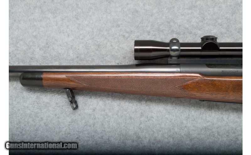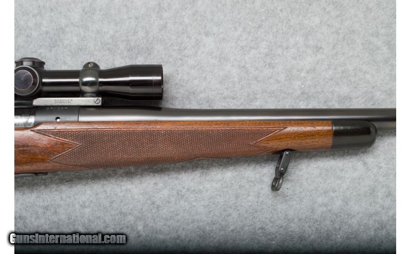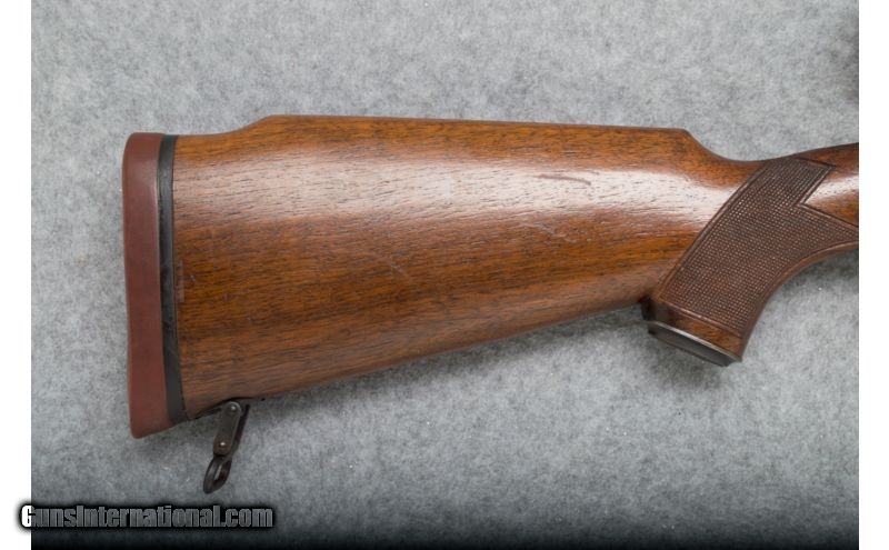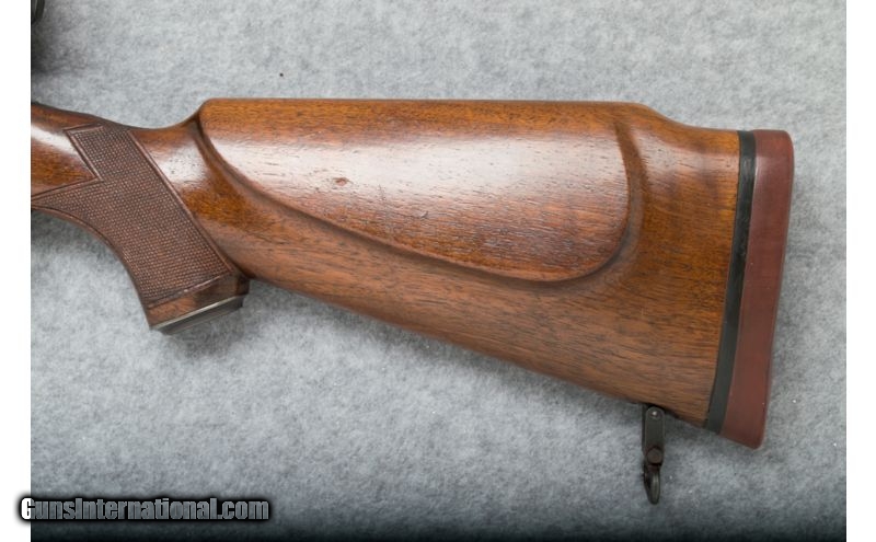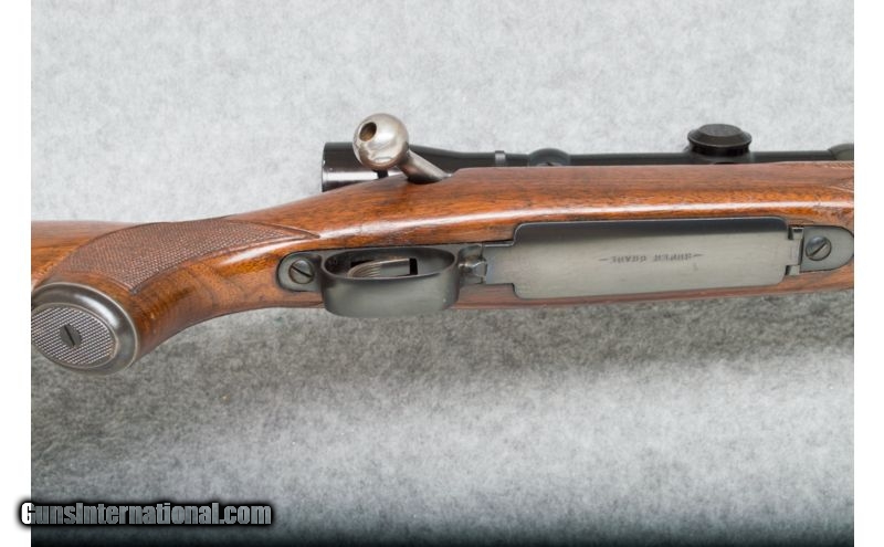 Description: A really nice Pre-64 Model 70 with period appropriate scope! SOLD Caliber Info: .375 H&H Mag. Metal Condition: Excellent Wood Condition: Very good; minor wear and handling marks Bore Condition: Clean and sharp Barrels: 22 Triggers: Grooved target style Stock: Checkered pistol grip walnut with cheekpiece Stock Dimensions: LOP - 12 3/4 Fore End: Checkered walnut with black end cap and steel grip cap Butt Pad: Red rubber pad Weight: 9 lbs. 6 oz. Sights: No rear sight; ramp front; Leupold scope Extras: Leupold Mountaineer 4x scope with Buehler mounts. Item Location: Sun Prairie, WI |