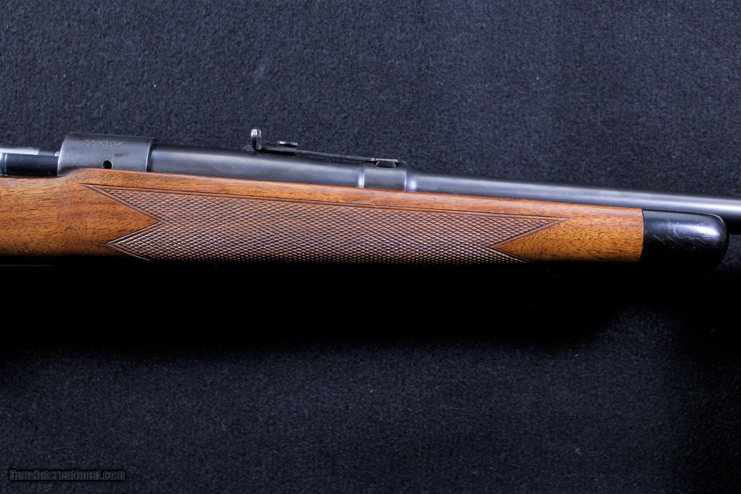 Description: Gorgeous Winchester M70 Super Grade chambered in 7MM Mauser. Rifle was manufactured in 1949. Wood stock shows some minor handling marks, no cracks, chips or missing pieces. Checkering has remained crisp. Bore is bright and clear with sharp rifling. Mechanically excellent. Dimensions are as follows; BBL. 24" WT. 8lb. 7oz. DIM. 13 1/2" L.O.P. SOLD |