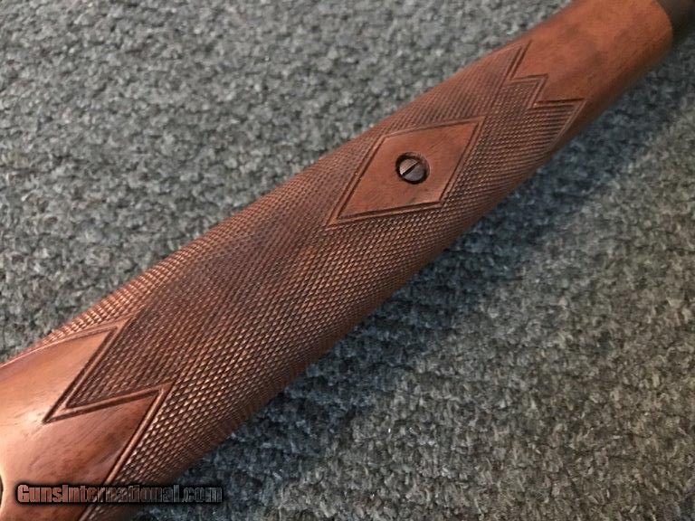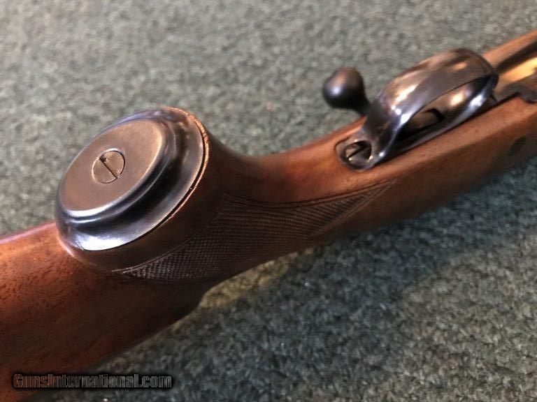 Description: Winchester, Mdl 70 Pre 64, .458 African gun, Super grade, made in 1955, only 1,226 produced, excellent wood with light handling marks, Monte Carlo fiddle back stock, 25" barrels, 13 3/4" length of pull, all original, factory original super grade swivels, steel pistol grip cap. Serial # 367939. For further information call John at 941-748-7318. SOLD |