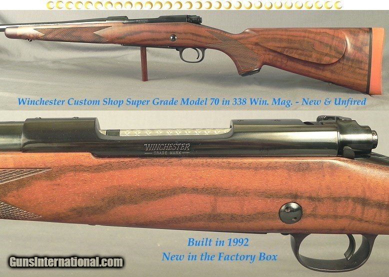 WINCHESTER MOD 70 338 WIN. MAG. CUSTOM SHOP SUPER GRADE- 100% NIB- 1992- 24" HAND LAPPED Bbl.- HAND HONED ACTION- CONTROL FEED- NICE WOOD- BEDDED