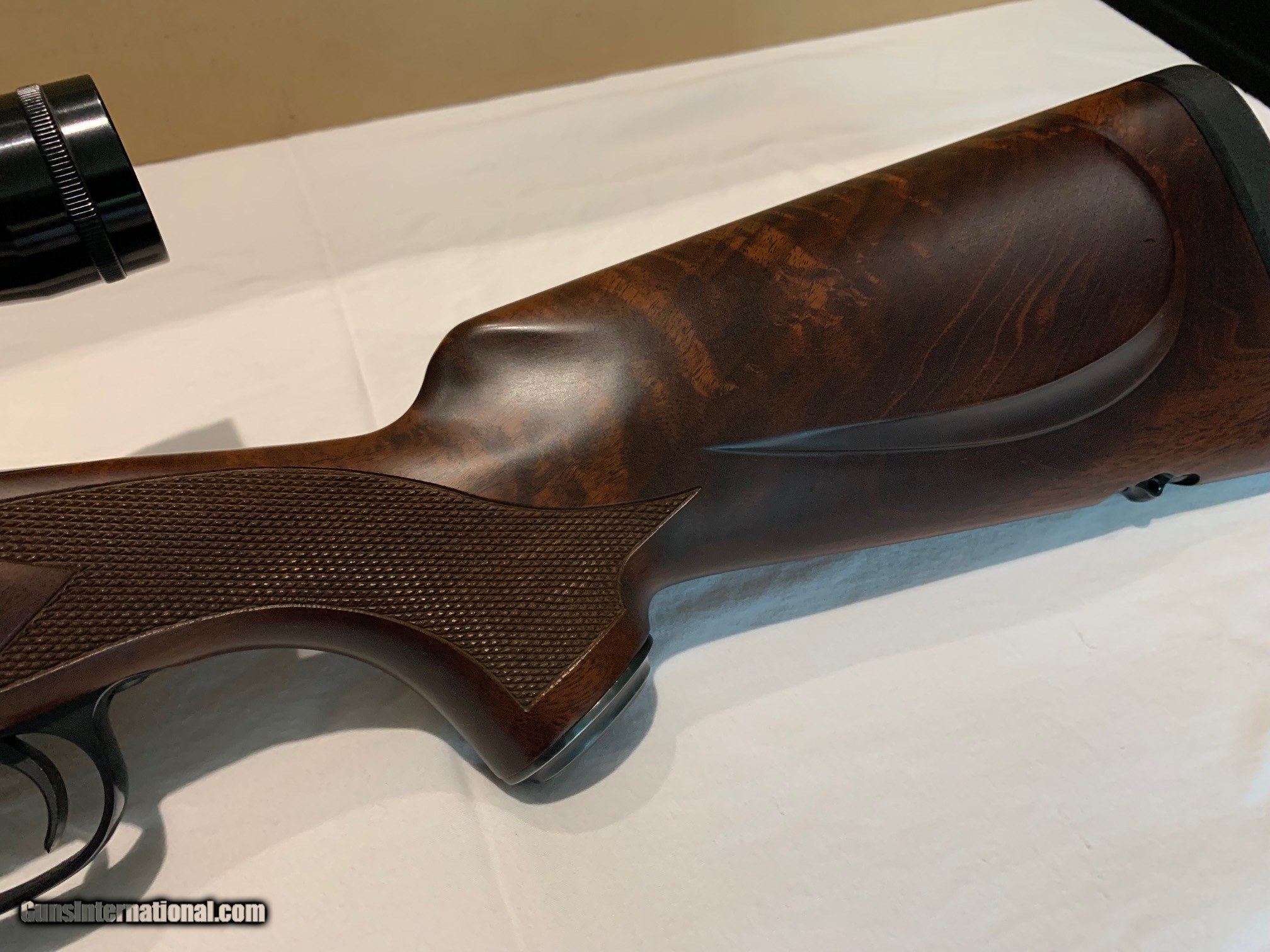 Description: Winchester Model 70 Super Grade 30/06, high polish blue, fancy stock with beaded cheekpiece, wrap checkering, ebony forend tip, jeweled bolt,super grade swivels and floorplate with Leupold Vari X II 3x9 in excellent condition. Includes original box, info, and lock. SOLD Rifle Caliber: .30-06 Springfield Manufacturer: Winchester Model: 70 Super Grade Bore Condition: Excellent |