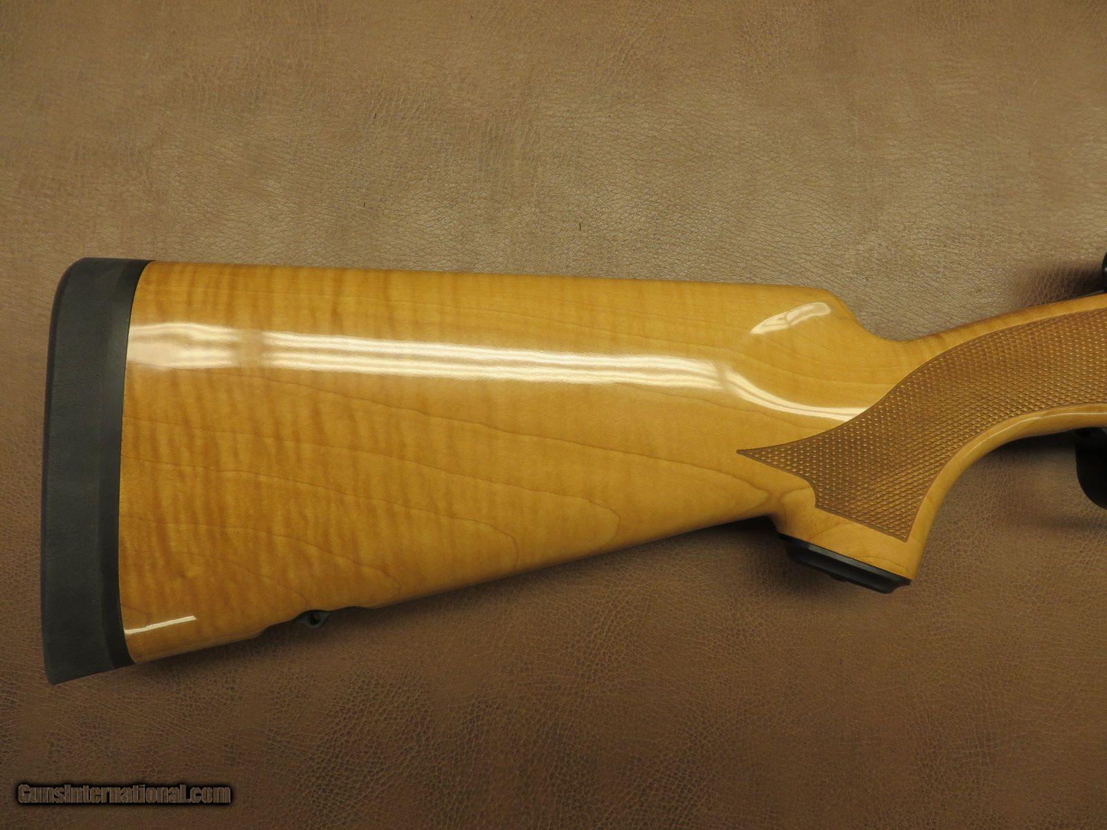 Description: .243 Winchester with 22 inch barrel. High polish blue. Jeweled bolt. Weaver scope mounting bases added. High gloss checkered maple stock has black forend tip, pistol grip cap, cheekpiece, super grade inlet sling swivel attachments, and rubber recoil pad. Looks new in original box with papers and lock. SOLD |