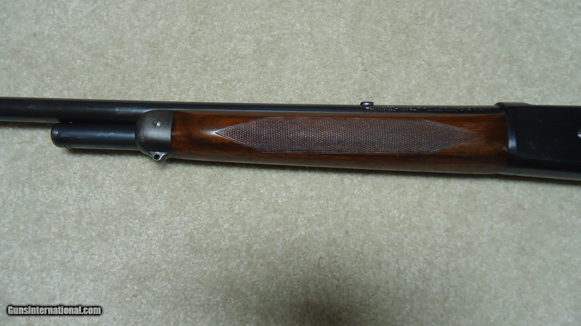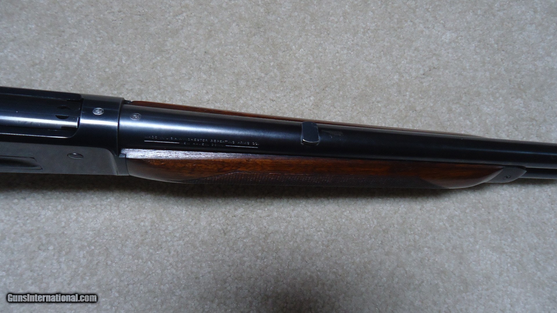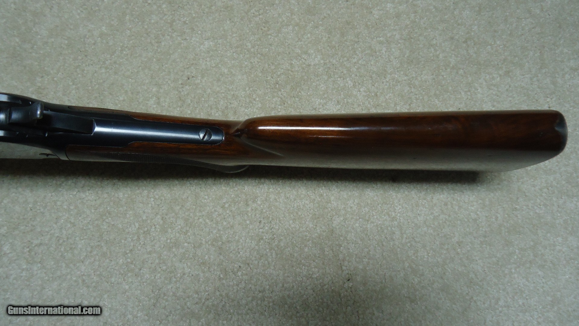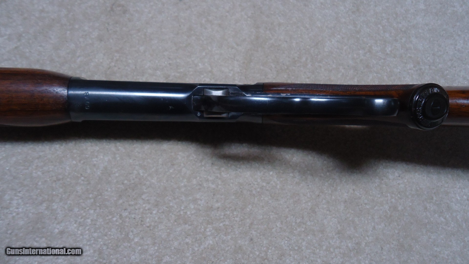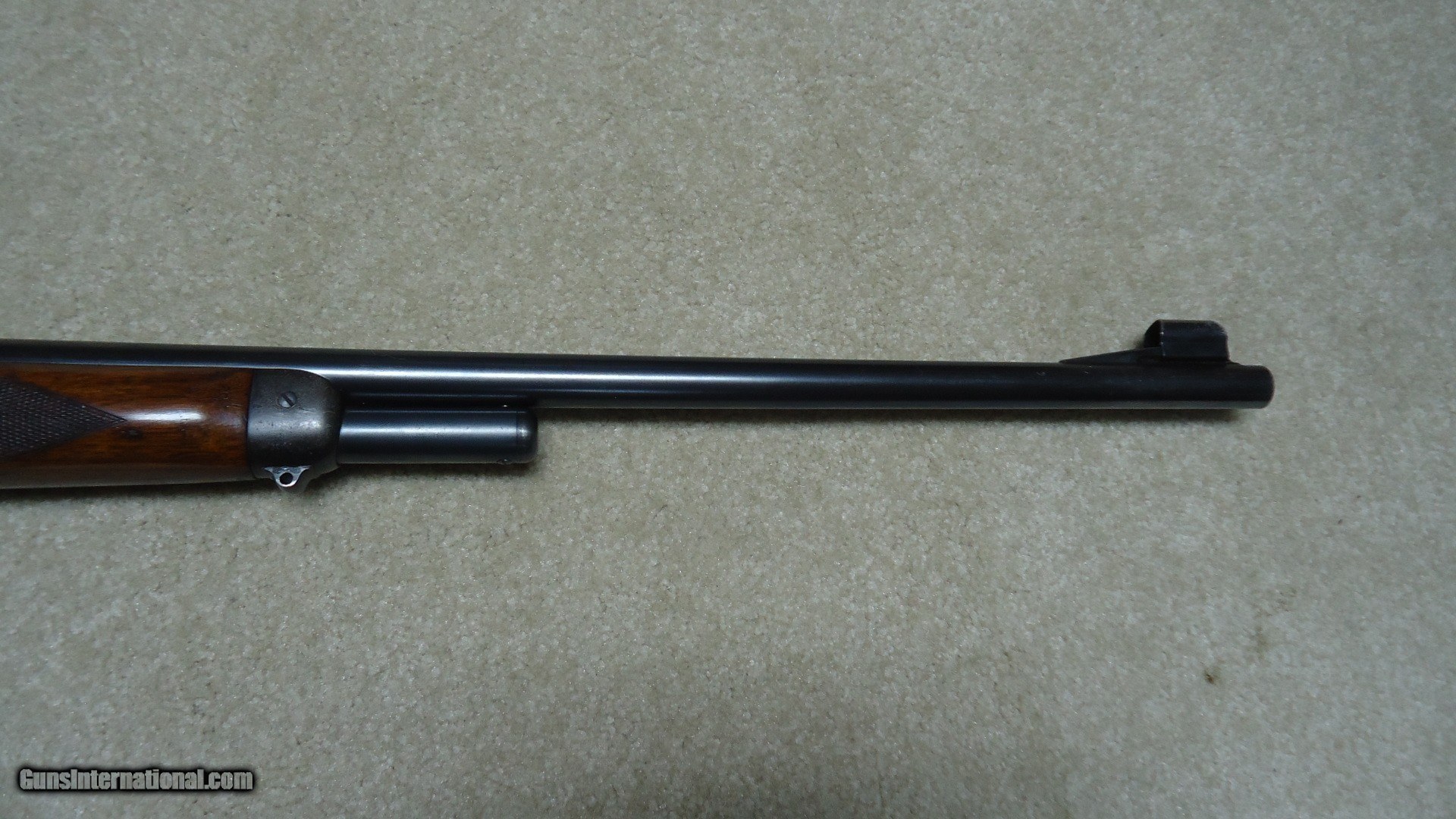 Description: FIRST YEAR PRODUCTION, LONG TANG MODEL 71 DELUXE .348 CALIBER RIFLE WITH BOLT PEEP SIGHT, SUPER GRADE SLING SWIVELS AND SLING, #6XXX, MADE 1936. These pre-war M-71s are getting hard to find, especially in this excellent condition. The receiver retains most of the original bright deep blue with only the most minor of flaking on the rear portion of the loading gate and some miniscule slight scratches- even the upper tang and bottom of the receiver have bright blue. The barrel and mag tube also retain deep blue with barely some minor scuff marks probably from standing in a rack- one must look closely to see this. The forend cap blue is thinning and mixing a bit plum. Excellent wood with sharp checkering and most of the original finish intact, correct checkered steel butt plate and Winchester embossed hard rubber pistol grip cap. Bolt peep sight with hooded front sight and blank filler in the rear sight dovetail. Minty bright bore. A superior first year, 85 year old deluxe M-71. SOLD Curio/Relic: Yes Rifle Caliber: .348 Winchester Manufacturer: Winchester Model: M-71 DELUXE Serial Number: 6XXX Barrel Length: 24 Condition: EXCELLENT Bore Condition: EXCELLENT |