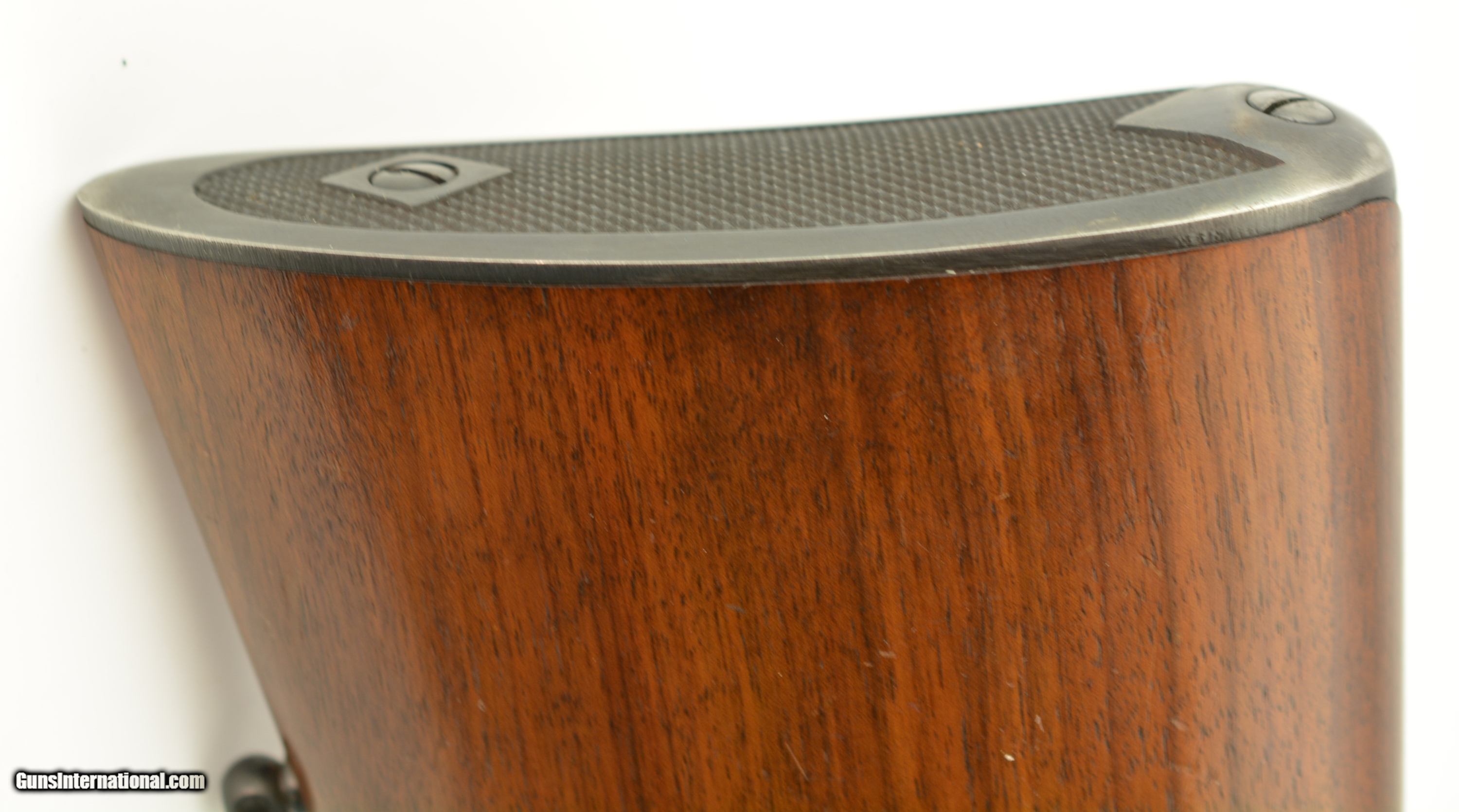 Description: Serial #41911, .348 Win., 24" barrel with an excellent, bright bore. This is a 1955-made rifle that has retained 95-97% of the original blue finish with some silvering present on the exposed portion of the magazine tube, as well as some small handling marks through the blue on the barrel and frame. The walnut forend and buttstock are in fine shape with small handling marks and surface blemishes in the old oil finish. The rifle has the original hooded front sight still in place, a blank fitted to the barrel dovetail, and a Lyman receiver sight installed on the left side of the frame. This is a splendid large game rifle for heavy brush, and is in fine-near excellent condition overall. FFL or C&R SOLD Curio/Relic: Yes Manufacturer: Winchester Model: 71 Serial Number: 41911 Caliber Info: .348 Gauge Info: .348 |