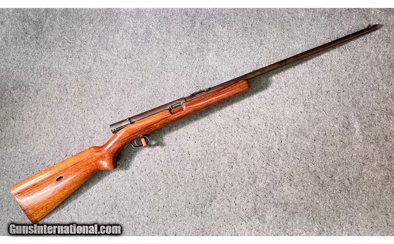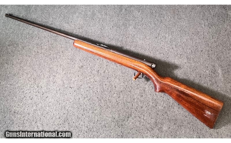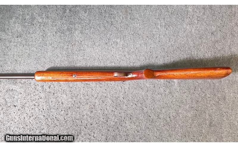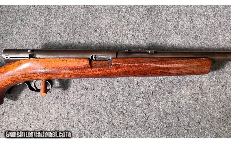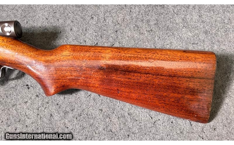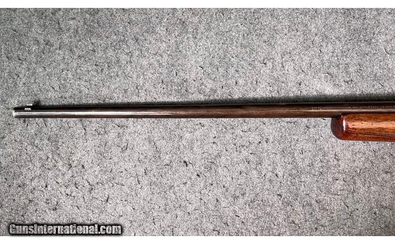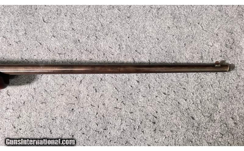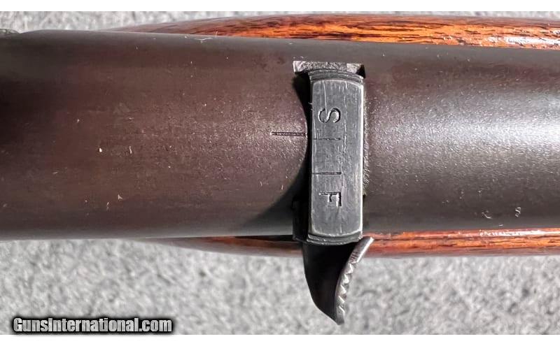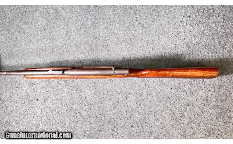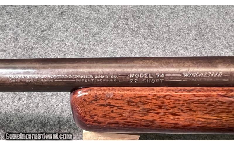 Description: This rimfire semi-automatic rifle is a Winchester Repeating Arms Co Model 74 chambered in .22 Short. It has a top-of-the-receiver safety slide switch, a fixed blade front sight, an adjustable u-notch rear sight, the original Winchester Repeating Arms checkered steel butt plate with the port for the tube magazine, and a fat, round fore arm. The barrel shows significant loss of bluing throughout, with numerous scrapes and marks. No apparent rust is observable, however. The metal has a great patina. The wood butt stock shows significant wear and numerous handling marks and scratches throughout, but no apparent cracks or chips. .22 Short SOLD Chambers: Side-of-stock loading tube magazine Metal Condition: "The barrel shows significant loss of bluing throughout, with numerous scrapes and marks. No apparent rust is observable, however. The metal has a great patina. Wood Condition: "The wood butt stock shows significant wear and numerous handling marks and scratches throughout, but no cracks or chips. Bore Condition: "Bore is somewhat dull, but shows good rifling intact Barrels: 24" barrel Triggers: Smooth trigger Stock Dimensions: "13½"" LOP, 43¾"" overall length Fore End: Smooth hardwood fore arm Butt Pad: Checkered steel butt plate with port for tube magazine Weight: 6 lb 3 oz Sights: "Fixed blade front sight, adjustable rear u-notch sight Item Location: Wichita, KS |