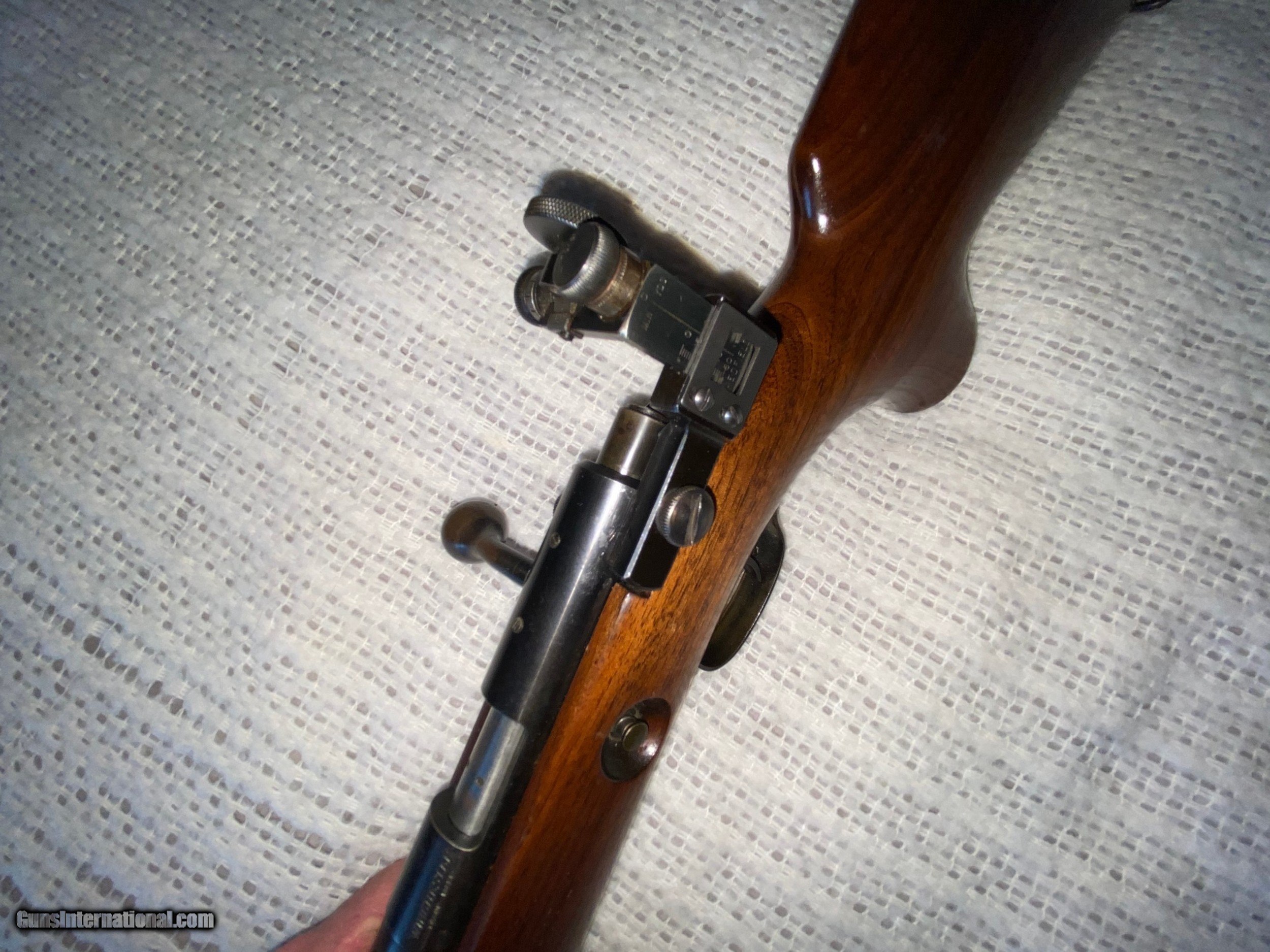 Winchester 22LR Target Model 75 bolt action rifle has a 28”barrel mounted with a rear Redfield sight. Gun is in