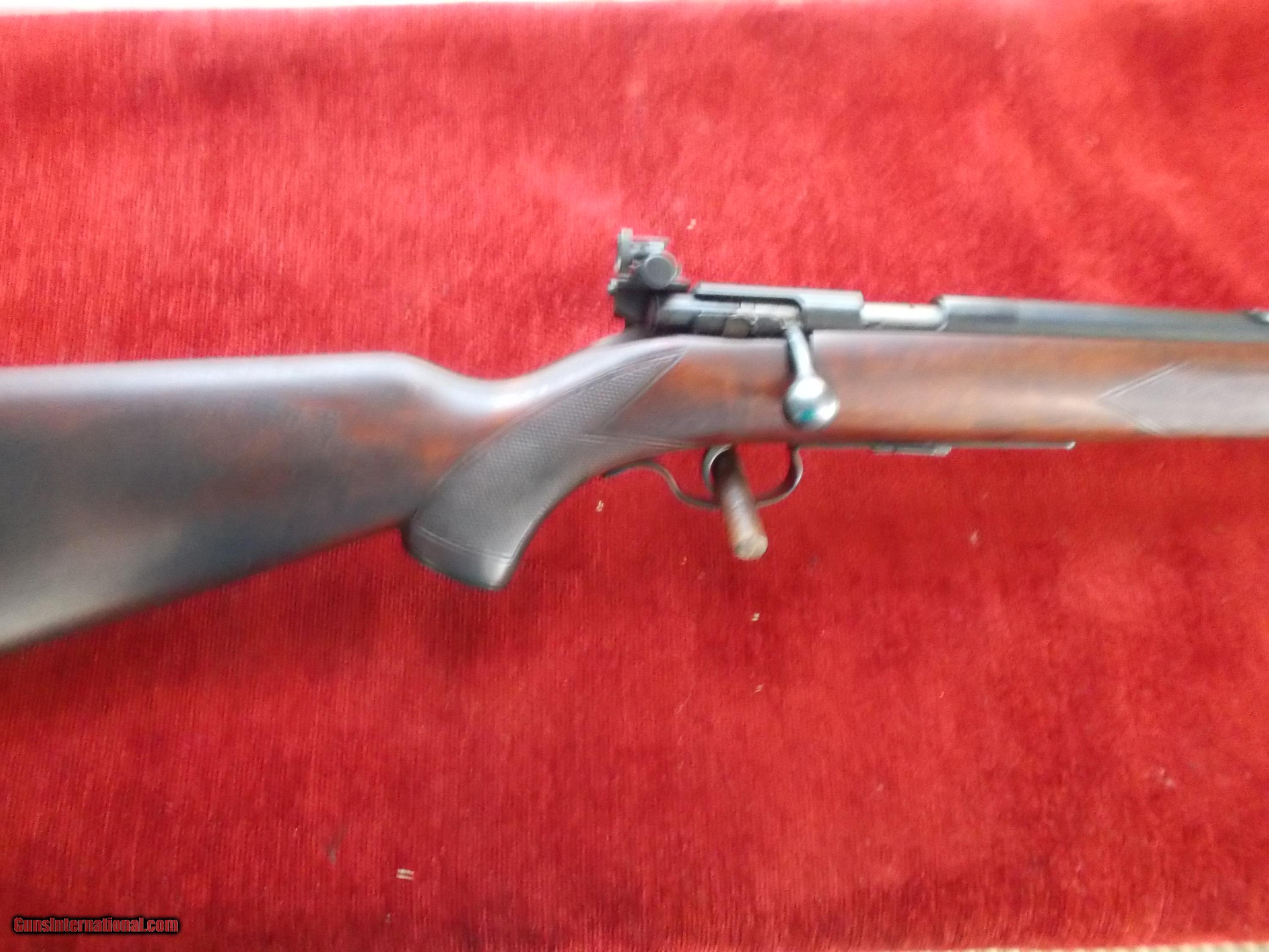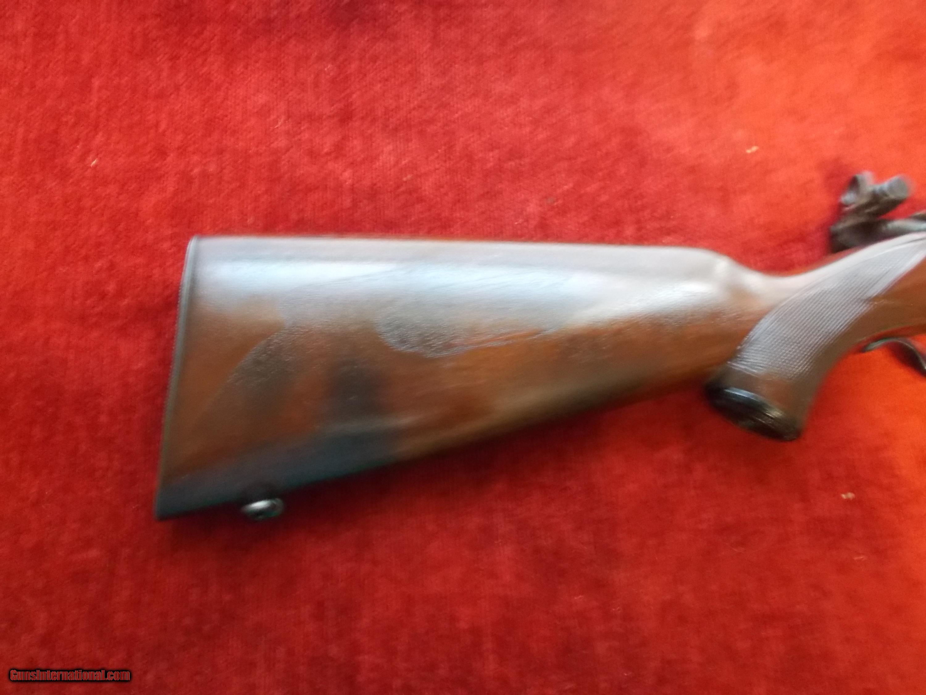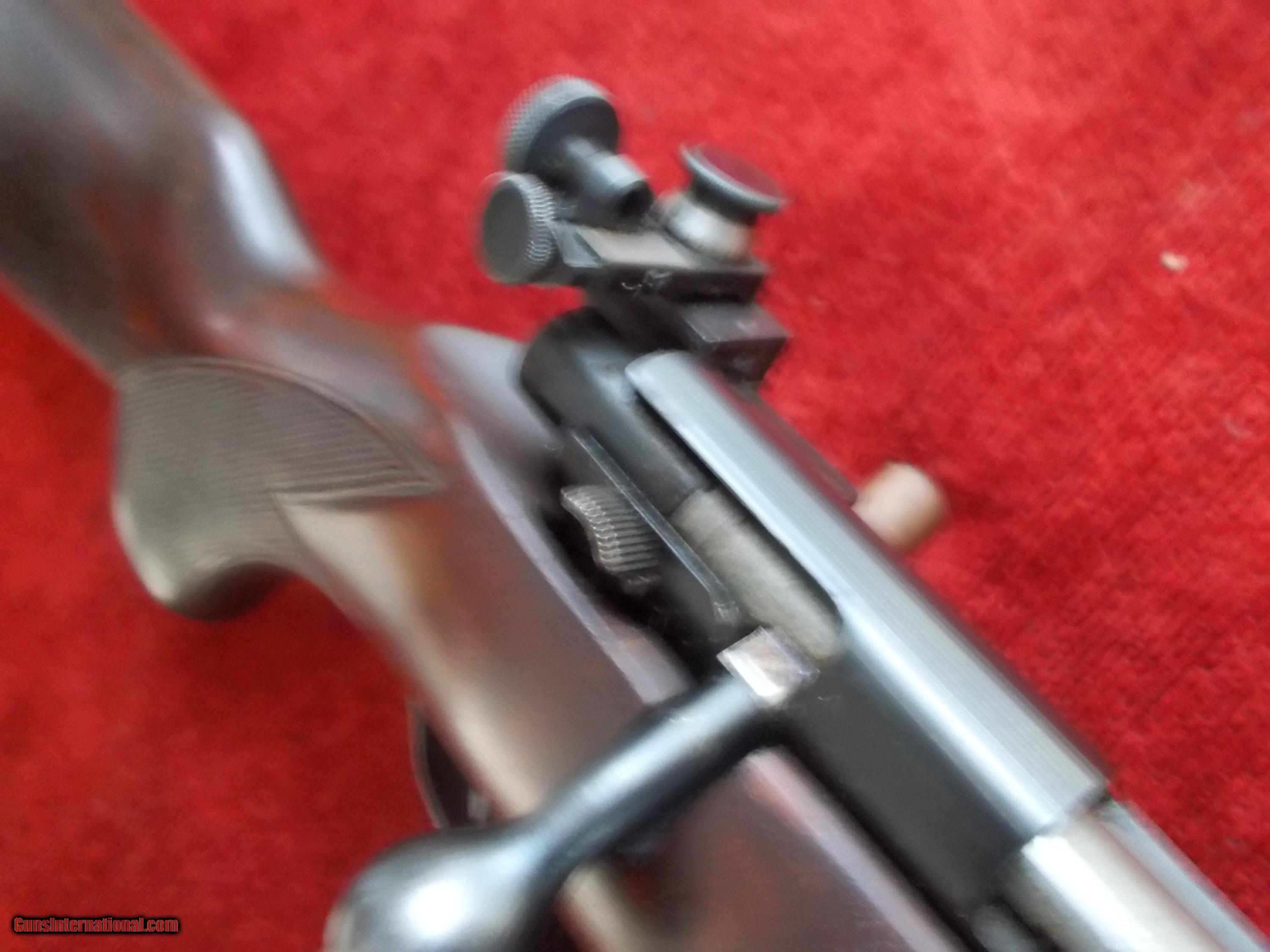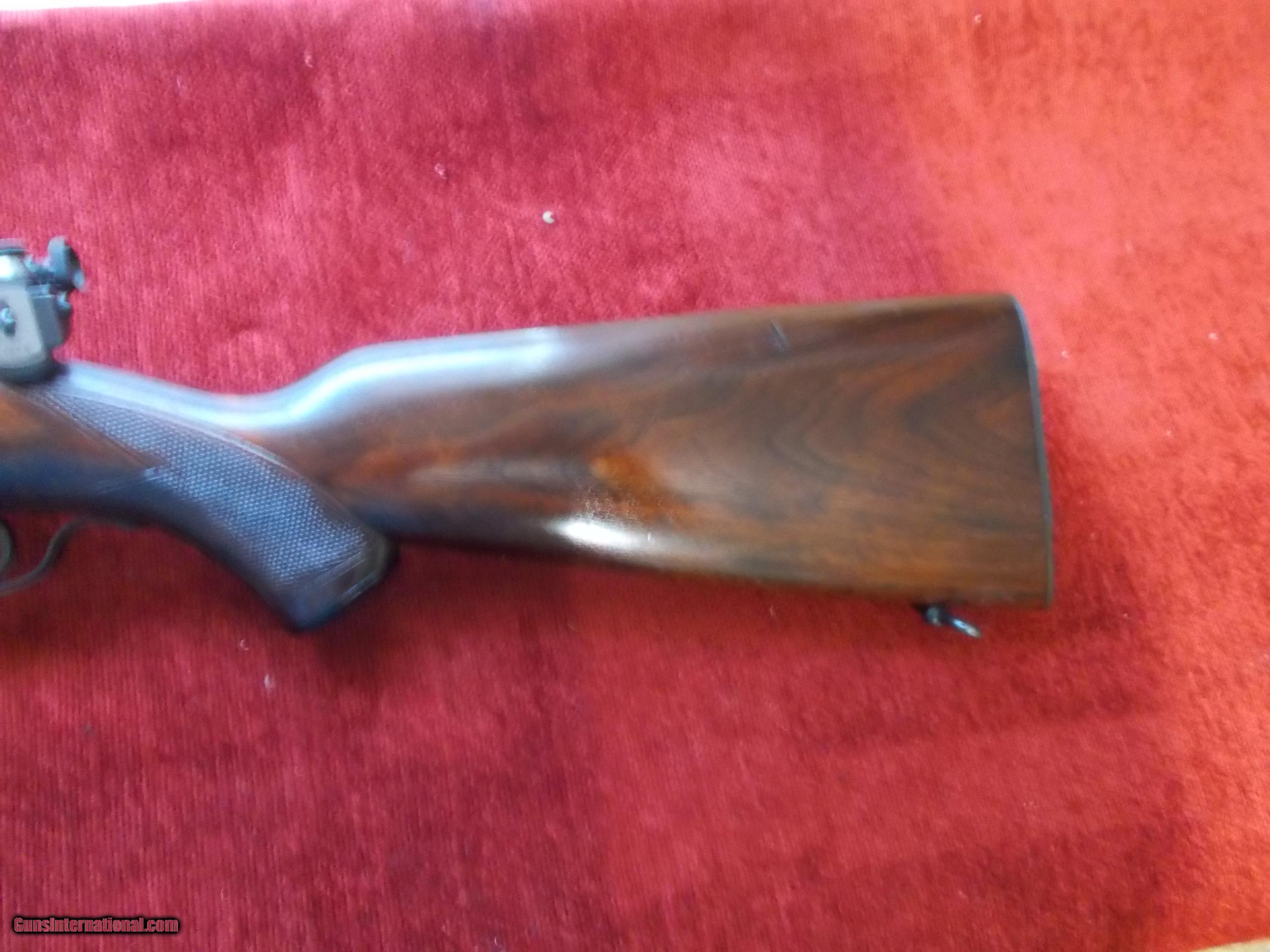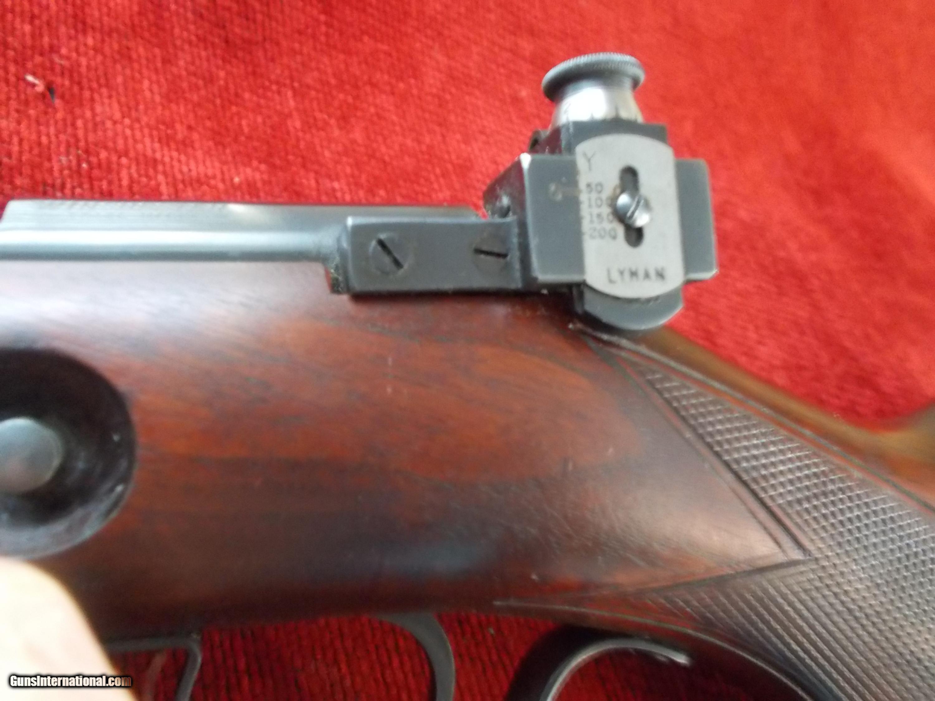 Description: 24" tapered bbl., front blade hood, 5 shot factory detatch mag., period correct Lyman adj. rear peep sight, nicely figured & checkered American walnut, 95% + new ,100% original: SOLD |