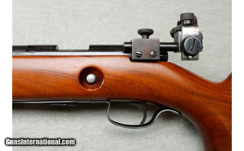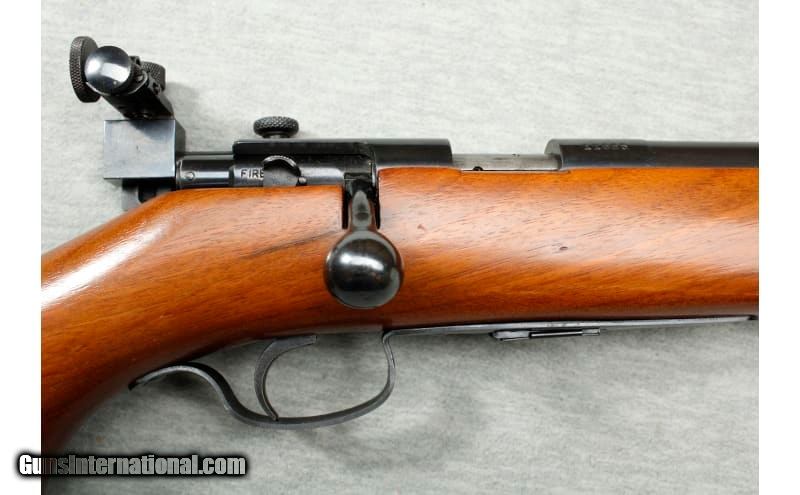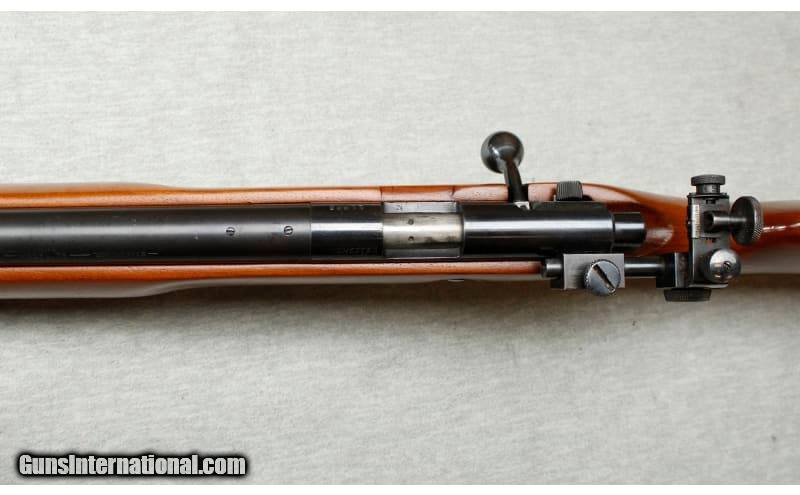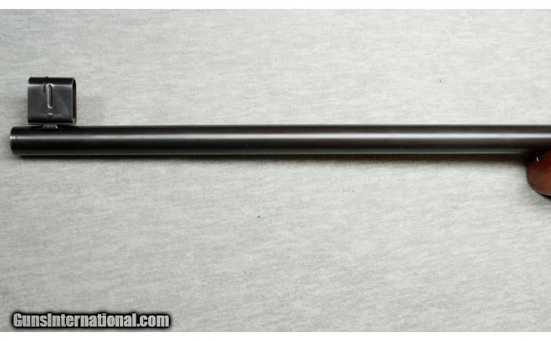 Description: Manufactured in 1941. Very fine with original finish, some light handling marks, and some spotting on the barrel. Wood is excellent with minimal handling marks. Mechanically excellent. .22 Long Rifle SOLD Metal Condition: good Wood Condition: very good Bore Condition: Good - Some light pitting or frosted appearance Barrels: 28" barrel Stock Dimensions: 13.5 Fore End: smooth walnut Butt Pad: metal Weight: 8 lbs Sights: "hooded front sight, rear peep sight Item Location: La Vista, NE |