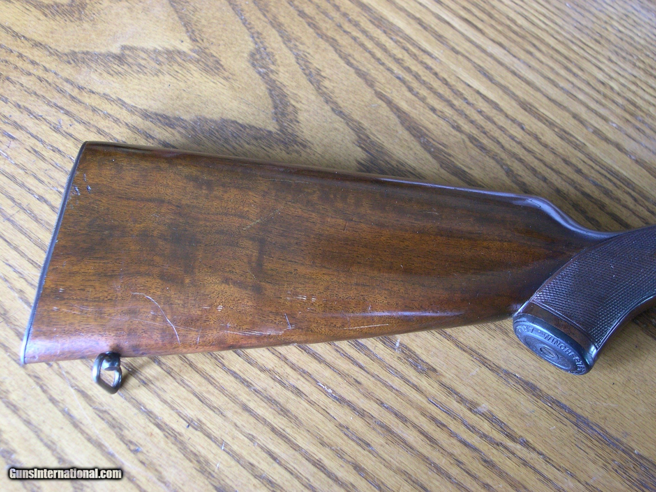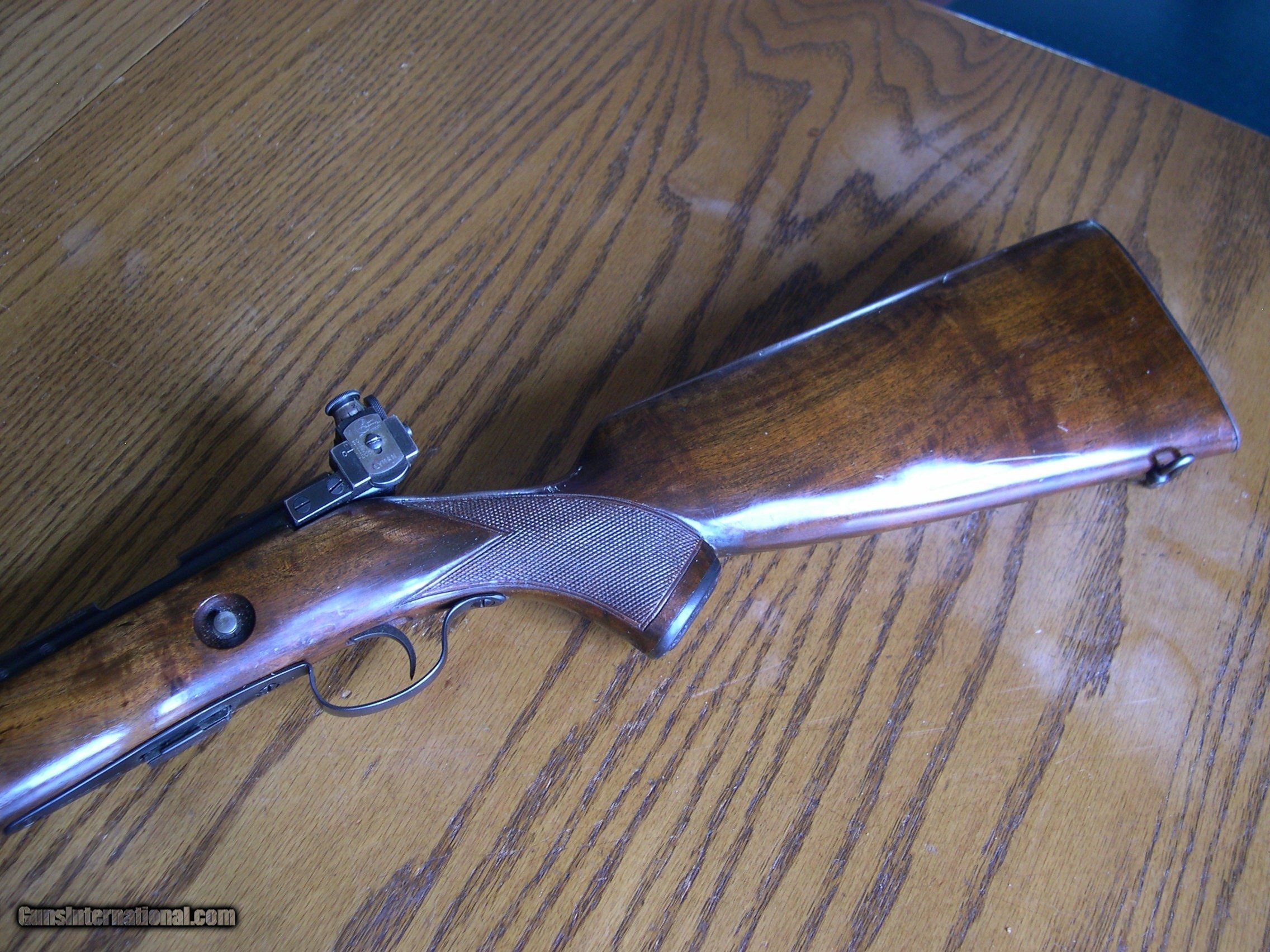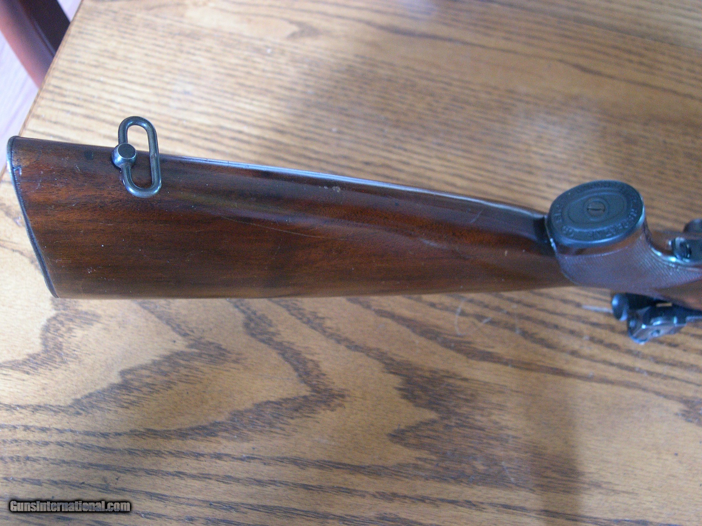 Description: Win model 75 Sporter MFG 1947, with 98% origional Blue , Even the floorplate & trigger guard 98%!Exc Plus Bore, 5 shot original magazine, Checkered steel B.P. Original rear peep sight and Front sight w,hood.Orig sling swivels are present, nice sharp checkering on stock, some minor safe marks in finish ! These are getting hard to find in ths orig. condition !! SOLD |