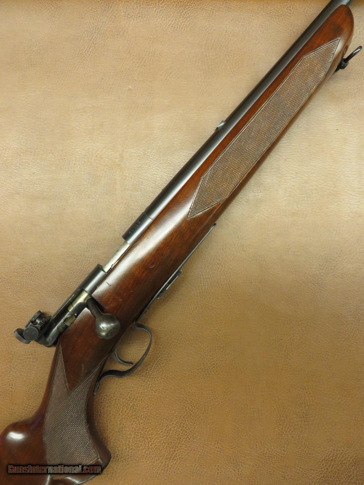 Description: .22 Long Rifle has 23 3/4 inch barrel with original hooded front sight. Lyman receiver peep sight. Serial number 50xxx. Drilled and tapped for scope mounting with 2 holes on barrel and 1 on rear bridge of receiver. Checkered walnut stock has original steel butt plate, pistol grip cap, and sling swivels. One factory 5 round magazine. Blue is 98% and the wood is near 95%. SOLD |
